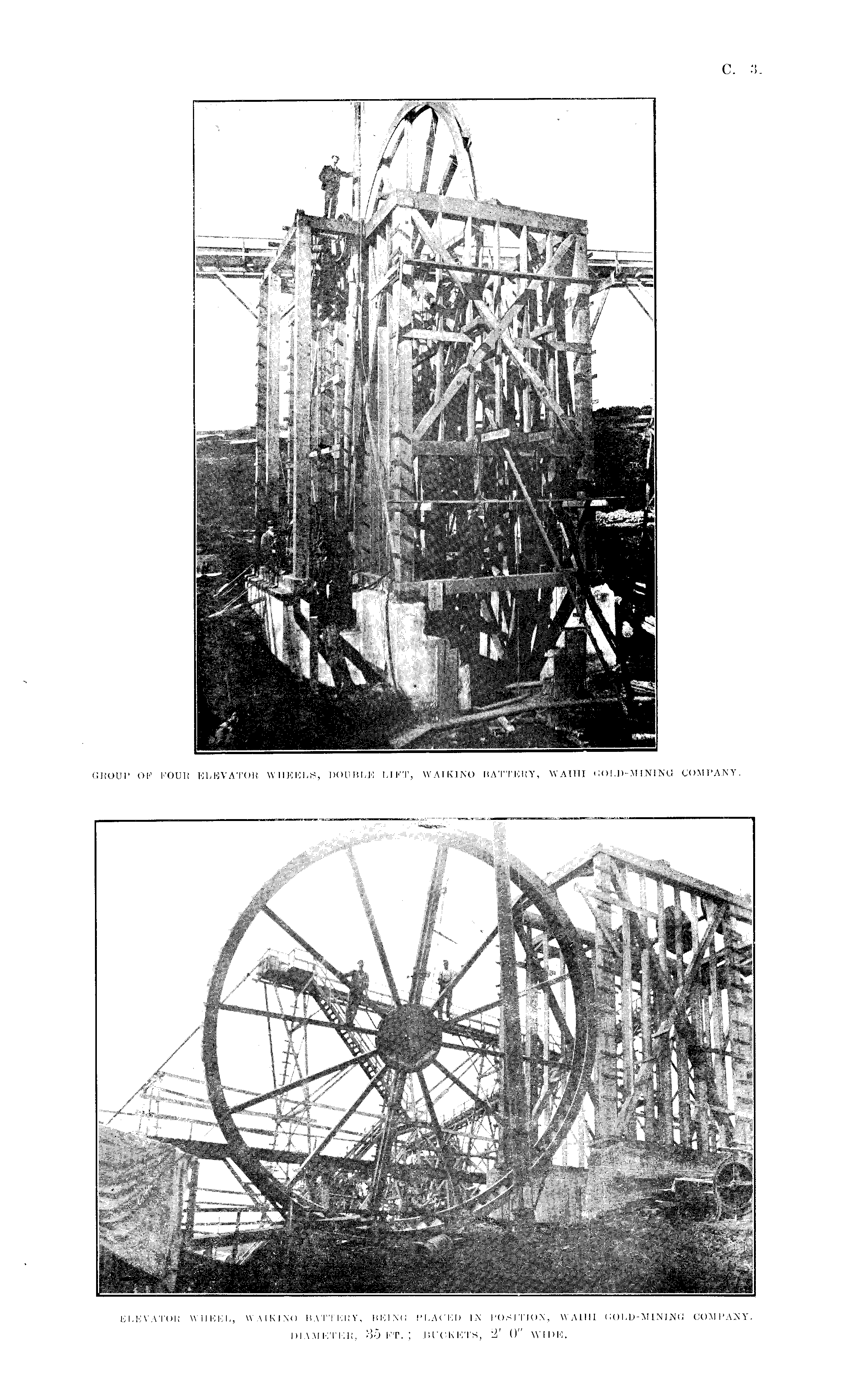 ELEVATOR WHEEL, WAIKINO BATTERY, BEING PLACED IN POSITION, WAIHI GOLD-MINING COMPANY. DIAMETER, 35ft.; BUCKETS, 2' 0" WIDE.