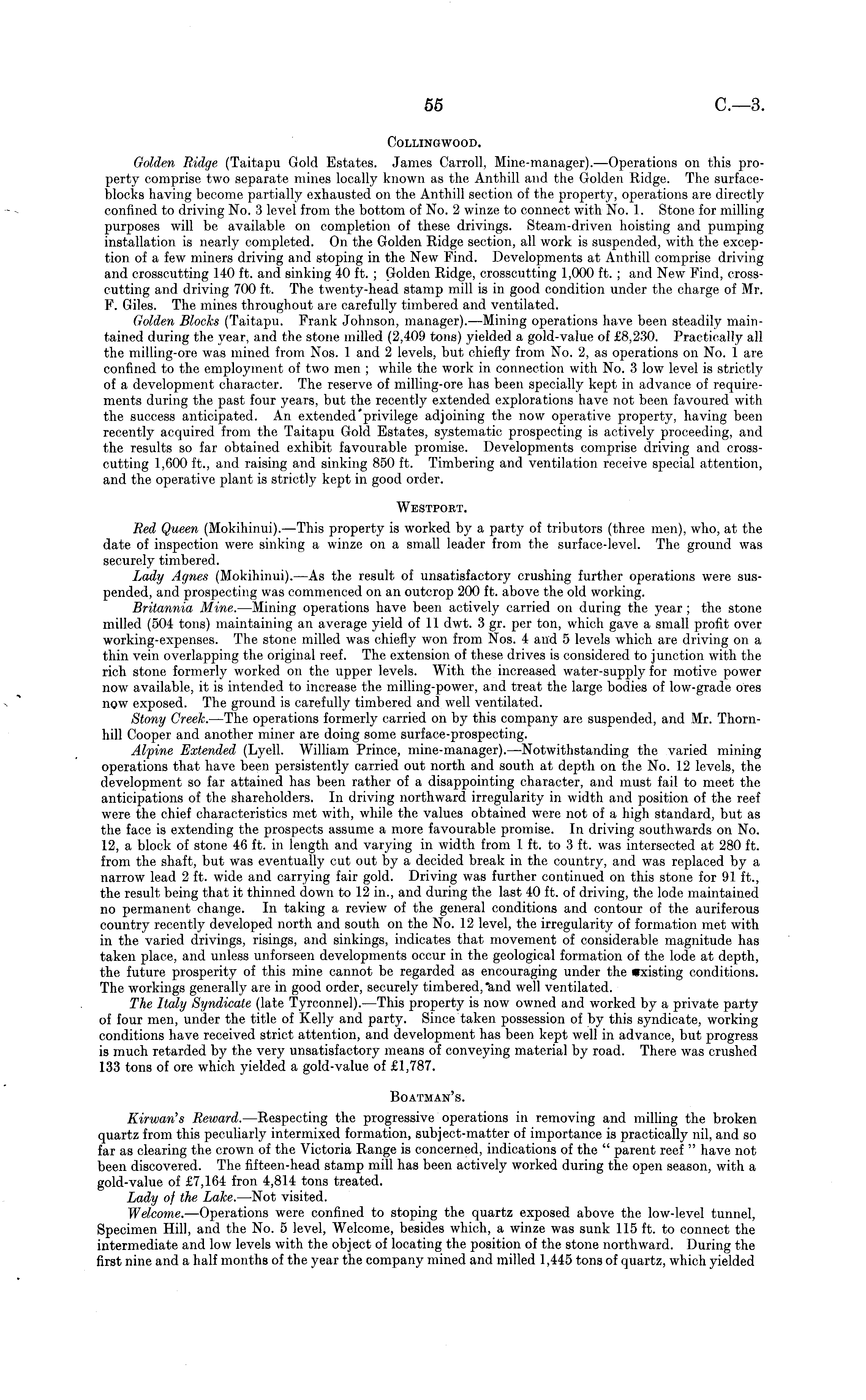 CoLLINGWOOD. Golden Ridge (Taitapu Gold Estates. James Carroll, Mine-manager).—Operations on this property comprise two separate mines locally known as the Anthill and the Golden Ridge. The surfaceblocks having become partially exhausted on the Anthill section of the property, operations are directly confined to driving No. 3 level from the bottom of No. 2 winze to connect with No. 1. Stone for milling purposes will be available on completion of these drivings. Steam-driven hoisting and pumping installation is nearly completed. On the Golden Ridge section, all work is suspended, with the exception of a few miners driving and stoping in the New Find. Developments at Anthill comprise driving and crosscutting 140 ft. and sinking 40 ft. ; Golden Ridge, crosscutting 1,000 ft. ; and New Find, crosscutting and driving 700 ft. The twenty-head stamp mill is in good condition under the charge of Mr. F. Giles. The mines throughout are carefully timbered and ventilated. Golden Blocks (Taitapu. Frank Johnson, manager).—Mining operations have been steadily maintained during the year, and the stone milled (2,409 tons) yielded a gold-value of £8,230. Practically all the milling-ore was mined from Nos. 1 and 2 levels, but chiefly from No. 2, as operations on No. 1 are confined to the employment of two men ; while the work in connection with No. 3 low level is strictly of a development character. The reserve of milling-ore has been specially kept in advance of requirements during the past four years, but the recently extended explorations have not been favoured with the success anticipated. An extended'privilege adjoining the now operative property, having been recently acquired from the Taitapu Gold Estates, systematic prospecting is actively proceeding, and the results so far obtained exhibit favourable promise. Developments comprise driving and crosscutting 1,600 ft., and raising and sinking 850 ft. Timbering and ventilation receive special attention, and the operative plant is strictly kept in good order. Westport. Red Queen (Mokihinui). —This property is worked by a party of tributors (three men), who, at the date of inspection were sinking a winze on a small leader from the surface-level. The ground was securely timbered. Lady Agnes (Mokihinui). —As the result of unsatisfactory crushing further operations were suspended, and prospecting was commenced on an outcrop 200 ft. above the old working. Britannia Mine. —Mining operations have been actively carried on during the year ; the stone milled (504 tons) maintaining an average yield of 11 dwt. 3 gr. per ton, which gave a small profit over working-expenses. The stone milled was chiefly won from Nos. 4 and 5 levels which are driving on a thin vein overlapping the original reef. The extension of these drives is considered to junction with the rich stone formerly worked on the upper levels. With the increased water-supply for motive power now available, it is intended to increase the milling-power, and treat the large bodies of low-grade ores now exposed. The ground is carefully timbered and well ventilated. Stony Creek. —The operations formerly carried on by this company are suspended, and Mr. Thornhill Cooper and another miner are doing some surface-prospecting. Alpine Extended (Lyell. William Prince, mine-manager). —Notwithstanding the varied mining operations that have been persistently carried out north and south at depth on the No. 12 levels, the development so far attained has been rather of a disappointing character, and must fail to meet the anticipations of the shareholders. In driving northward irregularity in width and position of the reef were the chief characteristics met with, while the values obtained were not of a high standard, but as the face is extending the prospects assume a more favourable promise. In driving southwards on No. 12, a block of stone 46 ft. in length and varying in width from 1 ft. to 3 ft. was intersected at 280 ft. from the shaft, but was eventually cut out by a decided break in the country, and was replaced by a narrow lead 2 ft. wide and carrying fair gold. Driving was further continued on this stone for 91 ft., the result being that it thinned down to 12 in., and during the last 40 ft. of driving, the lode maintained no permanent change. In taking a review of the general conditions and contour of the auriferous country recently developed north and south on the No. 12 level, the irregularity of formation met with in the varied drivings, risings, and sinkings, indicates that movement of considerable magnitude has taken place, and unless unforseen developments occur in the geological formation of the lode at depth, the future prosperity of this mine cannot be regarded as encouraging under the existing conditions. The workings generally are in good order, securely timbered, "and well ventilated. The Italy Syndicate (late Tyrconnel). —This property is now owned and worked by a private party of four men, under the title of Kelly and party. Since taken possession of by this syndicate, working conditions have received strict attention, and development has been kept well in advance, but progress is much retarded by the very unsatisfactory means of conveying material by road. There was crushed 133 tons of ore which yielded a gold-value of £1,787. Boatman's. Kirwan's Reward. —Respecting the progressive operations in removing and milling the broken quartz from this peculiarly intermixed formation, subject-matter of importance is practically nil, and so far as clearing the crown of the Victoria Range is concerned, indications of the " parent reef " have not been discovered. The fifteen-head stamp mill has been actively worked during the open season, with a gold-value of £7,164 fron 4,814 tons treated. Lady of the Lake. —Not visited. Welcome. —Operations were confined to stoping the quartz exposed above the low-level tunnel, Specimen Hill, and the No. 5 level, Welcome, besides which, a winze was sunk 1