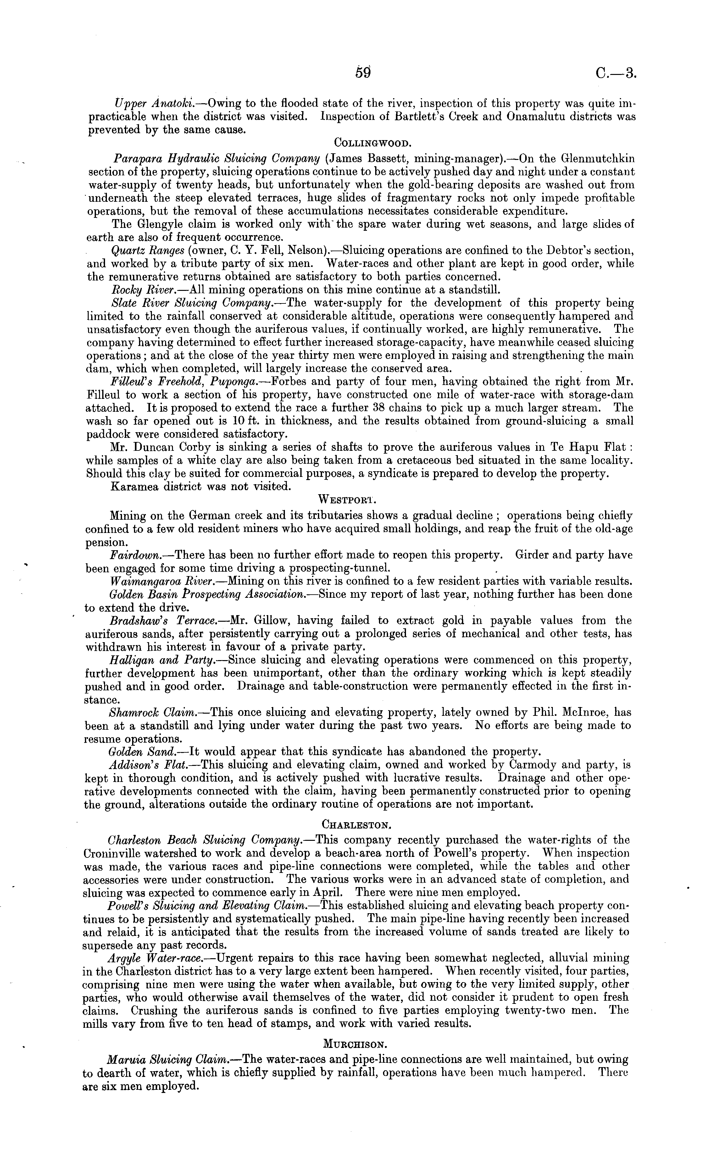 Upper Anatoki. —Owing to the flooded state of the river, inspection of this property was quite impracticable when the district was visited. Inspection of Bartlett's Creek and Onamalutu districts was prevented by the same cause. CoLLINGWOOD. Parapara Hydraulic Sluicing Company (James Bassett, mining-manager).—On the Glenmutchkin section of the property, sluicing operations continue to be actively pushed day and night under a constant water-supply of twenty heads, but unfortunately when the gold-bearing deposits are washed out from underneath the steep elevated terraces, huge slides of fragmentary rocks not only impede profitable operations, but the removal of these accumulations necessitates considerable expenditure. The Glengyle claim is worked only with' the spare water during wet seasons, and large slides of earth are also of frequent occurrence. Quartz Ranges (owner, C. Y. Pell, Nelson). —Sluicing operations are confined to the Debtor's section, and worked by a tribute party of six men. Water-races and other plant are kept in good order, while the remunerative returns obtained are satisfactory to both parties concerned. Rocky River. —All mining operations on this mine continue at a standstill. Slate River Sluicing Company. —The water-supply for the development of this property being limited to the rainfall conserved at considerable altitude, operations were consequently hampered and unsatisfactory even though the auriferous values, if continually worked, are highly remunerative. The company having determined to effect further increased storage-capacity, have meanwhile ceased sluicing operations ; and at the close of the year thirty men were employed in raising and strengthening the main dam, which when completed, will largely increase the conserved area. FilleuVs Freehold, Puponga. —Forbes and party of four men, having obtained the right from Mr. Pilleul to work a section of his property, have constructed one mile of water-race with storage-dam attached. It is proposed to extend the race a further 38 chains to pick up a much larger stream. The wash so far opened out is 10 ft. in thickness, and the results obtained from ground-sluicing a small paddock were considered satisfactory. Mr. Duncan Corby is sinking a series of shafts to prove the auriferous values in Te Hapu Flat : while samples of a white clay are also being taken from a cretaceous bed situated in the same locality. Should this clay be suited for commercial purposes, a syndicate is prepared to develop the property. Karamea district was not visited. Westpoei. Mining on the German creek and its tributaries shows a gradual decline ; operations being chiefly confined to a few old resident miners who have acquired small holdings, and reap the fruit of the old-age pension. Fairdown. —There has been no further effort made to reopen this property. Girder and party have been engaged for some time driving a prospecting-tunnel. Waimangaroa River. —Mining on this river is confined to a few resident parties with variable results. Golden Basin Prospecting Association. —Since my report of last year, nothing further has been done to extend the drive. Bradshaw's Terrace. —Mr. Gillow, having failed to extract gold in payable values from the auriferous sands, after persistently carrying out a prolonged series of mechanical and other tests, has withdrawn his interest in favour of a private party. Halligan and Party. —Since sluicing and elevating operations were commenced on this property, further development has been unimportant, other than the ordinary working which is kept steadily pushed and in good order. Drainage and table-construction were permanently effected in the first instance. Shamrock Claim. —This once sluicing and elevating property, lately owned by Phil. Mclnroe, has been at a standstill and lying under water during the past two years. No efforts are being made to resume operations. Golden Sand. —It would appear that this syndicate has abandoned the property. Addison's Flat. —This sluicing and elevating claim, owned and worked by Carmody and party, is kept in thorough condition, and is actively pushed with lucrative results. Drainage and other operative developments connected with the claim, having been permanently constructed prior to opening the ground, alterations outside the ordinary routine of operations are not important. Charleston. Charleston Beach Sluicing Company. —This company recently purchased the water-rights of the Croninville watershed to work and develop a beach-area north of Powell's property. When inspection was made, the various races and pipe-line connections were completed, while the tables and other accessories were under construction. The various works were in an advanced state of completion, and sluicing was expected to commence early in April. There were nine men employed. Powell's Sluicing and Elevating Claim. —This established sluicing and elevating beach property continues to be persistently and systematically pushed. The main pipe-line having recently been increased and relaid, it is anticipated that the results from the increased volume of sands treated are likely to supersede any past records. Argyle Water-race. —Urgent repairs to this race having been somewhat neglected, alluvial mining in the Charleston district has to a very large extent been hampered. When recently visited, four parties, comprising nine men were using the water when available, but owing to the very limited supply, other parties, who would otherwise avail themselves of the water, did not consider it prudent to open fresh claims. Crushing the auriferous sands is confined to five parties employing twenty-two men. The mills vary from five to ten head of stamps, and work with varied results. Murchison. Maruia Sluicing Claim. —The water-races and pipe-line connections are well maintained, but owing to dearth of water, which is chiefly supplied by rainfall, operations have been much hampered. There 