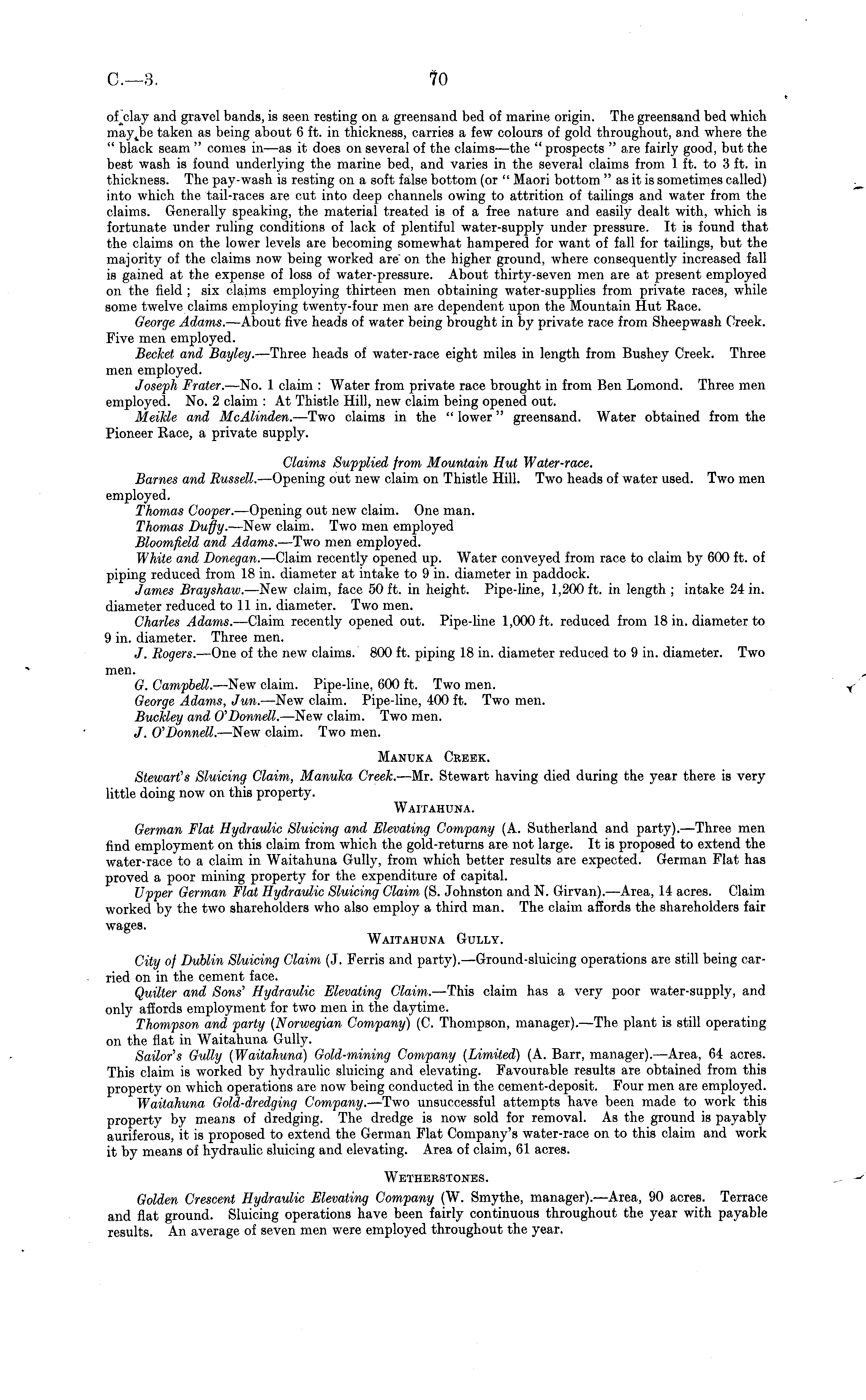 of clay and gravel bands, is seen resting on a greensand bed of marine origin. The greensand bed which mayjDe taken as being about 6 ft. in thickness, carries a few colours of gold throughout, and where the " black seam " comes in—as it does on several of the claims —the " prospects " are fairly good, but the best wash is found underlying the marine bed, and varies in the several claims from 1 ft. to 3 ft. in thickness. The pay-wash is resting on a soft false bottom (or " Maori bottom "asit is sometimes called) into which the tail-races are cut into deep channels owing to attrition of tailings and water from the claims. Generally speaking, the material treated is of a free nature and easily dealt with, which is fortunate under ruling conditions of lack of plentiful water-supply under pressure. It is found that the claims on the lower levels are becoming somewhat hampered for want of fall for tailings, but the majority of the claims now being worked are" on the higher ground, where consequently increased fall is gained at the expense of loss of water-pressure. About thirty-seven men are at present employed on the field ; six claims employing thirteen men obtaining water-supplies from private races, while some twelve claims employing twenty-four men are dependent upon the Mountain Hut Race. George Adams. —About five heads of water being brought in by private race from Sheepwash Creek. Five men employed. Becket and Bayley.—Three heads of water-race eight miles in length from Bushey Creek. Three men employed. Joseph Frater. —No. 1 claim : Water from private race brought in from Ben Lomond. Three men employed. No. 2 claim :At Thistle Hill, new claim being opened out. Meikle and McAlinden. —Two claims in the " lower" greensand. Water obtained from the Pioneer Race, a private supply. Claims Supplied from Mountain Hut Water-race. Barnes and Russell. —Opening out new claim on Thistle Hill. Two heads of water used. Two men employed. Thomas Cooper. —Opening out new claim. One man. Thomas Duffy. —New claim. Two men employed Bloomfield and Adams. —Two men employed. White and Donegan. —Claim recently opened up. Water conveyed from race to claim by 600 ft. of piping reduced from 18 in. diameter at intake to 9 in. diameter in paddock. James Brayshaw. —New claim, face 50 ft. in height. Pipe-line, 1,200 ft. in length ; intake 24 in. diameter reduced to 11 in. diameter. Two men. Charles Adams. —Claim recently opened out. Pipe-line 1,000 ft. reduced from 18 in. diameter to 9 in. diameter. Three men. J. Rogers.—One of the new claims. 800 ft. piping 18 in. diameter reduced to 9 in. diameter. Two men. G. Campbell. —New claim. Pipe-line, 600 ft. Two men. George Adams, Jun. —New claim. Pipe-line, 400 ft. Two men. Buckley and O'Donnell. —New claim. Two men. J. O'Donnell. —New claim. Two men. Manuka Creek. Stewart's Sluicing Claim, Manuka Creek. —Mr. Stewart having died during the year there is very little doing now on this property. Waitahuna. German Flat Hydraulic Sluicing and Elevating Company (A. Sutherland and party). —Three men find employment on this claim from which the gold-returns are not large. It is proposed to extend the water-race to a claim in Waitahuna Gully, from which better results are expected. German Flat has proved a poor mining property for the expenditure of capital. Upper German Flat Hydraulic Sluicing Claim (S. Johnston and N. Girvan). —Area, 14 acres. Claim worked by the two shareholders who also employ a third man. The claim affords the shareholders fair wages. Waitahuna Gully. City of Dublin Sluicing Claim (J. Ferris and party).—Ground-sluicing operations are still being carried on in the cement face. Quilter and Sons , Hydraulic Elevating Claim. —This claim has a very poor water-supply, and only affords employment for two men in the daytime. Thompson and party (Norwegian Company) (C. Thompson, manager).—The plant is still operating on the flat in Waitahuna Gully. Sailor's Gully (Waitahuna) Gold-mining Company (Limited) (A. Barr, manager). —Area, 64 acres. This claim is worked by hydraulic sluicing and elevating. Favourable results are obtained from this property on which operations are now being conducted in the cement-deposit. Four men are employed. Waitahuna Gold-dredging Company. —Two unsuccessful attempts have been made to work this property by means of dredging. The dredge is now sold for removal. As the ground is payably auriferous, it is proposed to extend the German Flat Company's water-race on to this claim and work it by means of hydraulic sluicing and elevating. Area of claim, 61 acres. Wetherstones. Golden Crescent Hydraulic Elevating Company (W. Smythe, manager). —Area, 90 acres. Terrace and flat ground. Sluicing operations have been fairly continuous throughout the year with payable results. An average of seven men were employed throughout the year.
