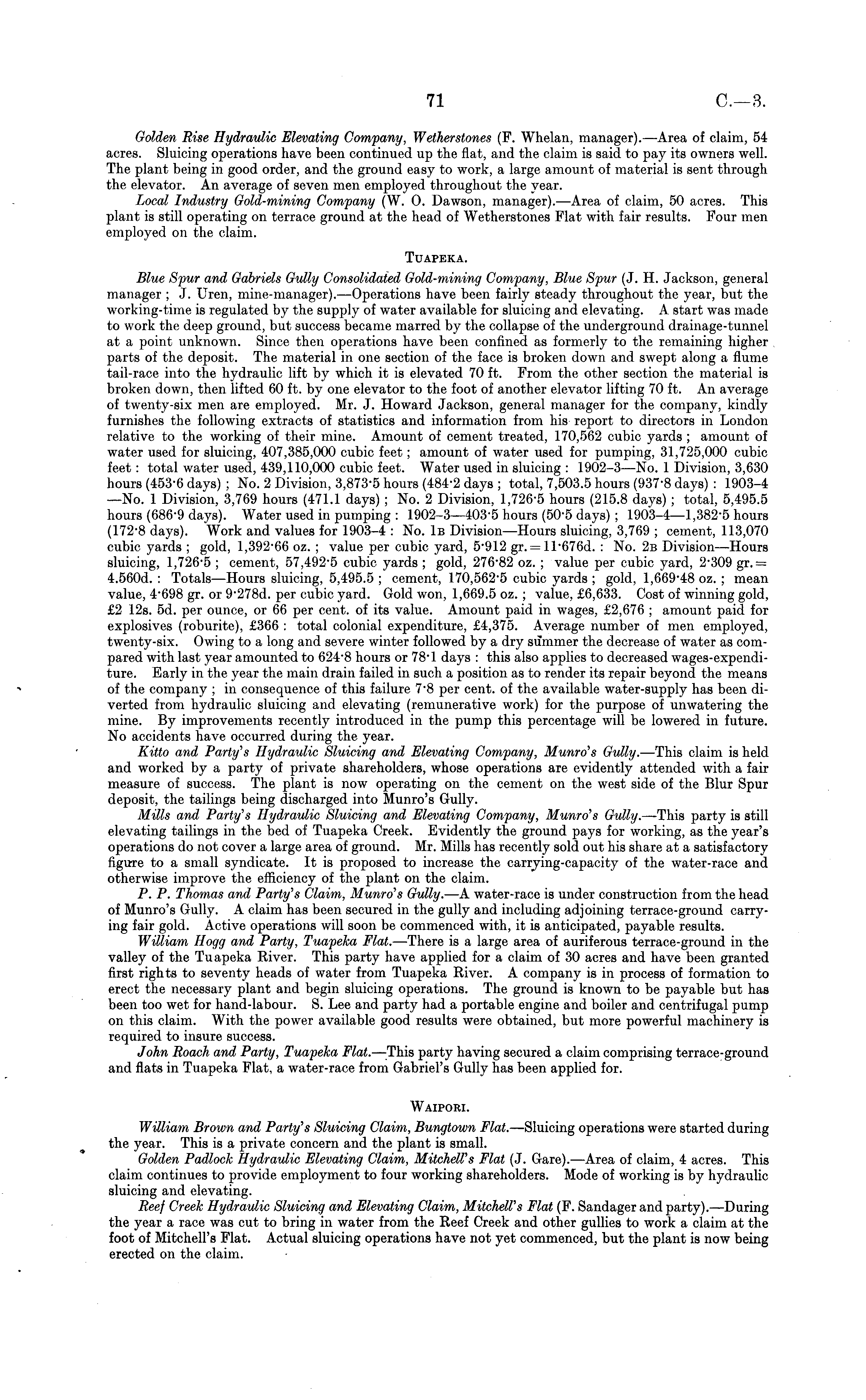 Golden Rise Hydraulic Elevating Company, Wetherstones (F. Whelan, manager). —Area of claim, 54 acres. Sluicing operations have been continued up the flat, and the claim is said to pay its owners well. The plant being in good order, and the ground easy to work, a large amount of material is sent through the elevator. An average of seven men employed throughout the year. Local Industry Gold-mining Company (W. 0. Dawson, manager).—Area of claim, 50 acres. This plant is still operating on terrace ground at the head of Wetherstones Plat with fair results. Four men employed on the claim. Tuapeka. Blue Spur and Gabriels Gully Consolidated Gold-mining Company, Blue Spur (J. H. Jackson, general manager ; J. Uren, mine-manager).—Operations have been fairly steady throughout the year, but the working-time is regulated by the supply of water available for sluicing and elevating. A start was made to work the deep ground, but success became marred by the collapse of the underground drainage-tunnel at a point unknown. Since then operations have been confined as formerly to the remaining higher parts of the deposit. The material in one section of the face is broken down and swept along a flume tail-race into the hydraulic lift by which it is elevated 70 ft. From the other section the material is broken down, then lifted 60 ft. by one elevator to the foot of another elevator lifting 70 ft. An average of twenty-six men are employed. Mr. J. Howard Jackson, general manager for the company, kindly furnishes the following extracts of statistics and information from his report to directors in London relative to the working of their mine. Amount of cement treated, 170,562 cubic yards ; amount of water used for sluicing, 407,385,000 cubic feet; amount of water used for pumping, 31,725,000 cubic feet: total water used, 439,110,000 cubic feet. Water used in sluicing : 1902-3—No. 1 Division, 3,630 hours (453-6 days) ; No. 2 Division, 3,873-5 hours (484-2 days ; total, 7,503.5 hours (937-8 days) : 1903-4 —No. 1 Division, 3,769 hours (471.1 days) ; No. 2 Division, 1,726-5 hours (215.8 days); total, 5,495.5 hours (686-9 days). Water used in pumping : 1902-3—403-5 hours (50-5 days) ; 1903-4—1,382-5 hours (172-8 days). Work and values for 1903-4 : No. Iβ Division—Hours sluicing, 3,769 ; cement, 113,070 cubic yards ; gold, 1,392-66 oz. ; value per cubic yard, 5 - 912 gr. = 11 - 676 d. : No. 2b Division —Hours sluicing, 1,726-5 ; cement, 57,492-5 cubic yards ; gold, 276 - 82 oz. ; value per cubic yard, 2-309 gr. = 4.560 d. : Totals —Hours sluicing, 5,495.5 ; cement, 170,562-5 cubic yards ; gold, 1,669 - 48 oz. ; mean value, 4-698 gr. or 9 - 278 d. per cubic yard. Gold won, 1,669.5 oz. ; value, £6,633. Cost of winning gold, £2 12s. sd. per ounce, or 66 per cent, of its value. Amount paid in wages, £2,676 ; amount paid for explosives (roburite), £366 : total colonial expenditure, £4,375. Average number of men employed, twenty-six. Owing to a long and severe winter followed by a dry summer the decrease of water as compared with last year amounted to 624 - 8 hours or 78-1 days : this also applies to decreased wages-expendi-ture. Early in the year the main drain failed in such a position as to render its repair beyond the means of the company ; in consequence of this failure 7'B per cent, of the available water-supply has been diverted from hydraulic sluicing and elevating (remunerative work) for the purpose of unwatering the mine. By improvements recently introduced in the pump this percentage will be lowered in future. No accidents have occurred during the year. Kitto and Party's Hydraulic Sluicing and Elevating Company, Munro's Gully. —This claim is held and worked by a party of private shareholders, whose operations are evidently attended with a fair measure of success. The plant is now operating on the cement on the west side of the Blur Spur deposit, the tailings being discharged into Munro's Gully. Mills and Party's Hydraulic Sluicing and Elevating Company, Munro's Gully. —This party is still elevating tailings in the bed of Tuapeka Creek. Evidently the ground pays for working, as the year's operations do not cover a large area of ground. Mr. Mills has recently sold out his share at a satisfactory figure to a small syndicate. It is proposed to increase the carrying-capacity of the water-race and otherwise improve the efficiency of the plant on the claim. P. P. Thomas and Party's Claim, Munro's Gully. —A water-race is under construction from the head of Munro's Gully. A claim has been secured in the gully and including adjoining terrace-ground carrying fair gold. Active operations will soon be commenced with, it is anticipated, payable results. William Hogg and Party, Tuapeka Flat. —There is a large area of auriferous terrace-ground in the valley of the Tuapeka River. This party have applied for a claim of 30 acres and have been granted first rights to seventy heads of water from Tuapeka River. A company is in process of formation to erect the necessary plant and begin sluicing operations. The ground is known to be payable but has been too wet for hand-labour. S. Lee and party had a portable engine and boiler and centrifugal pump on this claim. With the power available good results were obtained, but more powerful machinery is required to insure success. John Roach and Party, Tuapeka Flat. —This party having secured a claim comprising terrace-ground and flats in Tuapeka Flat, a water-race from Gabriel's Gully has been applied for. Waipori. William Brown and Party's Sluicing Claim, Bungtown Flat.— Sluicing operations were started during the year. This is a private concern and the plant is small. Golden Padlock Hydraulic Elevating Claim, Mitchell's Flat (J. Gare). —Area of claim, 4 acres. This claim continues to provide employment to four working shareholders. Mode of working is by hydraulic sluicing and elevating. Reef Creek Hydraulic Sluicing and Elevating Claim, Mitchell's Flat (F
