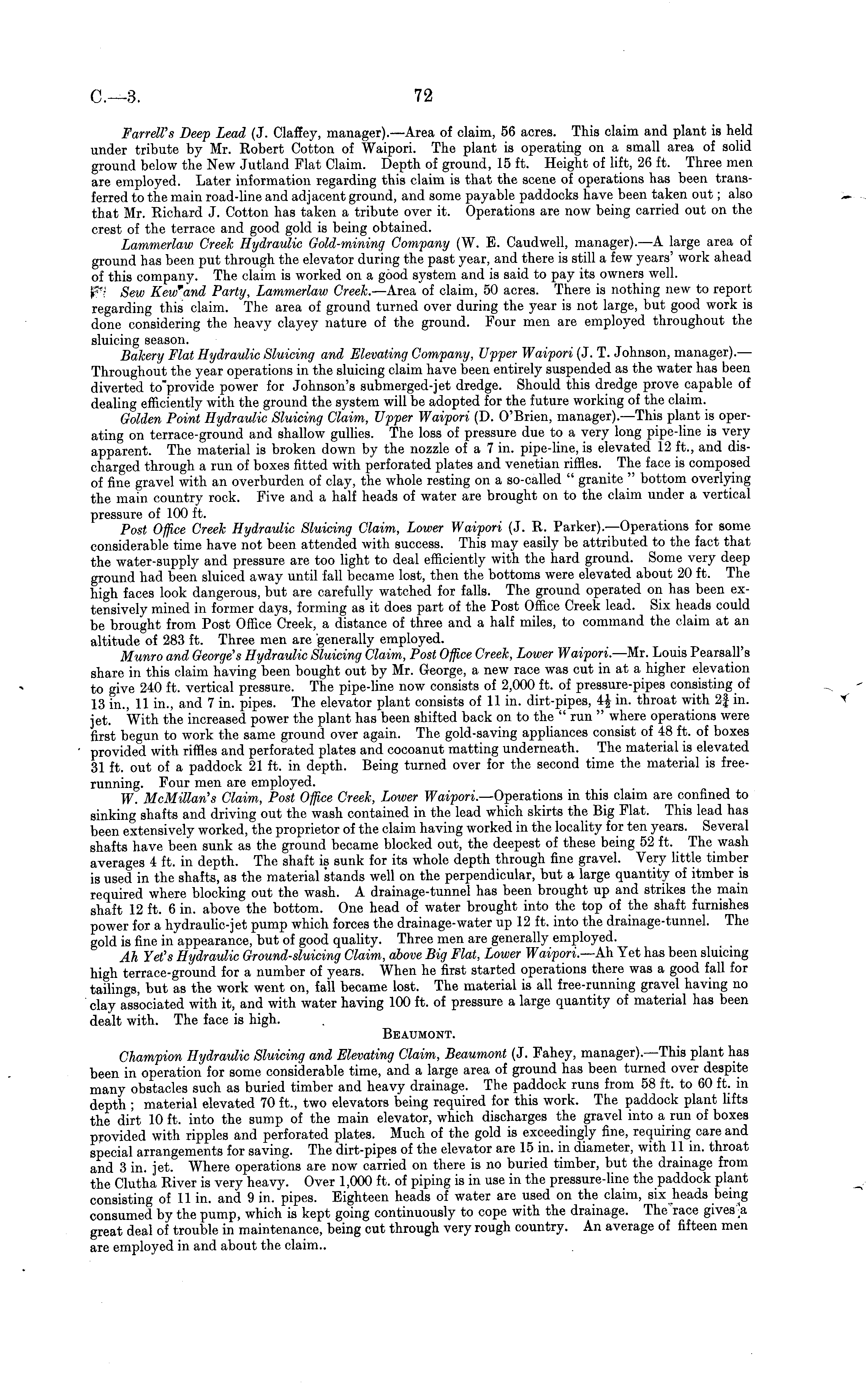 FarreWs Deep Lead (J. Claffey, manager). —Area of claim, 56 acres. This claim and plant is held under tribute by Mr. Robert Cotton of Waipori. The plant is operating on a small area of solid ground below the New Jutland Flat Claim. Depth of ground, 15 ft. Height of lift, 26 ft. Three men are employed. Later information regarding this claim is that the scene of operations has been transferred to the main road-line and adjacent ground, and some payable paddocks have been taken out; also that Mr. Richard J. Cotton has taken a tribute over it. Operations are now being carried out on the crest of the terrace and good gold is being obtained. Lammerlaw Creek Hydraulic Gold-mining Company (W. E. Caudwell, manager).—A large area of ground has been put through the elevator during the past year, and there is still a few years' work ahead of this company. The claim is worked on a good system and is said to pay its owners well. Wi Sew Kew'and Party, Lammerlaw Creek.—Area, of claim, 50 acres. There is nothing new to report regarding this claim. The area of ground turned over during the year is not large, but good work is done considering the heavy clayey nature of the ground. Four men are employed throughout the sluicing season. Bakery Flat Hydraulic Sluicing and Elevating Company, Upper Waipori (J. T. Johnson, manager).— Throughout the year operations in the sluicing claim have been entirely suspended as the water has been diverted to'provide power for Johnson's submerged-jet dredge. Should this dredge prove capable of dealing efficiently with the ground the system will be adopted for the future working of the claim. Golden Point Hydraulic Sluicing Claim, Upper Waipori (D. O'Brien, manager).—This plant is operating on terrace-ground and shallow gullies. The loss of pressure due to a very long pipe-line is very apparent. The material is broken down by the nozzle of a 7 in. pipe-line, is elevated 12 ft., and discharged through a run of boxes fitted with perforated plates and Venetian riffles. The face is composed of fine gravel with an overburden of clay, the whole resting on a so-called " granite " bottom overlying the main country rock. Five and a half heads of water are brought on to the claim under a vertical pressure of 100 ft. Post Office Creek Hydraulic Sluicing Claim, Lower Waipori (J. R. Parker).—Operations for some considerable time have not been attended with success. This may easily be attributed to the fact that the water-supply and pressure are too light to deal efficiently with the hard ground. Some very deep ground had been sluiced away until fall became lost, then the bottoms were elevated about 20 ft. The high faces look dangerous, but are carefully watched for falls. The ground operated on has been extensively mined in former days, forming as it does part of the Post Office Creek lead. Six heads could be brought from Post Office Creek, a distance of three and a half miles, to command the claim at an altitude of 283 ft. Three men are generally employed. Munro and George's Hydraulic Sluicing Claim, Post Office Creek, Lower Waipori.— -Mr. Louis Pearsall's share in this claim having been bought out by Mr. George, a new race was cut in at a higher elevation to give 240 ft. vertical pressure. The pipe-line now consists of 2,000 ft. of pressure-pipes consisting of 13 in., 11 in., and 7 in. pipes. The elevator plant consists of 11 in. dirt-pipes, 4| in. throat with 2} in. jet. With the increased power the plant has been shifted back on to the " run " where operations were first begun to work the same ground over again. The gold-saving appliances consist of 48 ft. of boxes provided with riffles and perforated plates and cocoanut matting underneath. The material is elevated 31 ft. out of a paddock 21 ft. in depth. Being turned over for the second time the material is freerunning. Four men are employed. W. McMillan's Claim, Post Office Creek, Lower Waipori.— Operations in this claim are confined to sinking shafts and driving out the wash contained in the lead which skirts the Big Flat. This lead has been extensively worked, the proprietor of the claim having worked in the locality for ten years. Several shafts have been sunk as the ground became blocked out, the deepest of these being 52 ft. The wash averages 4 ft. in depth. The shaft is sunk for its whole depth through fine gravel. Very little timber is used in the shafts, as the material stands well on the perpendicular, but a large quantity of itmber is required where blocking out the wash. A drainage-tunnel has been brought up and strikes the main shaft 12 ft. 6 in. above the bottom. One head of water brought into the top of the shaft furnishes power for a hydraulic-jet pump which forces the drainage-water up 12 ft. into the drainage-tunnel. The gold is fine in appearance, but of good quality. Three men are generally employed. Ah Yet's Hydraulic Ground-sluicing Claim, above Big Flat, Lower Waipori.— Ah Yet has been sluicing high terrace-ground for a number of years. When he first started operations there was a good fall for tailings, but as the work went on, fall became lost. The material is all free-running gravel having no clay associated with it, and with water having 100 ft. of pressure a large quantity of material has been dealt with. The face is high. Beaumont. Champion Hydraulic Sluicing and Elevating Claim, Beaumont (J. Fahey, manager).—This plant has been in operation for some considerable time, and a large area of ground has been turned over despite many obstacles such as buried timber and heavy drainage. The paddock runs from 58 ft. to 60 ft. in depth ; material elevated 70 ft., two elevators being required for this work. The paddock plant lifts the dirt 10 ft. into the sump of the main elevator, which discharges the gravel into a run of boxes provided with ripples and perforated plates. Much of the gold is exceedingly fine, requiring care and special arrangements for saving. The dirt-pipes of the elevator are