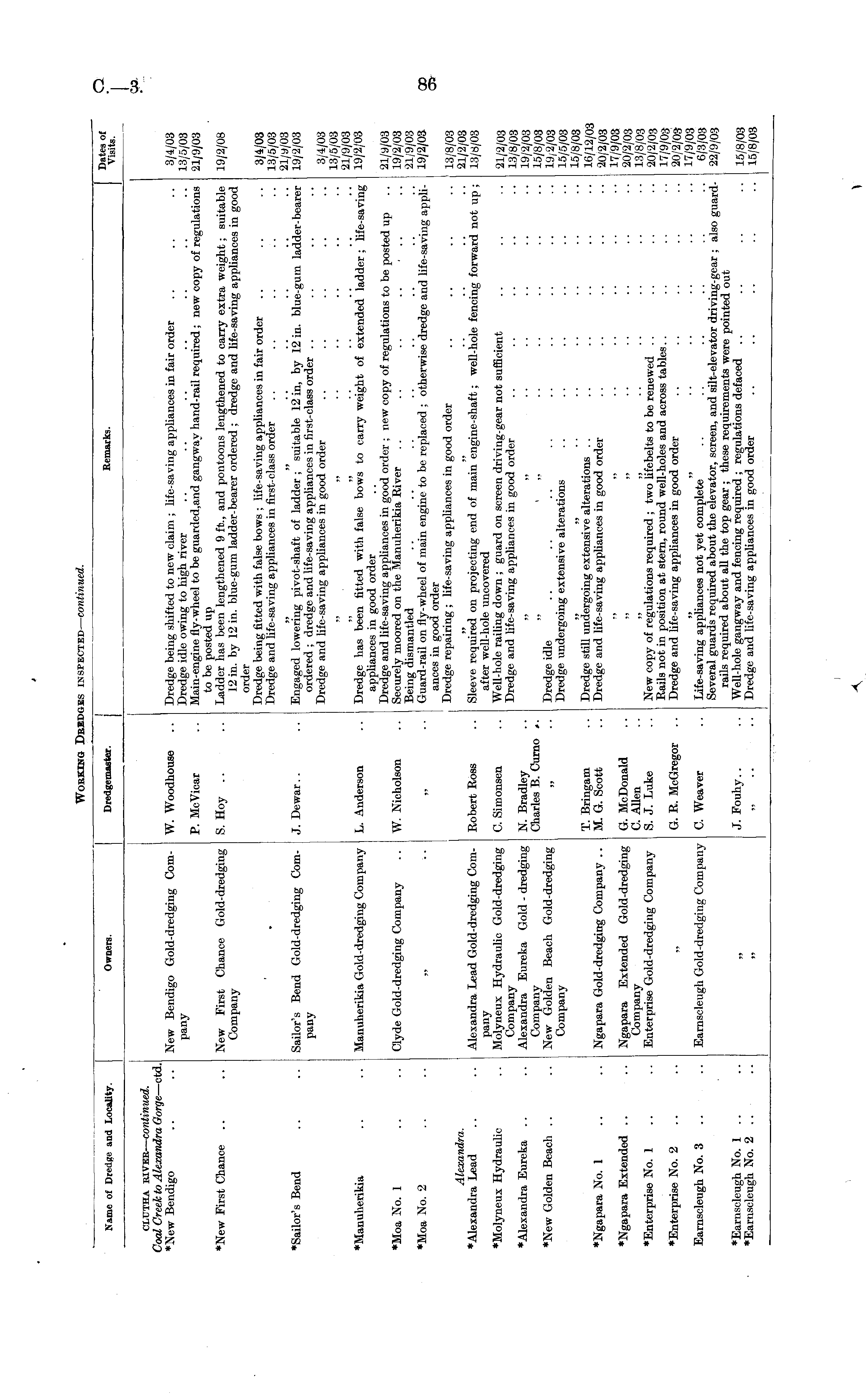 Name of Dredge and Locality. Owners. Dredgemaster. Remarks. Dates of Visits. clutha river — continued. Coal Creek to Alexandra Gorge —ctd. ♦New Bendigo New Bendigo Gold-dredging ComW. Woodhouse Dredge being shifted to new claim ; life-saving appliances in fair order Dredge idle owing to high river Main-engine fly-wheel to be guarded,and gangway hand-rail required ; new copy of regulations to be posted up Ladder has been lengthened 9 ft., and pontoons lengthened to carry extra weight; suitable 12 in. by 12 in. blue-gum ladder-bearer ordered ; dredge and life-saving appliances in good order Dredge being fitted with false bows ; life-saving appliances in fair order Dredge and life-saving appliances in first-class order 3/4/03 13/5/03 21/9/03 pany P. McVicar ♦New First Chance New First Chance Gold-dredging Company S. Hoy 19/2/08 ♦Sailor's Bend J. Dewar 3/4/03 13/5/03 21/a/03 19/2/03 Sailor's Bend Gold-dredging ComEngaged lowering pivot-shaft of ladder ; suitable 12 in, by 12 in. blue-gum ladder-bearer ordered ; dredge and life-saving appliances in first-class order Dredge and life-saving appliances in good order pany 3/4/03 13/5/03 21/9/03 19/2/03 ♦Manuherikia Manuherikia Gold-dredging Company L. Anderson Dredge has been fitted with false bows to carry weight of extended ladder; life-saving appliances in good order Dredge and life-saving appliances in good order ; new copy of regulations to be posted up Securely moored on the Manuherikia River .. .. .. .. ... Being dismantled Guard-rail on fly-wheel of main engine to be replaced ; otherwise dredge and life-saving appliances in good order Dredge repairing ; life-saving appliances in good order ♦Moa No. 1 Clyde Gold-dredging Company W. Nicholson 21/y/03 19/2/03 21/9/03 19/2/03 ♦Moa No. 2 Alexandra. ♦Alexandra Lead Alexandra Lead Gold-dredging ComRobert Ross Sleeve required on projecting end of main engine-shaft; well-hole fencing forward not up ; after well-hole uncovered Well-hole railing down ; guard on screen driving-gear not sufficient Dredge and fife-saving appliances in good order 13/8/03 21/2/03 13/8/03 ♦Molyneux Hydraulic ♦Alexandra Eureka pany Molyneux Hydraulic Gold-dredging Company Alexandra Eureka Gold - dredging Company New Golden Beach Gold-dredging Company C. Simonsen N. Bradley Charles B. Curno .. 21/2/03 13/8/03 19/2/03 15/8/03 19/2/03 15/5/03 15/8/03 16/12/03 20/2/03 17/9/03 20/2/03 13/8/03 20/2/0.3 17/9/03 20/2/03 17/9/03 6/3/03 22/9/03 ♦New Golden Beach Dredge idle Dredge undergoing extensive alterations ♦Ngapara No. 1 Ngapara Gold-dredging Company .. T. Bringam M. G. Scott Dredge still undergoing extensive alterations Dredge and life-saving appliances in good order ♦Ngapara Extended Ngapara Extended Gold-dredging Company Enterprise Gold-dredging Company G. McDonald C. Allen S. J. Luke New copy of regulations required ; two lifebelts to be renewed Rails not in position at stern, round well-holes and across tables Dredge and life-saving appliances in good order ♦Enterprise No. 1 ♦Enterprise No. 2 G. R. McGregor .. Earnscleugh No. 3 .. Earnscleugh Gold-dredging Company C. Weaver Life-saving appliances not yet complete Several guards required about the elevator, screen, and silt-elevator driving-gear ; also guardrails required about all the top gear ; these requirements were pointed out Well-hole gangway and fencing required ; regulations defaced Dredge and life-saving appliances in good order ♦Earnscleugh No. 1 .. ♦Earnscleugh No. 2 .. J. Fouhy.. 15/8/03 15/8/03