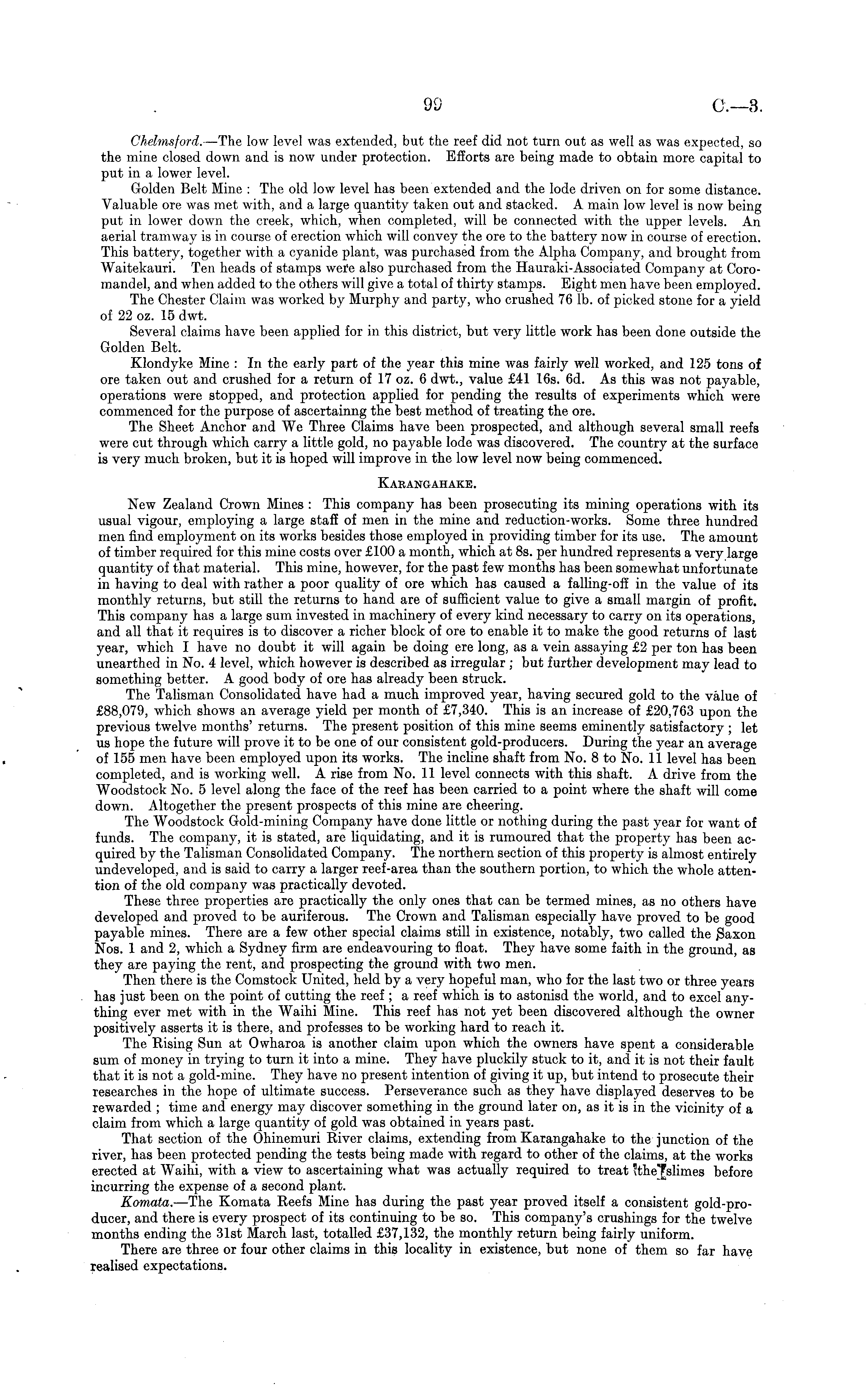 Chelmsford. —The low level was extended, but the reef did not turn out as well as was expected, so the mine closed down and is now under protection. Efforts are being made to obtain more capital to put in a lower level. Golden Belt Mine : The old low level has been extended and the lode driven on for some distance. Valuable ore was met with, and a large quantity taken out and stacked. A main low level is now being put in lower down the creek, which, when completed, will be connected with the upper levels. An aerial tramway is in course of erection which will convey the ore to the battery now in course of erection. This battery, together with a cyanide plant, was purchased from the Alpha Company, and brought from Waitekauri. Ten heads of stamps were also purchased from the Hauraki-Associated Company at Coromandel, and when added to the others will give a total of thirty stamps. Eight men have been employed. The Chester Claim was worked by Murphy and party, who crushed 76 lb. of picked stone for a yield of 22 oz. 15 dwt. Several claims have been applied for in this district, but very little work has been done outside the Golden Belt. Klondyke Mine : In the early part of the year this mine was fairly well worked, and 125 tons of ore taken out and crushed for a return of 17 oz. 6 dwt., value £41 16s. 6d. As this was not payable, operations were stopped, and protection applied for pending the results of experiments which were commenced for the purpose of ascertainng the best method of treating the ore. The Sheet Anchor and We Three Claims have been prospected, and although several small reefs were cut through which carry a little gold, no payable lode was discovered. The country at the surface is very much broken, but it is hoped will improve in the low level now being commenced. Karangahake. New Zealand Crown Mines : This company has been prosecuting its mining operations with its usual vigour, employing a large staff of men in the mine and reduction-works. Some three hundred men find employment on its works besides those employed in providing timber for its use. The amount of timber required for this mine costs over £100 a month, which at Bs. per hundred represents a very large quantity of that material. This mine, however, for the past few months has been somewhat unfortunate in having to deal with rather a poor quality of ore which has caused a falling-off in the value of its monthly returns, but still the returns to hand are of sufficient value to give a small margin of profit. This company has a large sum invested in machinery of every kind necessary to carry on its operations, and all that it requires is to discover a richer block of ore to enable it to make the good returns of last year, which I have no doubt it will again be doing ere long, as a vein assaying £2 per ton has been unearthed in No. 4 level, which however is described as irregular ; but further development may lead to something better. A good body of ore has already been struck. The Talisman Consolidated have had a much improved year, having secured gold to the value of £88,079, which shows an average yield per month of £7,340. This is an increase of £20,763 upon the previous twelve months' returns. The present position of this mine seems eminently satisfactory ; let us hope the future will prove it to be one of our consistent gold-producers. During the year an average of 155 men have been employed upon its works. The incline shaft from No. Bto No. 11 level has been completed, and is working well. A rise from No. 11 level connects with this shaft. A drive from the Woodstock No. 5 level along the face of the reef has been carried to a point where the shaft will come down. Altogether the present prospects of this mine are cheering. The Woodstock Gold-mining Company have done little or nothing during the past year for want of funds. The company, it is stated, are liquidating, and it is rumoured that the property has been acquired by the Talisman Consolidated Company. The northern section of this property is almost entirely undeveloped, and is said to carry a larger reef-area than the southern portion, to which the whole attention of the old company was practically devoted. These three properties are practically the only ones that can be termed mines, as no others have developed and proved to be auriferous. The Crown and Talisman especially have proved to be good payable mines. There are a few other special claims still in existence, notably, two called the j3axon Nos. 1 and 2, which a Sydney firm are endeavouring to float. They have some faith in the ground, as they are paying the rent, and prospecting the ground with two men. Then there is the Comstock United, held by a very hopeful man, who for the last two or three years has just been on the point of cutting the reef ; a reef which is to astonisd the world, and to excel anything ever met with in the Waihi Mine. This reef has not yet been discovered although the owner positively asserts it is there, and professes to be working hard to reach it. The Rising Sun at Owharoa is another claim upon which the owners have spent a considerable sum of money in trying to turn it into a mine. They have pluckily stuck to it, and it is not their fault that it is not a gold-mine. They have no present intention of giving it up, but intend to prosecute their researches in the hope of ultimate success. Perseverance such as they have displayed deserves to be rewarded ; time and energy may discover something in the ground later on, as it is in the vicinity of a claim from which a large quantity of gold was obtained in years past. That section of the Ohinemuri River claims, extending from Karangahake to the junction of the river, has been protected pending the tests being made with regard to other of the claims, at the works erected at Waihi, with a view to ascertaining what was actually required to treat 'theTslimes before incurring the expense of a second plant. Komata. —The Komata