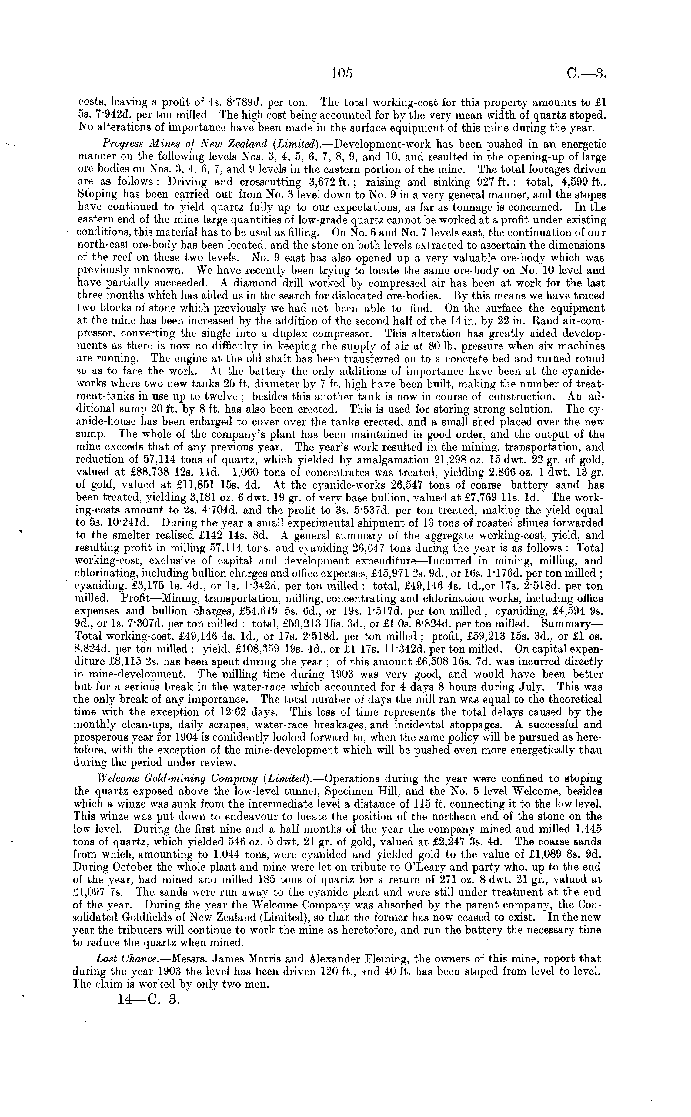 costs, leaving a profit of 4s. S*7B9d. per ton. The total working-cost for this property amounts to £1 ss. 7'942d. per ton milled The high cost being accounted for by the very mean width of quartz stoped. No alterations of importance have been made in the surface equipment of this mine during the year. Progress Mines of New Zealand {Limited). —Development-work has been pushed in an energetic manner on the following levels Nos. 3, 4, 5, 6, 7, 8, 9, and 10, and resulted in the opening-up of large ore-bodies on Nos. 3, 4, 6, 7, and 9 levels in the eastern portion of the mine. The total footages driven are as follows : Driving and crosscutting 3,672 ft. ; raising and sinking 927 ft. : total, 4,599 ft.. Stoping has been carried out faom No. 3 level down to No. 9 in a very general manner, and the stopes have continued to yield quartz fully up to our expectations, as far as tonnage is concerned. In the eastern end of the mine large quantities of low-grade quartz cannot be worked at a profit under existing conditions, this material has to be used as filling. On No. 6 and No. 7 levels east, the continuation of our north-east ore-body has been located, and the stone on both levels extracted to ascertain the dimensions of the reef on these two levels. No. 9 east has also opened up a very valuable ore-body which was previously unknown. We have recently been trying to locate the same ore-body on No. 10 level and have partially succeeded. A diamond drill worked by compressed air has been at work for the last three months which has aided us in the search for dislocated ore-bodies. By this means we have traced two blocks of stone which previously we had not been able to find. On the surface the equipment at the mine has been increased by the addition of the second half of the 14 in. by 22 in. Rand air-com-pressor, converting the single into a duplex compressor. This alteration has greatly aided developments as there is now no difficulty in keeping the supply of air at 80 lb. pressure when six machines are running. The engine at the old shaft has been transferred on to a concrete bed and turned round so as to face the work. At the battery the only additions of importance have been at the cyanideworks where two new tanks 25 ft. diameter by 7 ft. high have been built, making the number of treat-ment-tanks in use up to twelve ; besides this another tank is now in course of construction. An additional sump 20 ft. by 8 ft. has also been erected. This is used for storing strong solution. The cy-anide-house has been enlarged to cover over the tanks erected, and a small shed placed over the new sump. The whole of the company's plant has been maintained in good order, and the output of the mine exceeds that of any previous year. The year's work resulted in the mining, transportation, and reduction of 57,114 tons of quartz, which yielded by amalgamation 21,298 oz. 15 dwt. 22 gr. of gold, valued at £88,738 12s. lid. 1,060 tons of concentrates was treated, yielding 2,866 oz. 1 dwt. 13 gr. of gold, valued at £11,851 15s. 4d. At the cyanide-works 26,547 tons of coarse battery sand has been treated, yielding 3,181 oz. 6 dwt. 19 gr. of very base bullion, valued at £7,769 11s. Id. The work-ing-costs amount to 2s. 4'704d. and the profit to 3s. 5 - 537 d. per ton treated, making the yield equal to ss. 10"241 d. During the year a small experimental shipment of 13 tons of roasted slimes forwarded to the smelter realised £142 14s. Bd. A general summary of the aggregate working-cost, yield, and resulting profit in milling 57,114 tons, and cyaniding 26,647 tons during the year is as follows : Total working-cost, exclusive of capital and development expenditure—lncurred in mining, milling, and chlorinating, including bullion charges and office expenses, £45,971 2s. 9d., or 16s. l - 176d. per ton milled ; cyaniding, £3,175 Is. 4d., or Is. 1\342d. per ton milled : total, £49,146 4s. 1d.,0r 17s. 2-518 d. per ton milled. Profit —Mining, transportation, milling, concentrating and chlorination works, including office expenses and bullion charges, £54,619 ss. 6d., or 19s. l - 517d. per ton milled ; cyaniding, £4,594 9s. 9d., or Is. 7-307 d. per ton milled : total, £59,213 15s. 3d., or £1 os. 8'824d. per ton milled. SummaryTotal working-cost, £49,146 4s. Id., or 17s. 2-518 d. per ton milled ; profit, £59,213 15s. 3d., or £1 os. 8.824 d. per ton milled : yield, £108,359 19s. 4d., or £1 17s. 11"342 d. per ton milled. On capital expenditure £8,115 2s. has been spent during the year ; of this amount £6,508 16s. 7d. was incurred directly in mine-development. The milling time during 1903 was very good, and would have been better but for a serious break in the water-race which accounted for 4 days 8 hours during July. This was the only break of any importance. The total number of days the mill ran was equal to the theoretical time with the exception of 1262 days. This loss of time represents the total delays caused by the monthly clean-ups, daily scrapes, water-race breakages, and incidental stoppages. A successful and prosperous year for 1904 is confidently looked forward to, when the same policy will be pursued as heretofore, with the exception of the mine-development which will be pushed even more energetically than during the period under review. Welcome Gold-mining Company (Limited). —Operations during the year were confined to stoping the quartz exposed above the low-level tunnel, Specimen Hill, and the No. 5 level Welcome, besides which a winze was sunk from the intermediate level a distance of 115 ft. connecting it to the low level. This winze was put down to endeavour to locate the position of the northern end of the stone on the low level. During the first nine and a half months of the year the company mined and milled 1,445 tons of quartz, which yielded 546 oz. 5 dwt. 21 gr. of gold, valued at £2,247 3s. 4d. The coarse sands from which, amounting to 1,044 tons, were cyanided and yielded gold to the value 