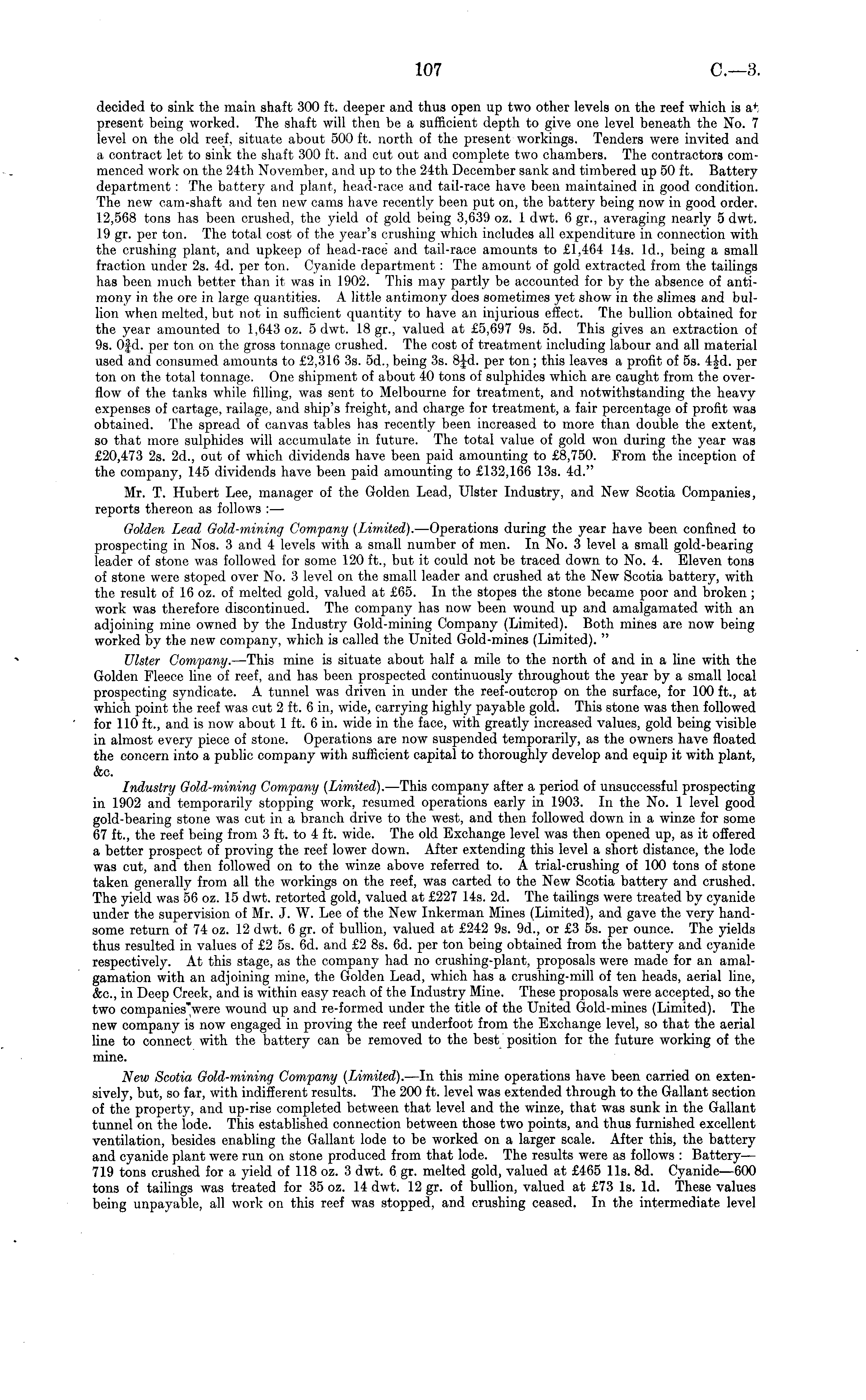 decided to sink the main shaft 300 ft. deeper and thus open up two other levels on the reef which is a f present being worked. The shaft will then be a sufficient depth to give one level beneath the No. 7 level on the old reef, situate about 500 ft. north of the present workings. Tenders were invited and a contract let to sink the shaft 300 ft. and cut out and complete two chambers. The contractors commenced work on the 24th November, and up to the 24th December sank and timbered up 50 ft. Battery department: The battery and plant, head-race and tail-race have been maintained in good condition. The new cam-shaft and ten new cams have recently been put on, the battery being now in good order. 12,568 tons has been crushed, the yield of gold being 3,639 oz. 1 dwt. 6 gr., averaging nearly 5 dwt. 19 gr. per ton. The total cost of the year's crushing which includes all expenditure in connection with the crushing plant, and upkeep of head-race and tail-race amounts to £1,464 14s. Id., being a small fraction under 2s. 4d. per ton. Cyanide department : The amount of gold extracted from the tailings has been much better than it was in 1902. This may partly be accounted for by the absence of antimony in the ore in large quantities. A little antimony does sometimes yet show in the slimes and bullion when melted, but not in sufficient quantity to have an injurious effect. The bullion obtained for the year amounted to 1,643 oz. 5 dwt. 18 gr., valued at £5,697 9s. sd. This gives an extraction of 9s. Of d. per ton on the gross tonnage crushed. The cost of treatment including labour and all material used and consumed amounts to £2,316 3s. 5d., being 3s. BJd. per ton ; this leaves a profit of ss. 4Jd. per ton on the total tonnage. One shipment of about 40 tons of sulphides which are caught from the overflow of the tanks while filling, was sent to Melbourne for treatment, and notwithstanding the heavy expenses of cartage, railage, and ship's freight, and charge for treatment, a fair percentage of profit was obtained. The spread of canvas tables has recently been increased to more than double the extent, so that more sulphides will accumulate in future. The total value of gold won during the year was £20,473 2s. 2d., out of which dividends have been paid amounting to £8,750. From the inception of the company, 145 dividends have been paid amounting to £132,166 13s. 4d." Mr. T. Hubert Lee, manager of the Golden Lead, Ulster Industry, and New Scotia Companies, reports thereon as follows : — Golden Lead Gold-mining Company (Limited). —Operations during the year have been confined to prospecting in Nos. 3 and 4 levels with a small number of men. In No. 3 level a small gold-bearing leader of stone was followed for some 120 ft., but it could not be traced down to No. 4. Eleven tons of stone were stoped over No. 3 level on the small leader and crushed at the New Scotia battery, with the result of 16 oz. of melted gold, valued at £65. In the stopes the stone became poor and broken ; work was therefore discontinued. The company has now been wound up and amalgamated with an adjoining mine owned by the Industry Gold-mining Company (Limited). Both mines are now being worked by the new company, which is called the United Gold-mines (Limited). " Ulster Company. —This mine is situate about half a mile to the north of and in a line with the Golden Fleece line of reef, and has been prospected continuously throughout the year by a small local prospecting syndicate. A tunnel was driven in under the reef-outcrop on the surface, for 100 ft., at which point the reef was cut 2 ft. 6 in, wide, carrying highly payable gold. This stone was then followed for 110 ft., and is now about 1 ft. 6 in. wide in the face, with greatly increased values, gold being visible in almost every piece of stone. Operations are now suspended temporarily, as the owners have floated the concern into a public company with sufficient capital to thoroughly develop and equip it with plant, &c. Industry Gold-mining Company (Limited). —This company after a period of unsuccessful prospecting in 1902 and temporarily stopping work, resumed operations early in 1903. In the No. 1 level good gold-bearing stone was cut in a branch drive to the west, and then followed down in a winze for some 67 ft., the reef being from 3 ft. to 4 ft. wide. The old Exchange level was then opened up, as it offered a better prospect of proving the reef lower down. After extending this level a short distance, the lode was cut, and then followed on to the winze above referred to. A trial-crushing of 100 tons of stone taken generally from all the workings on the reef, was carted to the New Scotia battery and crushed. The yield was 56 oz. 15 dwt. retorted gold, valued at £227 14s. 2d. The tailings were treated by cyanide under the supervision of Mr. J. W. Lee of the New Inkerman Mines (Limited), and gave the very handsome return of 74 oz. 12 dwt. 6 gr. of bullion, valued at £242 9s. 9d., or £3 ss. per ounce. The yields thus resulted in values of £2 ss. 6d. and £2 Bs. 6d. per ton being obtained from the battery and cyanide respectively. At this stage, as the company had no crushing-plant, proposals were made for an amalgamation with an adjoining mine, the Golden Lead, which has a crushing-mill of ten heads, aerial line, &c, in Deep Creek, and is within easy reach of the Industry Mine. These proposals were accepted, so the two companies"were wound up and re-formed under the title of the United Gold-mines (Limited). The new company is now engaged in proving the reef underfoot from the Exchange level, so that the aerial line to connect with the battery can be removed to the best position for the future working of the mine. New Scotia Gold-mining Company (Limited). —In this mine operations have been carried on extensively, but, so far, with indifferent results. The 200 ft. level was extended through to the Gallant section of the property, and up-rise completed between that le