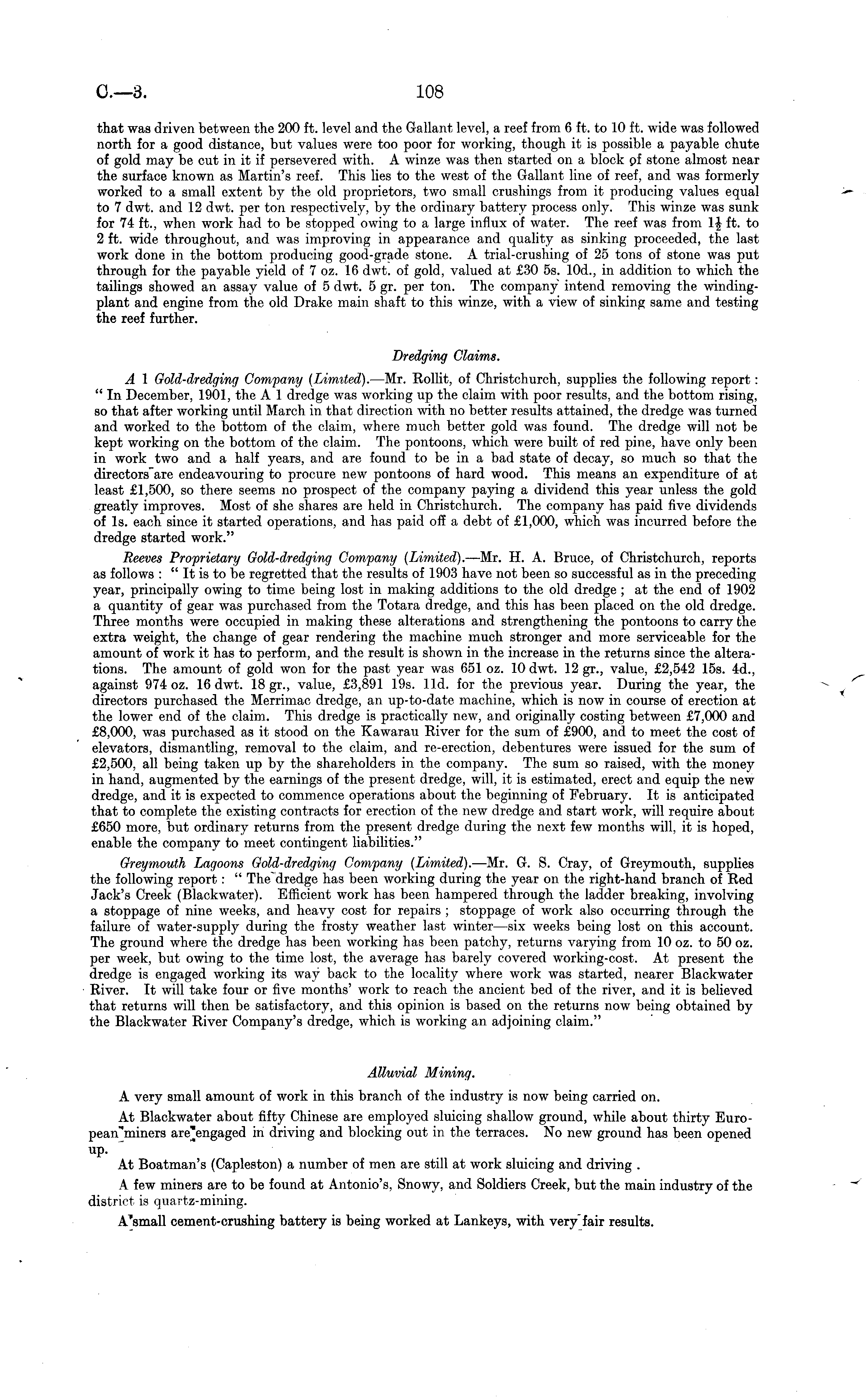 that was driven between the 200 ft. level and the Gallant level, a reef from 6 ft. to 10 ft. wide was followed north for a good distance, but values were too poor for working, though it is possible a payable chute of gold may be cut in it if persevered with. A winze was then started on a block pf stone almost near the surface known as Martin's reef. This lies to the west of the Gallant line of reef, and was formerly worked to a small extent by the old proprietors, two small crushings from it producing values equal to 7 dwt. and 12 dwt. per ton respectively, by the ordinary battery process only. This winze was sunk for 74 ft., when work had to be stopped owing to a large influx of water. The reef was from If ft. to 2 ft. wide throughout, and was improving in appearance and quality as sinking proceeded, the last work done in the bottom producing good-grade stone. A trial-crushing of 25 tons of stone was put through for the payable yield of 7 oz. 16 dwt. of gold, valued at £30 ss. 10d., in addition to which the tailings showed an assay value of 5 dwt. 5 gr. per ton. The company intend removing the windingplant and engine from the old Drake main shaft to this winze, with a view of sinking same and testing the reef further. Dredging Claims. A 1 Gold-dredging Company (Limited). —Mr. Rollit, of Christchurch, supplies the following report: " In December, 1901, the A 1 dredge was working up the claim with poor results, and the bottom rising, so that after working until March in that direction with no better results attained, the dredge was turned and worked to the bottom of the claim, where much better gold was found. The dredge will not be kept working on the bottom of the claim. The pontoons, which were built of red pine, have only been in work two and a half years, and are found to be in a bad state of decay, so much so that the directorsare endeavouring to procure new pontoons of hard wood. This means an expenditure of at least £1,500, so there seems no prospect of the company paying a dividend this year unless the gold greatly improves. Most of she shares are held in Christchurch. The company has paid five dividends of Is. each since it started operations, and has paid off a debt of £1,000, which was incurred before the dredge started work." Reeves Proprietary Gold-dredging Company (Limited). —-Mr. H. A. Bruce, of Christchurch, reports as follows : " It is to be regretted that the results of 1903 have not been so successful as in the preceding year, principally owing to time being lost in making additions to the old dredge ; at the end of 1902 a quantity of gear was purchased from the Totara dredge, and this has been placed on the old dredge. Three months were occupied in making these alterations and strengthening the pontoons to carry the extra weight, the change of gear rendering the machine much stronger and more serviceable for the amount of work it has to perform, and the result is shown in the increase in the returns since the alterations. The amount of gold won for the past year was 651 oz. 10 dwt. 12 gr., value, £2,542 15s. 4d., against 974 oz. 16 dwt. 18 gr., value, £3,891 19s. lid. for the previous year. During the year, the directors purchased the Merrimac dredge, an up-to-date machine, which is now in course of erection at the lower end of the claim. This dredge is practically new, and originally costing between £7,000 and £8,000, was purchased as it stood on the Kawarau River for the sum of £900, and to meet the cost of elevators, dismantling, removal to the claim, and re-erection, debentures were issued for the sum of £2,500, all being taken up by the shareholders in the company. The sum so raised, with the money in hand, augmented by the earnings of the present dredge, will, it is estimated, erect and equip the new dredge, and it is expected to commence operations about the beginning of February. It is anticipated that to complete the existing contracts for erection of the new dredge and start work, will require about £650 more, but ordinary returns from the present dredge during the next few months will, it is hoped, enable the company to meet contingent liabilities." Greymouth Lagoons Gold-dredging Company (Limited). —Mr. G. S. Cray, of Greymouth, supplies the following report: " Thedredge has been working during the year on the right-hand branch of Red Jack's Creek (Blackwater). Efficient work has been hampered through the ladder breaking, involving a stoppage of nine weeks, and heavy cost for repairs ; stoppage of work also occurring through the failure of water-supply during the frosty weather last winter —six weeks being lost on this account. The ground where the dredge has been working has been patchy, returns varying from 10 oz. to 50 oz. per week, but owing to the time lost, the average has barely covered working-cost. At present the dredge is engaged working its way back to the locality where work was started, nearer Blackwater River. It will take four or five months' work to reach the ancient bed of the river, and it is believed that returns will then be satisfactory, and this opinion is based on the returns now being obtained by the Blackwater River Company's dredge, which is working an adjoining claim." Alluvial Mining. A very small amount of work in this branch of the industry is now being carried on. At Blackwater about fifty Chinese are employed sluicing shallow ground, while about thirty European'miners are'engaged in driving and blocking out in the terraces. No new ground has been opened up. At Boatman's (Capleston) a number of men are still at work sluicing and driving . A few miners are to be found at Antonio's, Snowy, and Soldiers Creek, but the main industry of the district is quartz-mining. A'small cement-crushing battery is being worked at Lankeys, with very fair results.