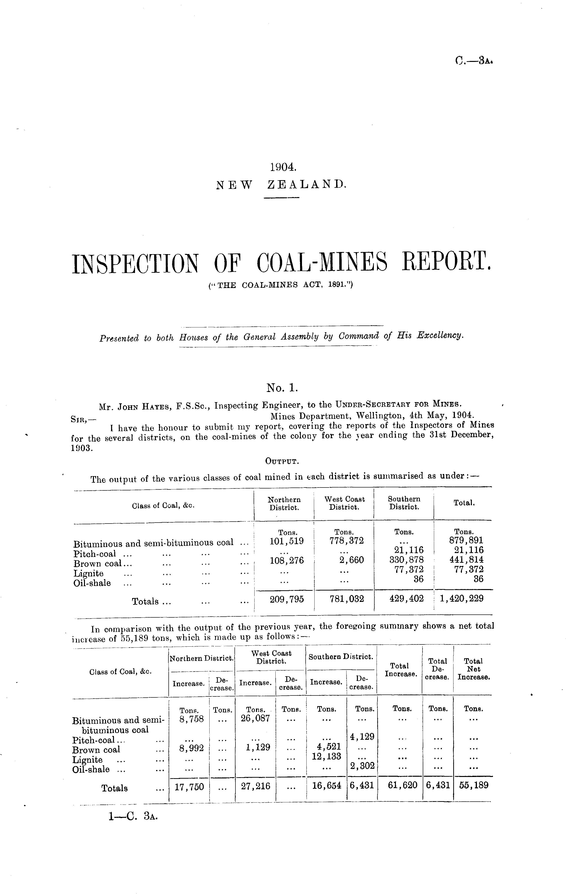 No. 1. Mr. John Hates, F.S.Sc, Inspecting Engineer, to the Under-Secretary for Mines. g IR _ Mines Department, Wellington, 4th May, 1904. I have the honour to submit my report, covering the reports of the Inspectors of Mints for the several districts, on the coal-mines of the colony for the year ending the 31st December, 1903.