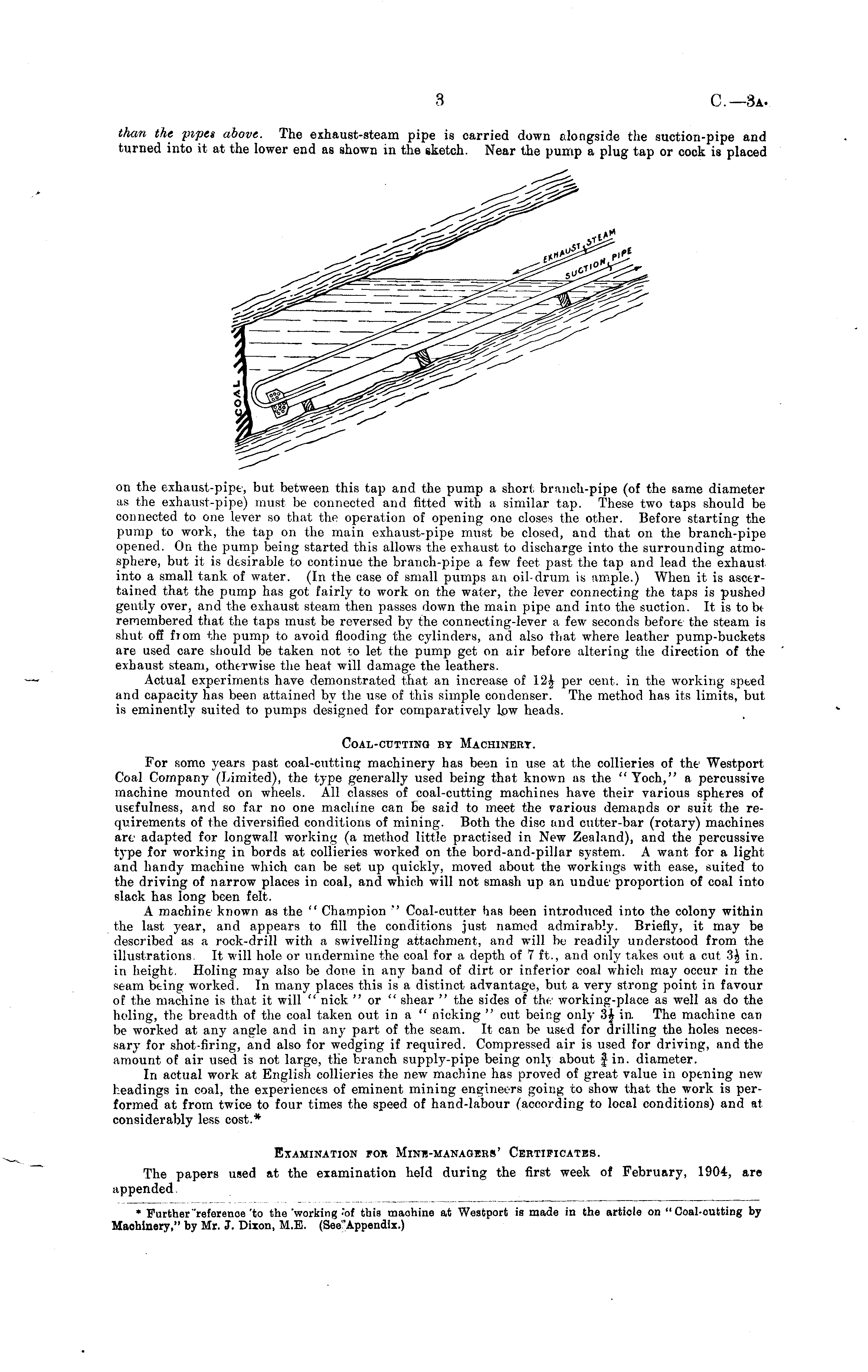 on the exhaust-pipe, but between this tap and the pump a short, branch-pipe (of the same diameter as the exhaust-pipe) must be connected and fitted with a similar tap. These two taps should be connected to one lever so that the operation of opening one closes the other. Before starting the pump to work, the tap on the main exhaust-pipe must be closed, and that on the branch-pipe opened. On the pump being started this allows the exhaust to discharge into the surrounding atmosphere, but it is desirable to continue the branch-pipe a few feet past the tap and lead the exhaust into a small tank of water. (In the case of small pumps an oil-drum is ample.) When it is ascertained that the pump has got fairly to work on the water, the lever connecting the taps is pushed gently over, and the exhaust steam then passes down the main pipe and into the suction. It is to bt remembered that the taps must be reversed by the connecting-lever a few seconds before the steam is shut off from the pump to avoid flooding the cylinders, and also that where leather pump-buckets are used care should be taken not to let the pump get on air before altering the direction of the exhaust steam, otherwise the heat will damage the leathers. Actual experiments have demonstrated that an increase of 12| per cent, in the working speed and capacity has been attained by the use of this simple condenser. The method has its limits, but is eminently suited to pumps designed for comparatively Low heads. CoAL-CUTTING BY MACHINERY. For some years past coal-cutting machinery has been in use at the collieries of the Westport Coal Company (Limited), the type generally used being that known as the " Yoch," a percussive machine mounted on wheels. All classes of coal-cutting machines have their various spheres of usefulness, and so far no one machine can be said to meet the various demands or suit the requirements of the diversified conditions of mining. Both the disc und cutter-bar (rotary) machines are adapted for longwall working (a method little practised in New Zealand), and the percussive type for working in bords at collieries worked on the bord-and-piliar system. A want for a light and handy machine which can be set up quickly, moved about the workings with ease, suited to the driving of narrow places in coal, and which will not smash up an undue proportion of coal into slack has long been felt. A machine known as the " Champion " Coal-cutter has been introduced into the colony within the last year, and appears to fill the conditions just named admirably. Briefly, it may be described as a rock-drill with a swivelling attachment, and will be readily understood from the illustrations. It will hole or undermine the coal for a depth of 7 ft., and only takes out a cut in. in height. Holing may also be done in any band of dirt or inferior coal which may occur in the seam being worked. In many places this is a distinct advantage, but a very strong point in favour of the machine is that it will " nick " or " shear " the sides of the working-place as well as do the holing, the breadth of the coal taken out in a " nicking " cut being only 3£ in. The machine can be worked at any angle and in any part of the seam. It can be used for drilling the holes necessary for shot-firing, and also for wedging if required. Compressed air is used for driving, and the amount of air used is not large, the branch supply-pipe being only about § in. diameter. In actual work at English collieries the new machine has proved of great value in opening new headings in coal, the experiences of eminent mining engineers going to show that the work is performed at from twice to four times the speed of hand-labour (according to local conditions) and at considerably less cost.* Examination for Minb-managers' Certificates. The papers used at the examination held during the first week of February, 1904, are appended. * Further referenoe 'to the working *of this maohine at Westport is made in the artiole on " Coal-outting by Maohinery," by Mr. J. Dixon, M.E. (See' Appendix.)