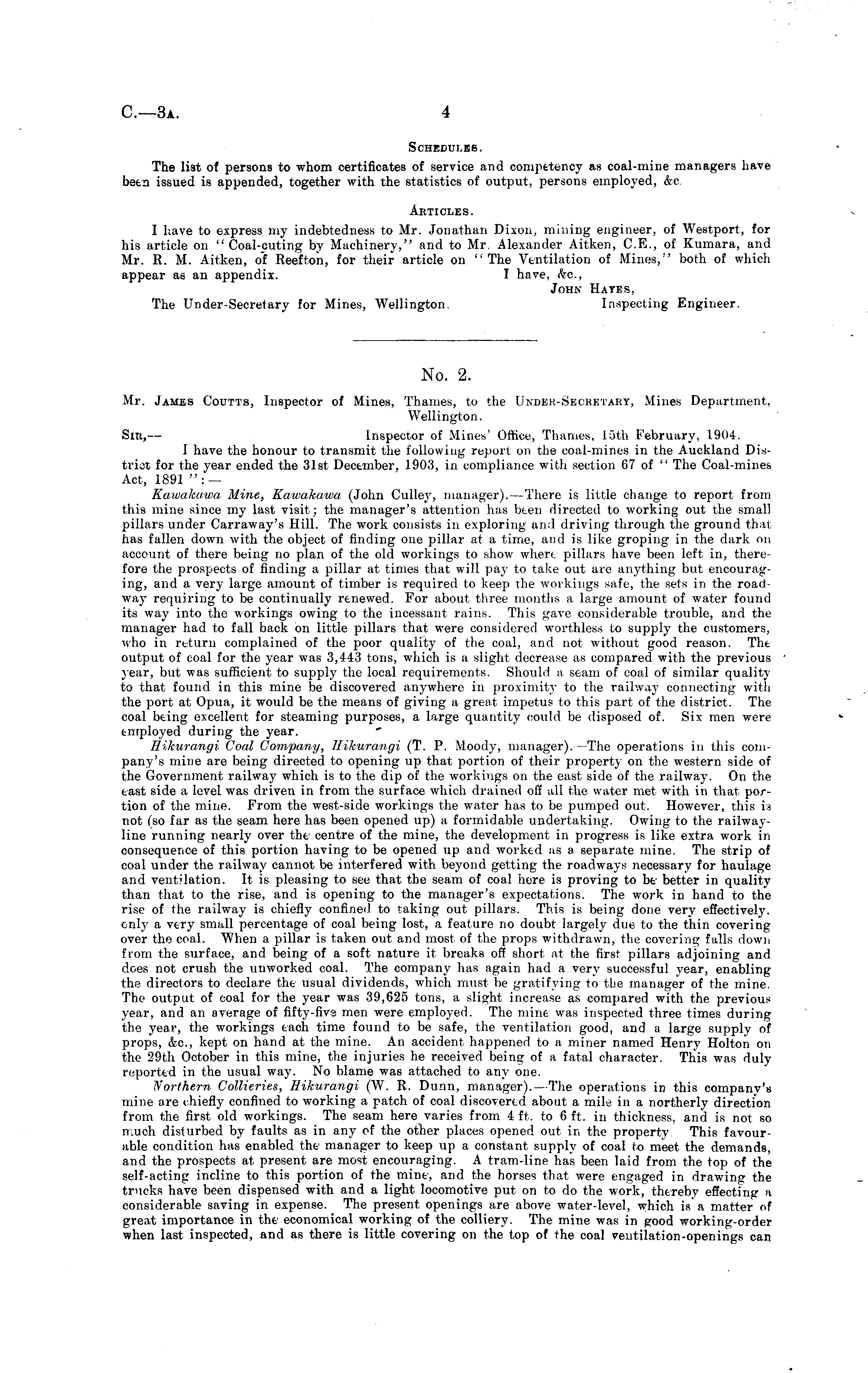 Schedules. The list of persons to whom certificates of service and competency as coal-mine managers have been issued is appended, together with the statistics of output, persons employed, &c Articles. I have to express my indebtedness to Mr. Jonathan Dixon, mining engineer, of Westport, for his article on " Coal-cuting by Machinery," and to Mr. Alexander Aitken, C.E., of Kumara, and Mr. R. M. Aitken, of Reefton, for their article on "The Ventilation of Mines," both of which appear as an appendix. I have, ike, John Hayes, The Under-Secretary for Mines, Wellington. Inspecting Engineer.