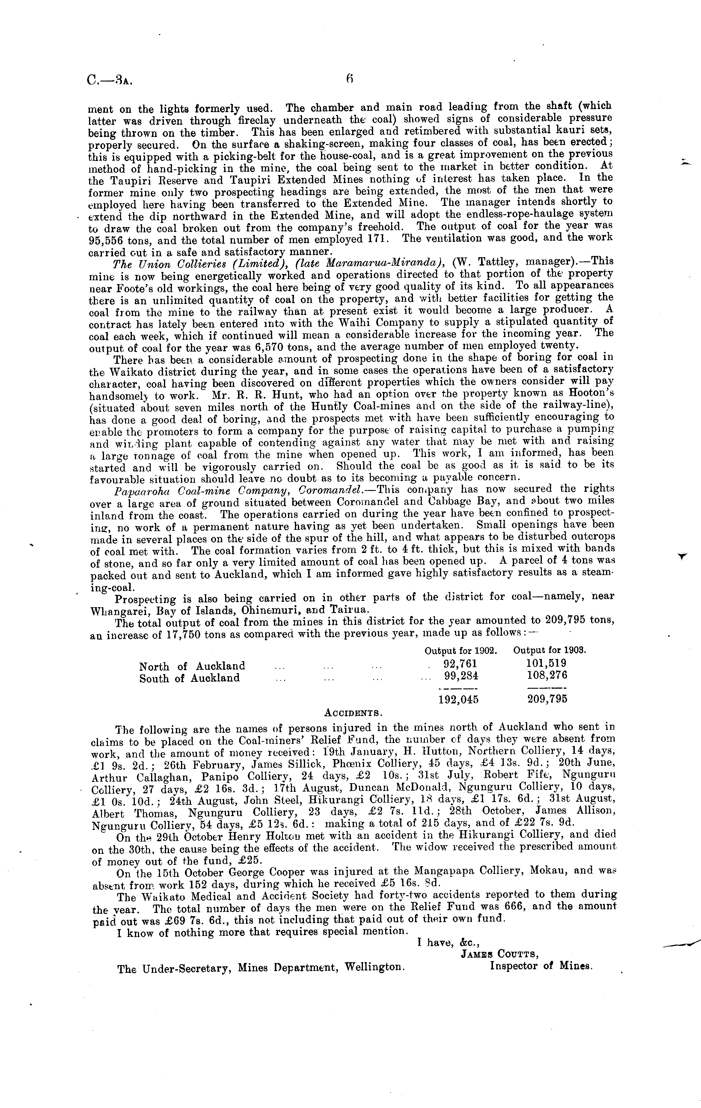 ment on the lights formerly used. The chamber and main road leading from the shaft (which latter was driven through fireclay underneath the coal) showed signs of considerable pressure being thrown on the timber. This has been enlarged and retimbered with substantial kauri sets, properly secured. On the surface a shaking-screen, making four classes of coal, has been erected; this is equipped with a picking-belt for the house-coal, and is a great improvement on the previous method of hand-picking in the mine, the coal being sent to the market in better condition. At the Taupiri Reserve and Taupiri Extended Mines nothing of interest has taken place. In the former mine only two prospecting headings are being extended, the most of the men that were employed here having been transferred to the Extended Mine. The manager intends shortly to extend the dip northward in the Extended Mine, and will adopt the endless-rope-haulage system to draw the coal broken out from the company's freehold. The output of coal for the year was 95,556 tons, and the total number of men employed 171. The ventilation was good, and the work carried out in a safe and satisfactory manner. The Union Collieries (Limited), (late Maramarua-Miranda), (W. Tattley, manager).—This mine is now being energetically worked and operations directed to that portion of the property near Foote's old workings, the coal here being of very good quality of its kind. To all appearances there is an unlimited quantity of coal on the property, and witli better facilities for getting the coal from the mine to the railway than at present exist it would become a large producer. A contract has lately been entered into with the Waihi Company to supply a stipulated quantity of coal each week, which if continued will mean a considerable increase for the incoming year. The output of coal for the year was 6,570 tons, and the average number of men employed twenty. There has been a considerable amount of prospecting done in the shape of boring for coal in the Waikato district during the year, and in some cases the operations have been of a satisfactory character, coal having been discovered on different properties which the owners consider will pay handsomely to work. Mr. R. R. Hunt, who had an option over the property known as Hooton's (situated about seven miles north of the Huntly Coal-mines and on the side of the railway-line), has done a good deal of boring, and the prospects met with have been sufficiently encouraging to enable the promoters to form a company for the purpose of raising capital to purchase a pumping and winding plant capable of contending against any water that may be met with and raising a large Tonnage of coal from the mine when opened up. This work, I am informed, has been started and will be vigorously carried on. Should the coal be as good as it is said to be its favourable situation should leave no doubt as to its becoming a payable concern. Papaaroha Coal-mine Company, Coromandel. —This company has now secured the rights over a large area of ground situated between Coromandel and Cabbage Bay, and about two miles inland from the coast. The operations carried on during the year have been confined to prospectins, no work of a permanent nature having as yet been undertaken. Small openings have been made in several places on the side of the spur of the hill, and what appears to be disturbed outcrops of coal met with. The coal formation varies from 2 ft. to 4 ft. thick, but this is mixed with bands of stone, and so far only a very limited amount of coal has been opened up. A parcel of 4 tons was packed out and sent to Auckland, which I am informed gave highly satisfactory results as a steam-ing-coal. Prospecting is also being carried on in other parts of the district for coal—namely, near Whangarei, Bay of Islands, Ohinemuri, and Tairua. The total output of coal from the mines in this district for the year amounted to 209,795 tons, an increase of 17,750 tons as compared with the previous year, made up as follows: — Output for 1902. Output for 1903. North of Auckland ... ... ... 92,761 101,519 South of Auckland 99,284 108,276 192,045 209,795 Accidents. The following are the names of persons injured in the mines north of Auckland who sent in claims to be placed on the Coal-miners' Relief Fund, the number of days they were absent from work, and the amount of money received: 19th January, H. Hutton, Northern Colliery, 14 days, £1 9s 2d.; 26th February, James Sillick, Phoenix Colliery, 45 days, £4 13s. 9d.; 20th June, Arthur Callaghan, Panipo Colliery, 24 days, £2 10s.; 31st July, Robert Fife, Ngunguru Colliery, 27 days, £2 16s. 3d. ; 17th August, Duncan McDonald, Ngunguru Colliery, 10 days, £1 os. lOd.; 24th August, John Steel, Hikurangi Colliery, 18 days, £1 17s. 6d.; 31st August, Albert Thomas, Ngunguru Colliery, 23 days, £2 7s. lid.; 28th October, James Allison, Ngunguru Colliery, 54 days, £5 12s. 6d. : making a total of 215 days, and of £22 7s. 9d. On the 29th October Henry Helton met with an accident in the Hikurangi Colliery, and died on the 30th, the cause being the effects of the accident. The widow received the prescribed amount of money out of the fund, £25. On the 15th October George Cooper was injured at the Mangapapa Colliery, Mokau, and wa,< absent from work 152 days, during which he received £5 16s. Sd. The Waikato Medical and Accident Society had forty-two accidents reported to them during the year. The total number of days the men were on the Relief Fund was 666, and the amount paid out was £69 7s. 6d., this not including that paid out of their own fund. I know of nothing more that requires special mention. I have, &c. ~ James Coutts, The Under-Secretary, Mines Department, Wellington. Inspector of Mines.