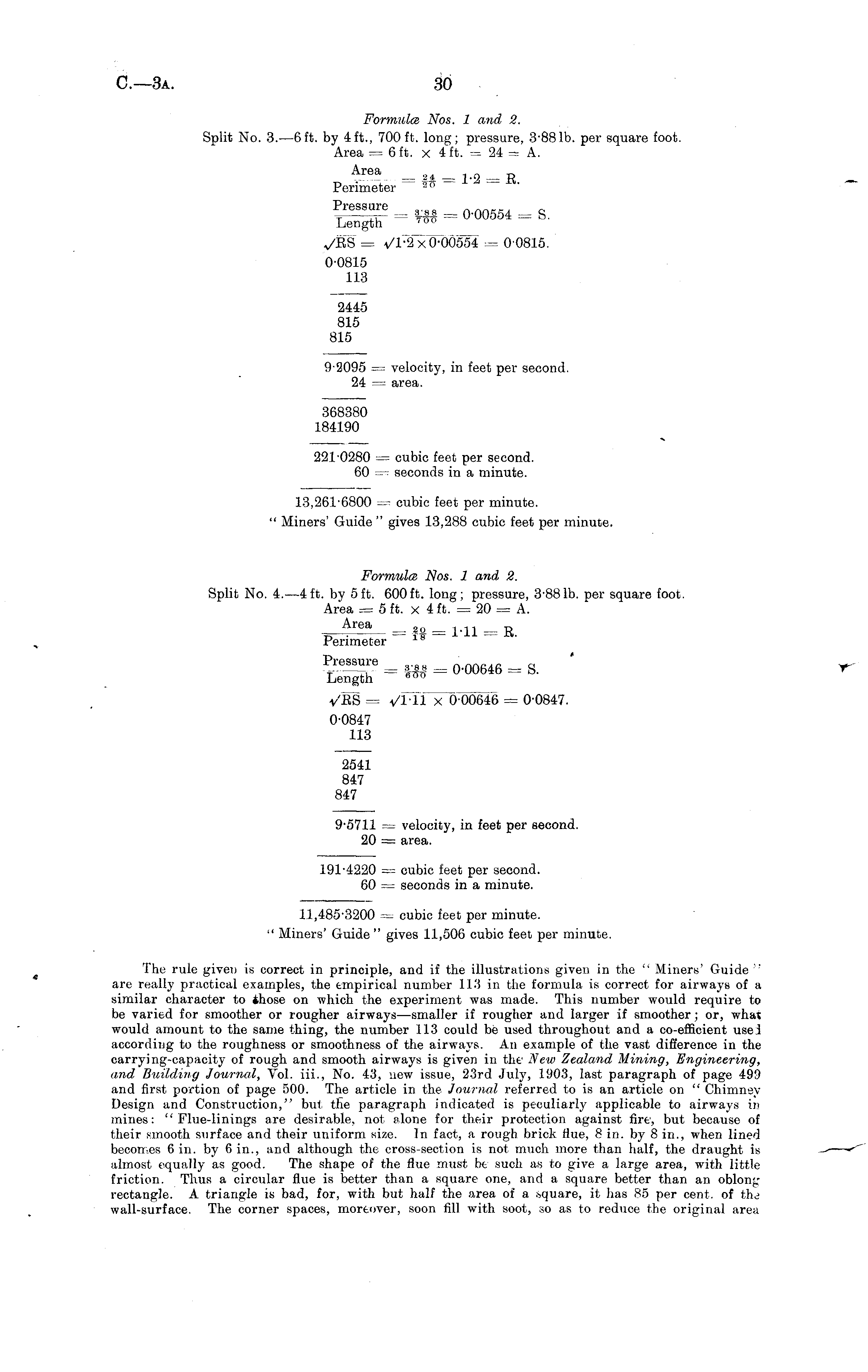 Formula Nos. 1 and 2. Split No. 3.—6 ft. by 4ft., 700 ft. long; pressure, 3-88lb. per square foot. Area = 6 ft. x 4 ft. = 24 = A. Area =24 = 1.0, B Perimeter 2TT yRS = Vl-2X 0-00554 = 00815. 0-0815 113 2445 815 815 9-2095 = velocity, in feet per second. 24 = area. 368380 184190 2210280 = cubic feet per second. 60 = seconds in a minute. 13,261-6800 = cubic feet per minute. " Miners' Guide " gives 13,288 cubic feet per minute. Formula Nos. 1 and 2. Split No. 4.—4 ft. by sft. 600 ft. long; pressure, 3'BBlb. per square foot. Area = 5 ft. x 4 ft. = 20 = A. ■*~y rea __ 20 _ 1-11 _ R Perimeter r Pressure _ 3 . 88 __ 0 . 00 g 46 __ g Length - TO " - ° UUb * b _b ' v'M = t/1-11 X 000646 = 0-0847. 0-0847 113 2541 847 847 9 - 5711 = velocity, in feet per second. 20 = area. 191-4220 = cubic feet per second. 60 = seconds in a minute. 11,485-3200 = cubic feet per minute. " Miners' Guide " gives 11,506 cubic feet per minute. The rule given is correct in principle, and if the illustrations given in the " Miners' Guide " are really practical examples, the empirical number 113 in the formula is correct for airways of a similar character to those on which the experiment was made. This number would require to be varied for smoother or rougher airways—smaller if rougher and larger if smoother; or, what would amount to the same thing, the number 113 could be used throughout and a co-efficient use! according to the roughness or smoothness of the airways. An example of the vast difference in the carrying-capacity of rough and smooth airways is given in the New Zealand Mining, Engineering, and Building Journal, Vol. iii., No. 43, new issue, 23rd July, 1903, last paragraph of page 499 and first portion of page 500. The article in the Journal referred to is an article on " Chimney Design and Construction," but the paragraph indicated is peculiarly applicable to airways in mines: "Flue-linings are desirable, not alone for their protection against fire, but because of their smooth surface and their uniform size. In fact, a rough brick flue, 8 in. by 8 in., when lined becomes 6 in. by 6 in., and although the cross-section is not much more than half, the draught is almost equally as good. The shape of the flue must be such as to give a large area, with little friction. Thus a circular flue is better than a square one, and a square better than an oblong rectangle. A triangle is bad, for, with but half the area of a square, it has 85 per cent, of the wall-surface. The corner spaces, moreover, soon fill with soot, so as to reduce the original area