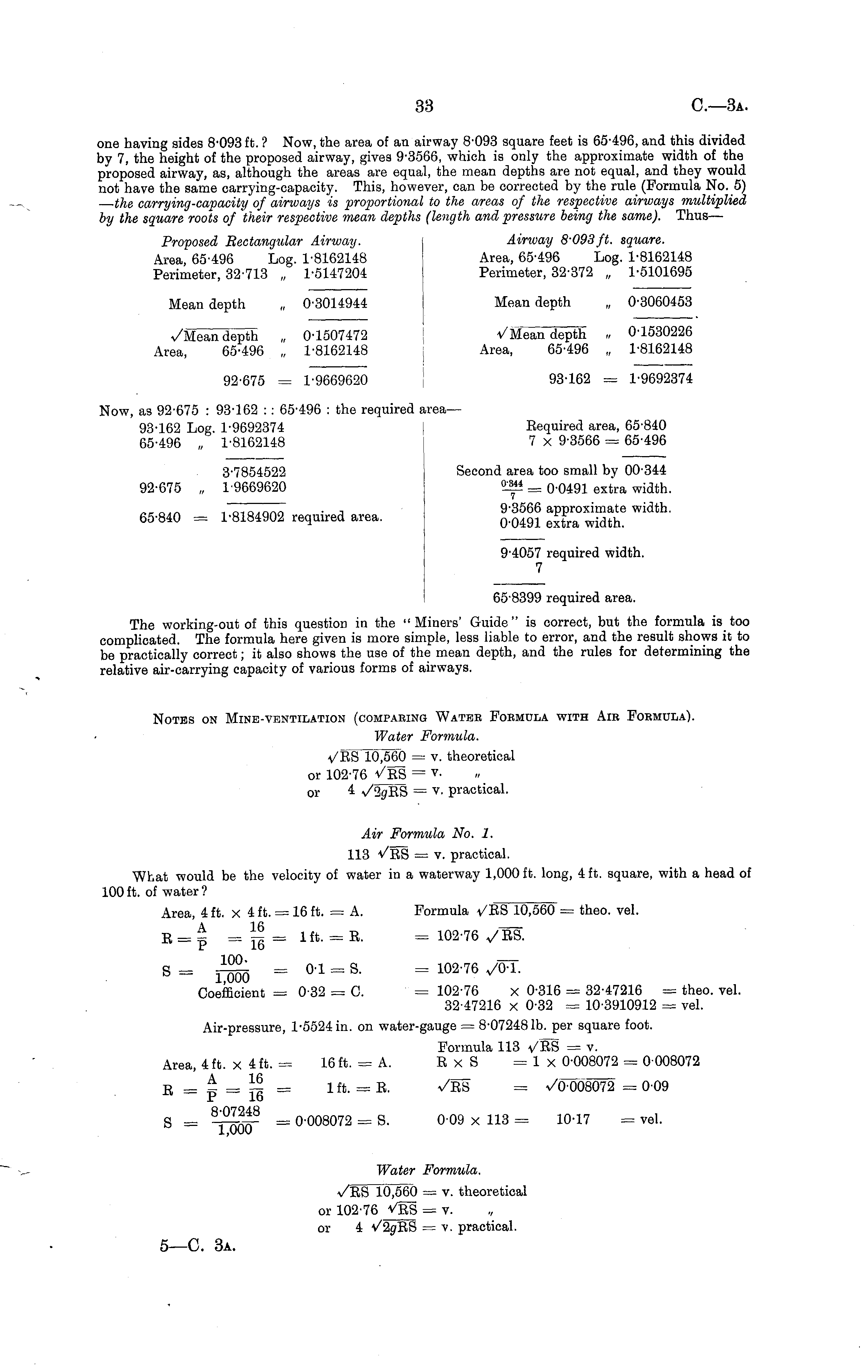 one having sides 8-093 ft. ? Now, the area of an airway 8-093 square feet is 65-496, and this divided by 7, the height of the proposed airway, gives 9-3566, which is only the approximate width of the proposed airway, as, although the areas are equal, the mean depths are not equal, and they would not have the same carrying-capacity. This, however, can be corrected by the rule (Formula No. 5) — the carrying-capacity of airways is proportional to the areas of the respective airivays multiplied by the square roots of their respective mean depths (length and pressure being the same). Thus — Proposed Rectangular Airway. Airway 8-093 ft. square. Area, 65-496 Log. 1-8162148 Area, 65-496 Log. 1-8162148 Perimeter, 32-713 „ 1-5147204 Perimeter, 32-372 „ 1-5101695 Mean depth „ 0-3014944 Mean depth „ 0-3060453 yMean depth „ 0-1507472 VMean depth „ 0-1530226 Area, 65-496 „ 1-8162148 Area, 65-496 „ 1-8162148 92-675 = 1-9669620 93-162 = 1-9692374 Now, as 92-675 : 93-162 :: 65-496 : the required area— 93-162 Log. 1-9692374 I Bequired area, 65-840 65-496 „ 1-8162148 7 x 9-3566 = 65-496 3-7854522 Second area too small by 00-344 92-675 „ 19669620 = 0-0491 extra width. „„ „,.. , 010 , nm • j 9-3566 approximate width. 65-840 = 1-8184902 required area. 0 . 0491 width 9-4057 required width. 7 65-8399 required area. The working-out of this question in the "Miners' Guide" is correct, but the formula is too complicated. The formula here given is more simple, less liable to error, and the result shows it to be practically correct; it also shows the use of the mean depth, and the rules for determining the relative air-carrying capacity of various forms of airways. Notes on Mine-ventilation (comparing Water Formula with Air Formula). Water Formula. ■\/RiriO,s6o = v. theoretical or 102-76 VRS = v. or 4 ,\/2gRS =v. practical. Air Formula No. 1. 113 = v. practical. What would be the velocity of water in a waterway 1,000 ft. long, 4 ft. square, with a head of 100 ft. of water ? Area, 4 ft. x 4 ft. = 16 ft. = A. Formula y/BS 10,560 = theo. vel. A 16 ■ B = =5 Ift. = E. = 102-76 yRS. s = ro = °' 1 =s - = 102 7 6 yFI Coefficient = 032 =C. = 10276 x 0-316 = 32-47216 = theo. vel. 32-47216 x 0-32 = 10-3910912 = vel. Air-pressure, 1-5524 in. on water-gauge = 8-07248 lb. per square foot. Formula 113 \/BS = v. Area, 4 ft. x 4 ft. = 16 ft. =A. RxS =Ixo-008072 = 0008072 R = =*| = 1 ft. =B. = v/0 T 0()8072 = 009 S = = 0 0 08072 =s- °' 09 x 113 = 10 1 7 = vel Water Formula. yBS 10,560 = v. theoretical or 102-76 VBS = v. or 4 =v. practical.