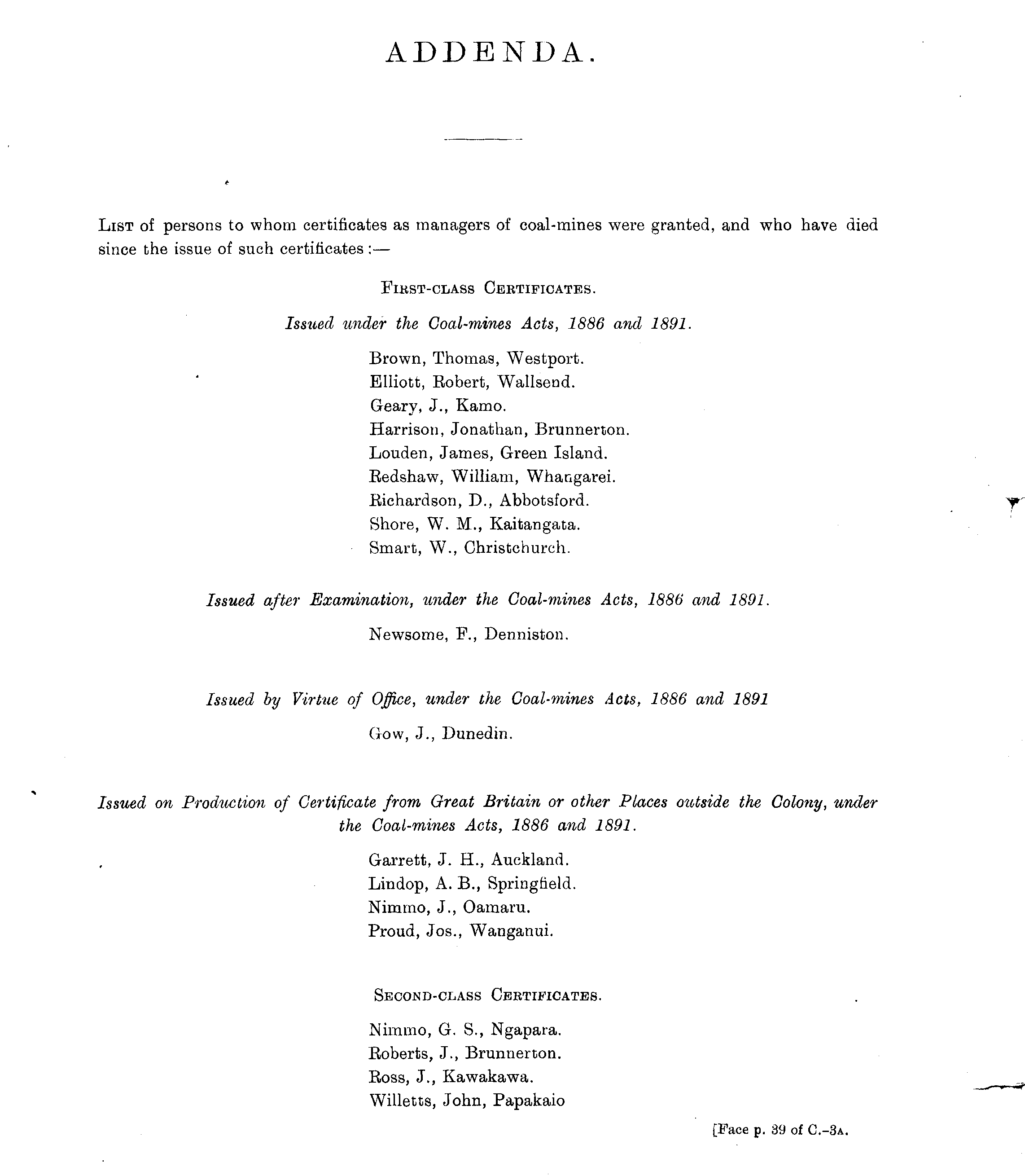 List of persons to whom certificates as managers of coal-mines were granted, and who have died since the issue of such certificates ;— First-class Certificates. Issued under the Coal-mines Acts, 1886 and 1891. Brown, Thomas, Westport. Elliott, Bobert, Wallsend. Geary, J., Kamo. Harrison, Jonathan, Brunnerton. Louden, James, Green Island. Bedshaw, William, Whangarei. Richardson, D., Abbotsford. • Shore, W. M., Kaitangata. Smart, W., Christchurch. Issued after Examination, under the Goal-mines Acts, 1886 and 1891. Newsome, F., Denniston. Issued by Virtue of Office, under the Coal-mines Acts, 1886 and 1891 Gow, J., Dunedin. Issued on Production of Certificate from Great Britain or other Places outside the Colony, under the Goal-mines Acts, 1886 and 1891. Garrett, J. H., Auckland. Lindop, A. 8., Springfield. Nimmo, J., Oamaru. Proud, Jos., Wangauui. Second-class Certificates. Nimmo, G. S., Ngapara. Boberts, J., Brunnerton. Boss, J., Kawakawa. Willetts, John, Papakaio [Pace p. 3<J of C.-3a.