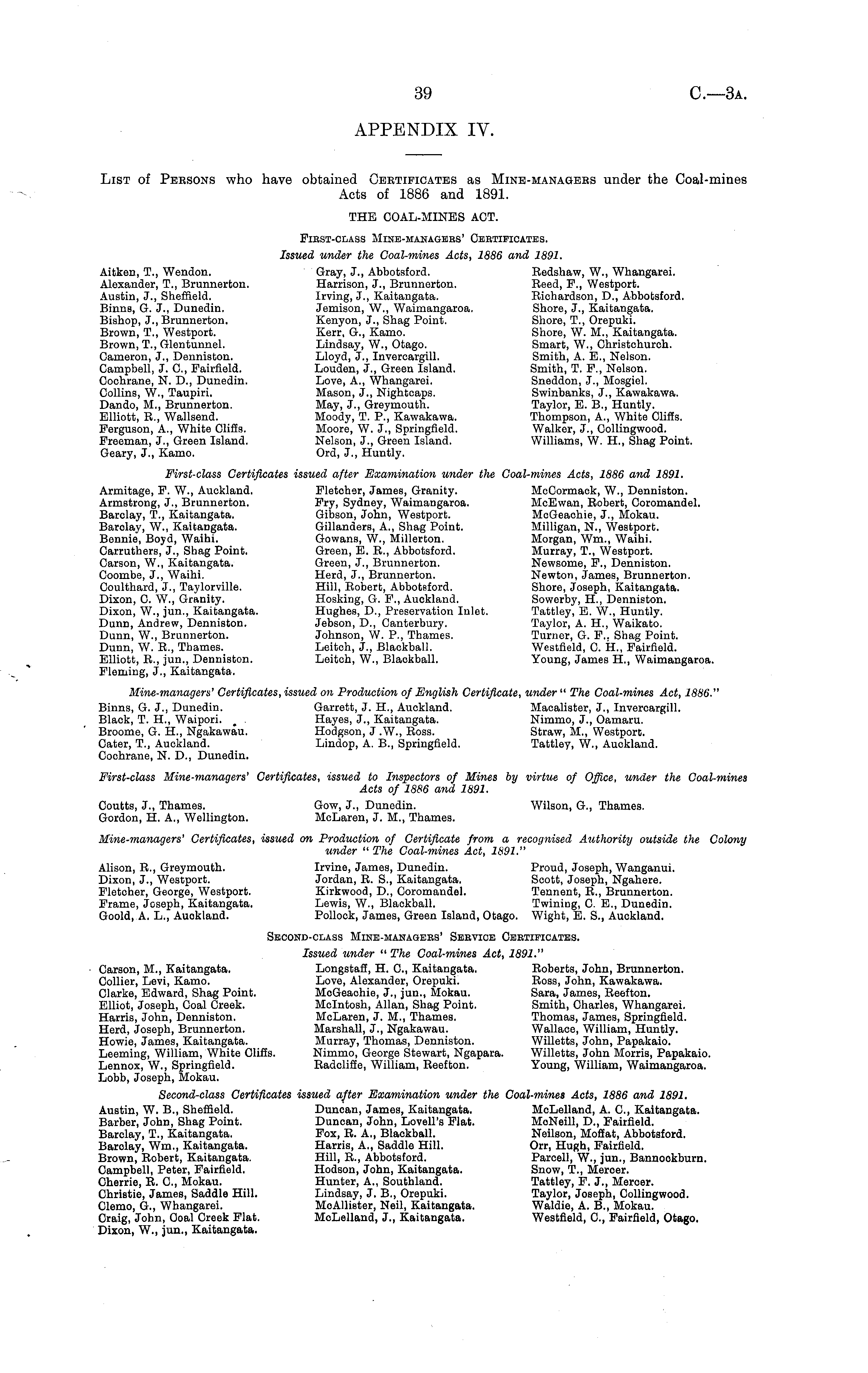 APPENDIX IV. List of Persons who have obtained Certificates as Mine-managers under the Coal-mines Acts of 1886 and 1891. THE COAL-MINES ACT. FIBST-CLASS MINE-MANAGEBS' CeBTIEICATES. Issued under the Coal-mines Acts, 1886 and 1891. Aitken, T., Wendon. Gray, J., Abbotsford. Redshaw, W., Whangarei. Alexander, T., Brunnerton. Harrison, J., Brunnerton. Reed, P., Westport. Austin, J., Sheffield. Irving, J., Kaitangata. Richardson, D., Abbotsford. Binns, G. J., Dunedin. Jemison, W., Waimangaroa. Shore, J., Kaitangata. Bishop, J., Brunnerton. Kenyon, J., Shag Point. Shore, T., Orepuki. Brown, T., Westport. Kerr, G., Kamo. Shore, W. M., Kaitangata. Brown, T., Glentunnel. Lindsay, W., Otago. Smart, W., Christchurch. Cameron, J., Denniston. Lloyd, J., Invercargill. Smith, A. E., Nelson. Campbell, J. 0., Fairfield. Louden, J., Green Island. Smith, T. P., Nelson. Cochrane, N. D., Dunedin. Love, A., Whangarei. Sneddon, J., Mosgiel. Collins, W., Taupiri. Mason, J., Nightcaps. Swinbanks, J., Kawakawa. Dando, M., Brunnerton. May, J., Greymouth. Taylor, E. 8., Huntly. Elliott, R., Wallsend. Moody, T. P., Kawakawa. Thompson, A., White Cliffs. Ferguson, A., White Cliffs. Moore, W. J., Springfield. Walker, J., Oollingwood. Freeman, J., Green Island. Nelson, J., Green Island. Williams, W. H., Shag Point. Geary, J., Kamo. Ord, J., Huntly. First-class Certificates issued after Examination under the Coal-mines Acts, 1886 and 1891. Armitage, P. W., Auckland. Fletcher, James, Granity. McCormack, W., Denniston. Armstrong, J., Brunnerton. Fry, Sydney, Waimangaroa. McEwan, Robert, Coromandel. Barclay, T., Kaitangata. Gibson, John, Westport. McGeachie, J., Mokau. Barolay, W., Kaitangata. Gillanders, A., Shag Point. Milligan, N., Westport. Bennie, Boyd, Waihi. Gowans, W., Millerton. Morgan, Wm., Waihi. Carruthers, J., Shag Point. Green, E. R., Abbotsford. Murray, T., Westport. Carson, W., Kaitangata. Green, J., Brunnerton. Newsome, P., Denniston. Coombe, J., Waihi. Herd, J., Brunnerton. Newton, James, Brunnerton. Coulthard, J., Taylorville. Hill, Robert, Abbotsford. Shore, Joseph, Kaitangata. Dixon, C. W., Granity. Hosking, G. P., Auckland. Sowerby, H., Denniston. Dixon, W., jun., Kaitangata. Hughes, D., Preservation Inlet. Tattley, E. W., Huntly. Dunn, Andrew, Denniston. Jebson, D., Canterbury. Taylor, A. H, Waikato. Dunn, W., Brunnerton. Johnson, W. P., Thames. Turner, G. P.. Shag Point. Dunn, W. R., Thames. Leitch, J., Blackball. Westfield, C. H, Fairfield. Elliott, R., jun., Denniston. Leitch, W., Blackball. Young, James H., Waimangaroa. Fleming, J., Kaitangata. Mine-managers' Certificates, issued on Production of English Certificate, under " The Coal-mines Act, 1886." Binns, G. J., Dunedin. Garrett, J. H., Auckland. Macalister, J., Invercargill. Black, T. H, Waipori. , . Hayes, J., Kaitangata. Nimmo, J., Oamaru. Broome, G. H., Ngakawau. Hodgson, J .W., Ross. Straw, M., Westport. Cater, T., Auckland. Lindop, A. 8., Springfield. Tattley, W, Auckland. Cochrane, N. D., Dunedin. First-class Mine-managers' Certificates, issued to Inspectors of Mines by virtue of Office, under the Coal-mines Acts of 1886 and 1891. Coutts, J., Thames. Gow, J., Dunedin. Wilson, G., Thames. Gordon, H. A., Wellington. McLaren, J. M., Thames. Mine-managers' Certificates, issued on Production of Certificate from a recognised Authority outside the Colony under " The Coal-mines Act, 1891." Alison, R., Greymouth. Irvine, James, Dunedin. Proud, Joseph, Wanganui. Dixon, J., Westport. Jordan, R. S., Kaitangata. Scott, Joseph, Ngahere. Fletcher, George, Westport. Kirkwood, D., Coromandel. Tennent, R., Brunnerton. Frame, Joseph, Kaitangata. Lewis, W., Blackball. Twining, C. E., Dunedin. Goold, A. L., Auokland. Pollock, James, Green Island, Otago. Wight, E. S., Auckland. Second-class Mine-manaoebs' Seevice Oebtificates. Issued under " The Coal-mines Act, 1891." Carson, M., Kaitangata. Longstaff, H. C, Kaitangata. Roberts, John, Brunnerton. Collier, Levi, Kamo. Love, Alexander, Orepuki. Ross, John, Kawakawa. Clarke, Edward, Shag Point. McGeachie, J., jun., Mokau. Sara, James, Reefton. Elliot, Joseph, Coal Creek. Mcintosh, Allan, Shag Point. Smith, Charles, Whangarei. Harris, John, Denniston. McLaren, J. M., Thames. Thomas, James, Springfield. Herd, Joseph, Brunnerton. Marshall, J., Ngakawau. Wallace, William, Huntly. Howie, James, Kaitangata. Murray, Thomas, Denniston. Willetts, John, Papakaio. Deeming, William, White Cliffs. Nimmo, George Stewart, Ngapara. Willetts, John Morris, Papakaio. Lennox, W., Springfield. Radcliffe, William, Reefton. Young, William, Waimangaroa. Lobb, Joseph, Mokau. Second-class Certificates issued after Examination under the Coal-mines Acts, 1886 and 1891. Austin, W. 8., Sheffield. Duncan, James, Kaitangata. McLelland, A. C, Kaitangata. Barber, John, Shag Point. Duncan, John, Lovell's Plat. McNeill, D., Fairfield. Barclay, T., Kaitangata. Fox, R. A., Blackball. Neilson, Moffat, Abbotsford. Barclay, Wm., Kaitangata. Harris, A., Saddle Hill. Orr, Hugh, Fairfield. Brown, Robert, Kaitangata. Hill, R., Abbotsford. Parcell, W., jun., Bannockburn. Campbell, Peter, Fairfield. Hodson, John, Kaitangata. Snow, T., Mercer. Cherrie, R. C, Mokau. Hunter, A., Southland. Tattley, F. J., Meroer. Christie, James, Saddle Hill. Lindsay, J. 8., Orepuki. Taylor, Joseph, Collingwood. Clemo, G., Whangarei. MoAllister, Neil, Kaitangata. Waldie, A. 8., Mokau. Craig, John, Coal Greek Flat. MoLelland, J., Kaitangata. Westfield, C, Fairfield, Otago. Dixon, W., jun., Kaitangata.
