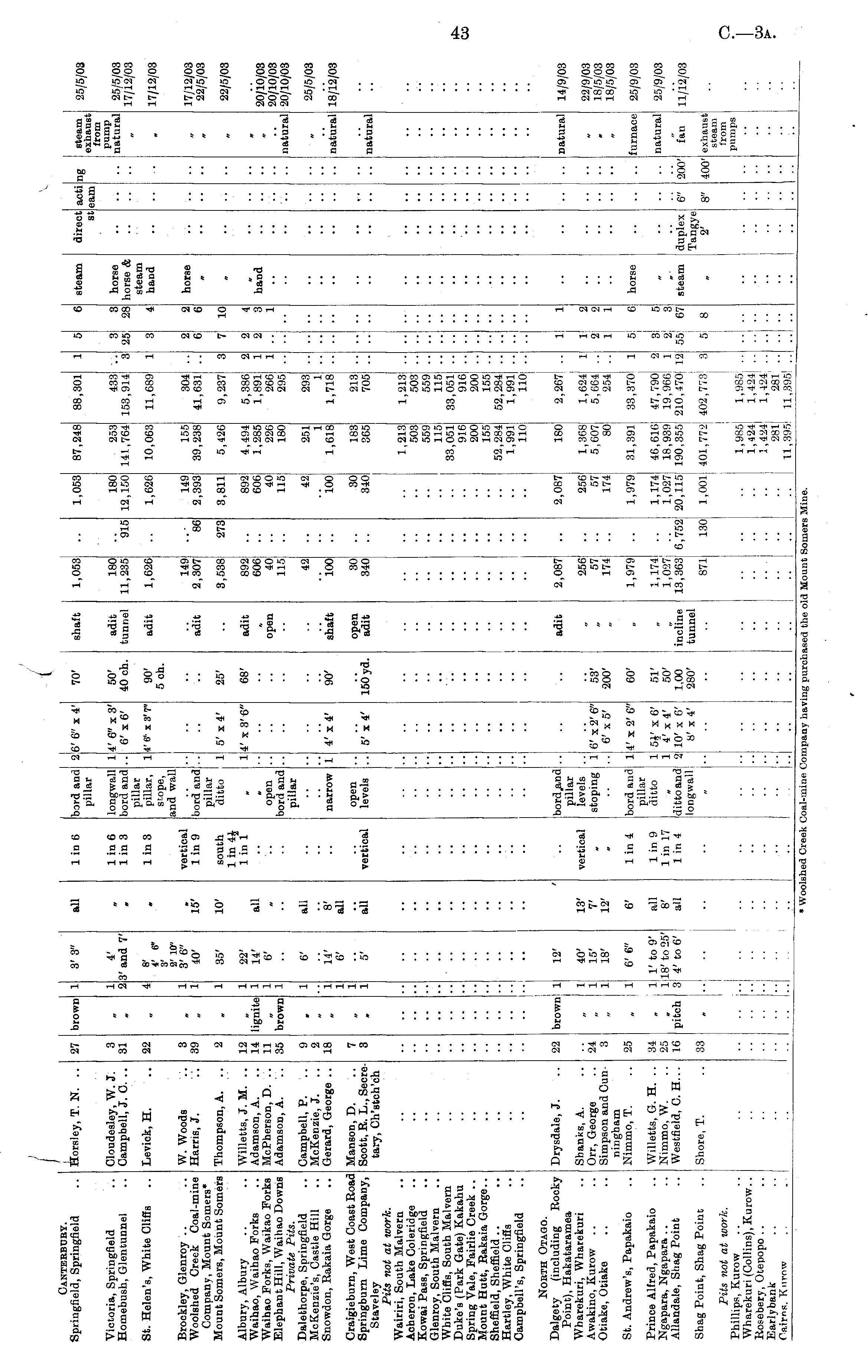 1 Horsley, T. N. ( Canterbury. Springfield, Springfield 27 brown 3' 3" all 1 in 6 bord and pillar 6' 6" x 4' 70' shaft 1,053 1,053 87,248 88,301 steam direct st acti earn steam exhaust from pump natural 25/5/03 ng Victoria, Springfield Homebush, Glentunnel Cloudesley, W. J. Campbell, J. C. .. 3 31 1 2 4' 3' and 7' lin6 1 in 3 longwall bord and pillar pillar, s'ope, and wall 4' 6" x 3' 6' x6' 50' 40 ch. adit tunnel 180 11,235 915 180 12,150 253 141,764 433 ' 153,914j 8 8 3 28 horse horse & steam hand 25/5/03 17/12/03 •• St. Helen's, White Cliffs .. Leviok, H. 22 8' 3' 2' 10" 3'6" 40' 1 in 3 4' 6'- x 3' 7" 90' 5ch. adit 1,626 1,626 10,063 11,689 3 4 17/12/03 Brookley, Glenroy .. Woolshed Creek Coal-mine Company, Mount Somers' Mount Somers, Mount Somers W. Woods Harris, J. 3 39 1 1 15' vertical lin9 bord and pillar ditto adit 149 2,307 "86 149 2,393 155 39,238 304 41,631 2 6 2 6 horse 17/12/03 22/5/03 " n Thompson, A. .. 2 35' 10' south 1 in 4J 1 in 1 5' x4' 25' 3,538 273 3,811 5,426 9,237 3 10 22/5/03 Albury, Albury Waihao, Waihao Forks Waihao Forks, Waikao Forks Elephant Hill, Waihao Downs Private Pits. Dalethorpe, Springfield McKenzie's, Castle Hill Snowdon, Rakaia Gorge Willetts, J. M. .. Adamson, A. McPherson, D. .. Adamson, A. 12 14 11 35 lignite 1 1 1 1 22' 14' 6' all open bord and pillar 4' X 3' 6" 68' adit open 892 606 40 115 892 606 40 115 4,494 1,285 226 180 5,386 1,891 266 295 2 1 1 2 2 4 3 1 hand 20/10/03 20/10/03 20/10/03 brown -• • • natural Campbell, P. McKenzie, J. Gerard, George .. 9 2 18 6' 14' 6' all 8' all • 4' x4' 90' shaft 42 100 42J 100 251 1,618 293 1 1,718 25/5/03 1 1 1 1 narrow 1 natural 18/12/03 Craigieburn, West Coast Road Springburn Lime Company, Stave ley Pits not at work. Wairiri, South Malvern Acheron, Lake Coleridge Kowai Pass, Springfield Glenroy, South Malvern White Cliffs, South Malvern Duke's (Park Gate) Kakahu Spring Vale, Fairlie Creek .. Mount Hutt, Rakaia Gorge.. Sheffield, Sheffield Hartley, White Cliffs Campbell's, Springfield Manson, D. Scott, R. L., Secretary, Ch'stch'ch 7 3 5' all vertical open levels 5' x 4' 150 yd. open adit 30 340 •• 30 340 183 365 213 705 •■ natural •• •• I 1,213 503 559 115 33,051 916 200 155 52,284 1,991 1101 1,213 503 559 115 33,051 916 200 155 52,284 1,991 110 •■ I i •• I I •• I I •• I •• ! - I North Otago. Dalgety (including Rooky Point), Hakataramea Wharekuri, Wharekuri Awakino, Kurow Otiake, Otiake Drysdale, J. Shanks, A. Orr, George Simpson and Cunningham Nimmo, T. 22 brown 12' 40' 15' 18' 13' 7' 12' / vertical bord .and pillar levels stoping 6' x 2' 6" 6' x5' 53' 200' adit 2,087 256 57 174 2,087 256 57 174 180 1,368 5,607, 80 2,267 l,624i 5,664! 254: 1 natural 14/9/03 24 3 1 1 1 1 1 2 1 2 2 1 22/9/03 18/5/03 18/5/03 " St. Andrew's, Papakaio 25 . 6' 6" 6' 1 in 4 bord and pillar ditto 4' x 2' 6" 60' 1,979 1,979 31,391 33,37o' 1 6 horse furnace 25/9/03 Prince Alfred, Papakaio Ngapara, Ngapara Allandale, Shag Point Willetts, G. H. Nimmo, W. Westfield, C. H... 34 25 16 " pitch 1 1 3 1' to 9' 18' to 25' 4' to 6' all 8' all 1 in 9 1 in 17 1 in 4 ditto and longwall 1 1 5J' x6' 4"' x 4' 10' x 6' 8' x 4' 51' 50' 1,00 280' incline tunnel 1,174 1,027 13,363 6,752 1,174 1,027 20,115 I 46,616 18,939 190,355 47,790 19,966 210,470 •2 12 3! 55 5 3 67 natural 25/9/03 steam duplex Tangye 2' 6" 200' fan I 11/12/03 Shag Point, Shag Point Shore, T. 33 •• » I 871 130 1,001; 401,772! 402,773 3 5 8 S" 400' exhaust steam from pumps Pits not at work. Phillips, Kurow Wharekuri (Collins), Kurow.. Rosebery, Otepopo Earlybank Cairns, Kurow " .. 1,985 1,424 1,424 281! 11,895! 1,985 1,424 1,424 281 11,395' .. ■ • •■ •■ •■ * Woolshed Creek Coal-mine Company having purchased the old Mount Somers Mine.