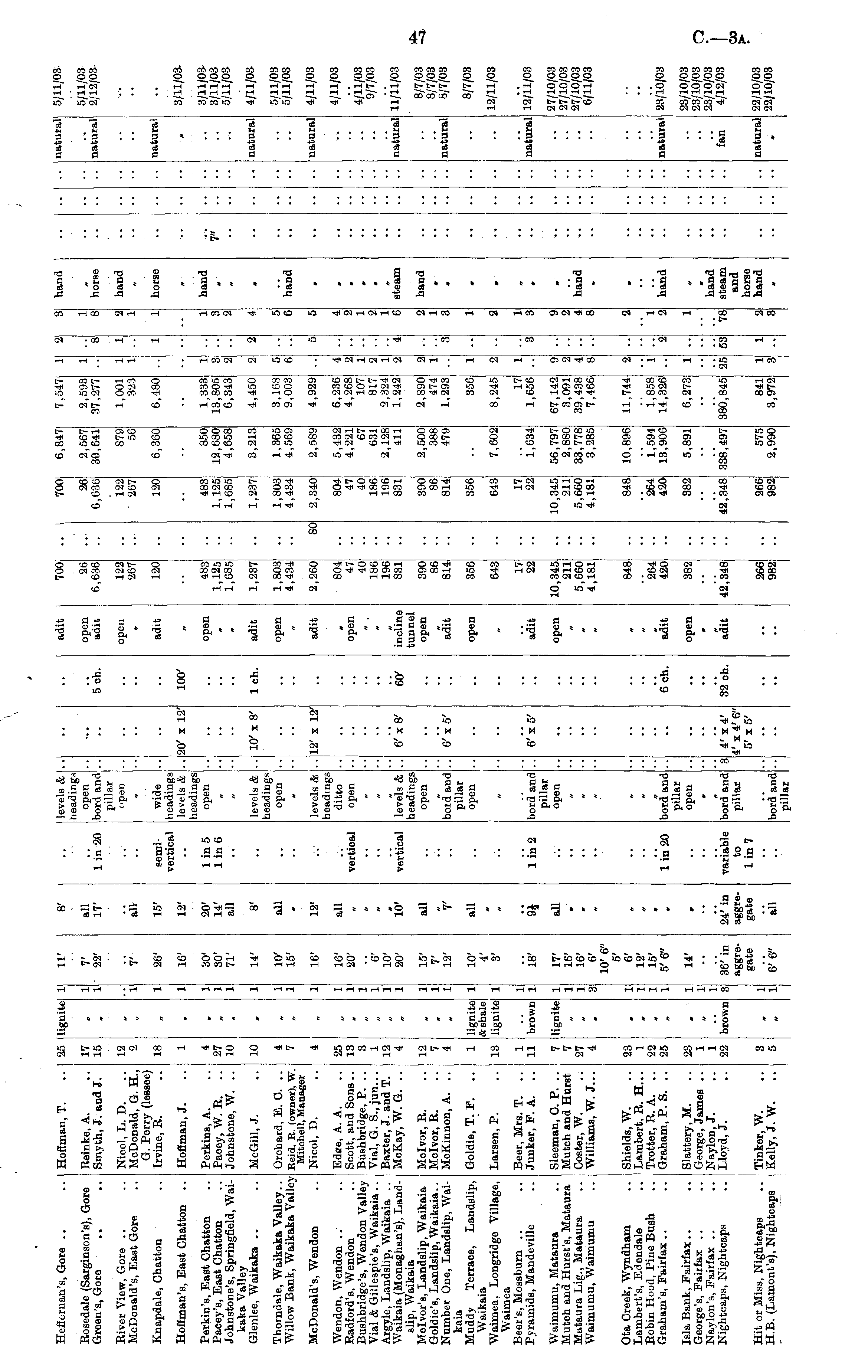 Hefiernan's, Gore Hoffman, T. 25 lignitei 11' 8' levels & headings open bord and pillar adit 700! 700 6,847 7,5471 hand natural 5/11/035/11/03 2/12/03 •• - Rosedale (Sarginson's), Gore Green's, Gore Reinke, A. Smyth, J. and J. 17 15 1 7' ■ 22' all 17' 1 in 20 5 oh. open adit 26 6,636 26 6,636 2,567 30,641 2,593 37,277 1 's ' horse natural River View, Gore McDonald's, East Gore Nieol, L. D. McDonald, G. H., G. Perry (lessee) Irvine, R. 12 2 open 122 267 122 ' 267 879 56 1,001 323 1 1 1 2 1 hand 'i 7' all •r Knapdale, Chattou IS // 26' 15' semivertical wide headings levels & headings open adit 120 120 6,360 6,480 1 horse natural Hoffman's, East Chatton .. Hoffman, J. 1 16' 12' 20' x 12' 100' • 3/11/03. Perkin's, East Chatton Pacey's, East Chatton Johnstone's, Springfield, Waikaka Valley Glenlee, Waikaka Perkins, A. Pacey, W. E. Johnstone, W. .. 4 27 10 m 30' 30' 71' 20' 14' all Iin5 Iin6 open 483 1,125 1,685 483 1,125 1,685 850 12,680 4,658 1,333 13,805 6,343 ' 1 3 2 hand r 3/11/03 3/11/03 5/11/03 1 1 1 •■ m ■ •• It McGill, J. 10 H 14' 8' levels & headings open 10' x 8' 1 oh. adit 1,237 1,237 3,213 4,450 2 * m natural 4/11/03 Thorndale, Waikaka Valley.. Willow Bank, Waikaka Valley Orchard, E. O. .. Reid, E. (owner), W. Mitchell, Manager Nicol, D. 4 7 1 1 10' 15' all open 1,803 4,434 1,803 4,434 1,365 4,569 3,168 9,003 5 6 5 6 5/11/03 5/11/03 hand McDonald's, Wendon 4 16' 12' levels & headings ditto open 12' x 12' adit 2,260| H 2,340 2,589 4,929 5 * natural 4/11/03 Wendon, Wendon Radford's, Wendon Bushbridge's, Wendon Valley Vial & Gillespie's, Waikaia .. Argyle, Landslip, Waikaia .. Waikaia (Monaghan's), Landslip, Waikaia Molvor's, Landslip, Waikaia Goldie's, Landslip, Waikaia.. Number One, Landslip, Waikaia Muddy Terraoe, Landslip, Waikaia Waimea, Longridge Village, Waimea Beer's, Mossburn Pyramids, Mandeville Edee, A. A. Scott, and Sons .. Bushbridge, P. .. Vial, G. S.,jun... Baxter, J. and T. McKay, W. G. .. 25 13 3 1 12 4 1 1 1 1 1 1 16' 20' all vertical open 804 47 40 186 196 831 804 47 40 186 196 831 5,432 4,221 67 631 2,128 411 6,236 4,268 107 817 2,324 1,242 4 2 1 2 1 2 4 2 1 2 1 6 4/11/03 6' 10' 20' .. 4/11/03 9/7/03 10' vertical levels & headings open 6'x8' 60' incline tunnel open 4 steam natural 11/11/03 Molvor, R. Molvor, R. McKinnon, A. .. 12 7 4 15' 12' all 390 86 814 390 86 814 2,500 388 479 2,890 474 1,293 2 1 2 1 3 hand 8/7/03 8/7/03 8/7/03 1 1 1 "r bold and pillar open 6'x5' adit .3 * natural „ Goldie, T. F. .. 1 lignite & shale lignite 10' 4' 3' all open 356 356 356 1 * 8/7/03 Larsen, P. 13 643 643 7,602 8,245 2 * 12/11/03 Beer, Mrs. T. .. Junker, P. A. 1 11 1 1 18' 94 lin2 bord and pillar open 6'x5' adit 17 22 17 22 l^634 17 1,656 1 3 1 3 natural 12/11/03 brown Waimumu, Mataura Mutch and Hurst's, Mataura Mataura Lig., Mataura Waimumu, Waimumu Sleeman, C. P. Mutch and Hurst Coster, W. Williams, W.J... 7 7 27 4 lignite 1 1 1 3 17' 16' 16' 6' 10' 6" 5' 6' 12' 15' 5'6" all open 10,345 211 5,660 4,181 30,345 211 5,660 4,181 56,797 2,880 33,778 3,285 67,142 3,091 39,438 7,466 9 2 4 S 9 2 4 8 hand 27/10/03 27/10/03 27/10/03 6/11/03 M 0 * Ota Creek, Wyndham Lambert's, Edendale Robin Hood, Pine Bush Graham's, Fairfax .. .. Shields, W. Lambert, R. H... Trotter, R. A. Graham, P. S. 23 1 22 25 1 1 1 1 848 '264 420! 848 '264 420 10,896 1,594 13,906 11,744 1,858 14,326 2 1 2 1 2 m m lin20 bord and pillar open 6ch. adit "2 hand natural 23/10/03 Isla Bank, Fairfax George's, Fairfax Nay Ion's, Fairfax Nightcaps, Nightcaps Slattery, M. George, James .. Naylon, J. Lloyd, J. 23 1 1 22 1 1 1 3 14' m • open m 382 382 42,348 5,891 338^497 6,273 380^845 1 25 •• 53 li "78 m hand steam and horse hand fan 23/10/03 23/10/03 23/10/03 4/12/03 brown 36' in aggregate 24' in aggregate variable to Iin7 bord and pillar '3| 4'x4' 4' x 4' 6" 5'x5' 32 oh. adit 42^348 Hit or Miss, Nightcaps H.B. (Lamont's), Nightcaps Tinker, W. Kelly, J. W. 3 5 1 1 6'" 6" all bord and pillar 266 982 266 982 575 2,990 841 3,972 1 3 1 i natural 22/10/03 22/10/03 » • • -. m .