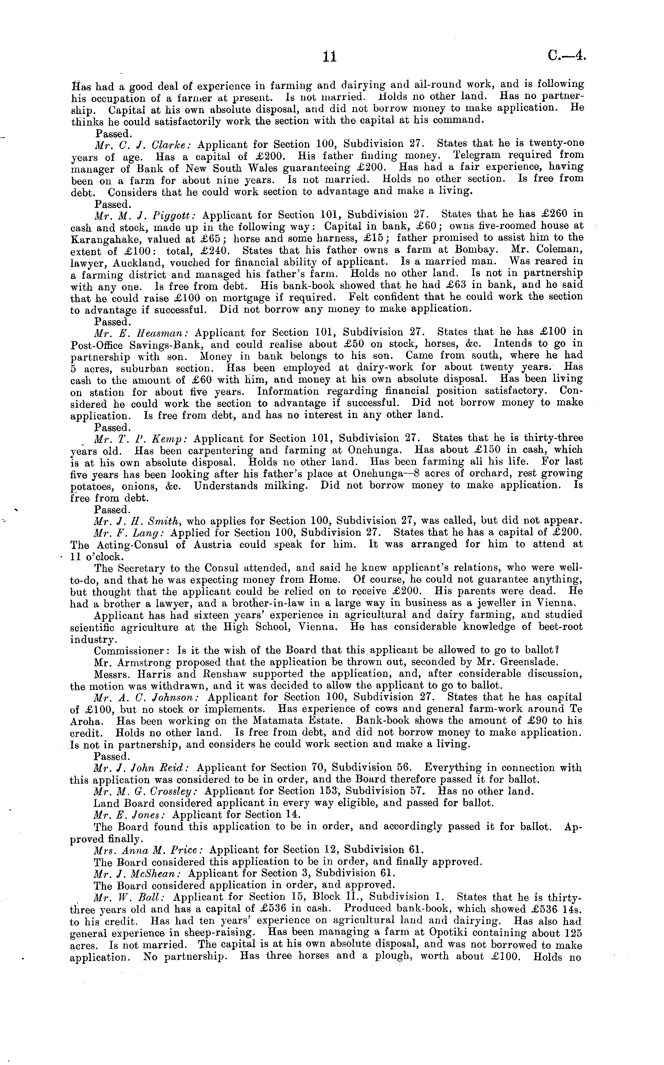 Has had a good deal of experience in farming and dairying and ail-round work, and is following his occupation of a farmer at present. Is not married. Holds no other land. Has no partnership. Capital at his own absolute disposal, and did not borrow money to make application. He thinks he could satisfactorily work the section with the capital at his command. Mr. G. J. Clarke: Applicant for Section 100, Subdivision 27. States that he is twenty-one years of age. Has a capital of £200. His father finding money. Telegram required from manager of Bank of New South Wales guaranteeing £200. Has had a fair experience, having been on a farm for about nine years. Is not married. Holds no other section. Is free from debt. Considers that he could work section to advantage and make a living. Passed. Mr. M. J. Piggott: Applicant for Section 101, Subdivision 27. States that he has £260 in cash and stock, made up in the following way: Capital in bank, £60; owns five-roomed house at Karangahake, valued at £65; horse and some harness, £15; father promised to assist him to the extent of £100: total, £240. States that his father owns a farm at Bombay. Mr. Coleman, lawyer, Auckland, vouched for financial ability of applicant. Is a married man. Was reared in a farming district and managed his father's farm. Holds no other land. Is not in partnership with any one. Is free from debt. His bank-book showed that he had £63 in bank, and he said that he could raise £100 on mortgage if required. Felt confident that he could work the section to advantage if successful. Did not borrow any money to make application. Passed. Mr. E. Heasman: Applicant for Section 101, Subdivision 27. States that he has £100 in Post-Office Savings-Bank, and could realise about £50 on stock, horses, &c. Intends to go in partnership with son. Money in bank belongs to his son. Came from south, where he had 5 acres, suburban section. Has been employed at dairy-work for about twenty years. Has cash to the amount of £60 with him, and money at his own absolute disposal. Has been living on station for about five years. Information regarding financial position satisfactory. Considered he could work the section to advantage if successful. Did not borrow money to make application. Is free from debt, and has no interest in any other land. Passed. Mr. T. P. Kemp: Applicant for Section 101, Subdivision 27. States that he is thirty-three years old. Has been carpentering and farming at Onehunga. Has about £150 in cash, which is at his own absolute disposal. Holds no other land. Has been farming all his life. For last five years has been looking after his father's place at Onehunga—B acres of orchard, rest growing potatoes, onions, &c. Understands milking. Did not borrow money to make application. Is free from debt. Passed. Mr. J. 11. Smith, who applies for Section 100, Subdivision 27, was called, but did not appear. Mr. F. Lang: Applied for Section 100, Subdivision 27. States that he has a capital of £200. The Acting-Consul of Austria could speak for him. It was arranged for him to attend at 11 o'clock. The Secretary to the Consul attended, and said he knew applicant's relations, who were well-to-do, and that he was expecting money from Home. Of course, he could not guarantee anything, but thought that the applicant could be relied on to receive £200. His parents were dead. He had a brother a lawyer, and a brother-in-law in a large way in business as a jeweller in Vienna. Applicant has had sixteen years' experience in agricultural and dairy farming, and studied scientific agriculture at the High School, Vienna. He has considerable knowledge of beet-root industry. Commissioner: Is it the wish of the Board that this applicant be allowed to go to ballot? Mr. Armstrong proposed that the application be thrown out, seconded by Mr. Greenslade. Messrs. Harris and Renshaw supported the application, and, after considerable discussion, the motion was withdrawn, and it was decided to allow the applicant to go to ballot. Mr. A. C. Johnson: Applicant for Section 100, Subdivision 27. States that he has capital of £100, but no stock or implements. Has experience of cows and general farm-work around Te Aroha. Has been working on the Matamata Estate. Bank-book shows the amount of £90 to his credit. Holds no other land. Is free from debt, and did not borrow money to make application. Is not in partnership, and considers he could work section and make a living. Passed. Mr. J. John Reid: Applicant for Section 70, Subdivision 56. Everything in connection with this application was considered to be in order, and the Board therefore passed it for ballot. Mr. M. G. Crossley: Applicant for Section 153, Subdivision 57. Has no other land. Land Board considered applicant in every way eligible, and passed for ballot. Mr. E. Jones: Applicant for Section 14. The Board found this application to be in order, and accordingly passed it for ballot. Approved finally. Mrs. Anna M. Price: Applicant for Section 12, Subdivision 61. The Board considered this application to be in order, and finally approved. Mr. J. McShean: Applicant for Section 3, Subdivision 61. The Board considered application in order, and approved. Mr. W. Ball: Applicant for Section 15, Block 11., Subdivision 1. States that he is thirtythree years old and has a capital of £536 in cash. Produced bank-book, which showed £536 14s. to his credit. Has had ten years' experience on agricultural land and dairying. Has also had general experience in sheep-raising. Has been managing a farm at Opotiki containing about 125 acres. Is not married. The capital is at his own absolute disposal, and was not borrowed to make application. No partnership. Has three horses and a plough, worth about £100. Holds no