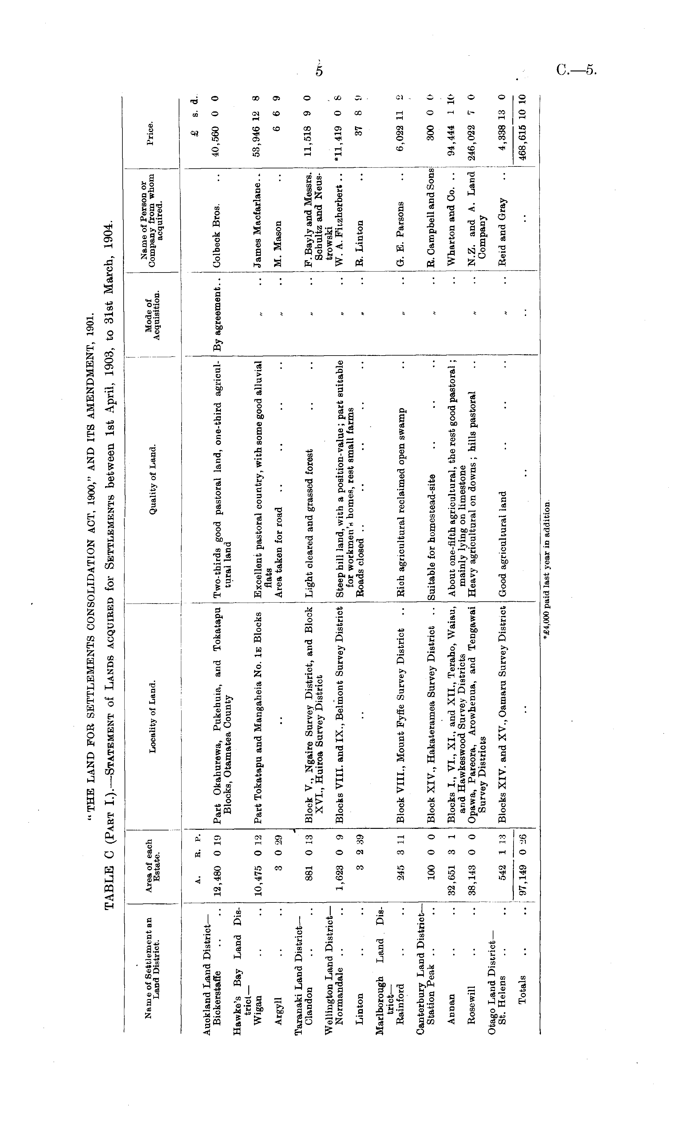 "THE LAND FOR SETTLEMENTS CONSOLIDATION ACT, 1900," AND ITS AMENDMENT, 1901. TABLE C (Part I.).—Statement of Lands acquired for Settlements between 1st April, 1903, to 31st March, 1904.