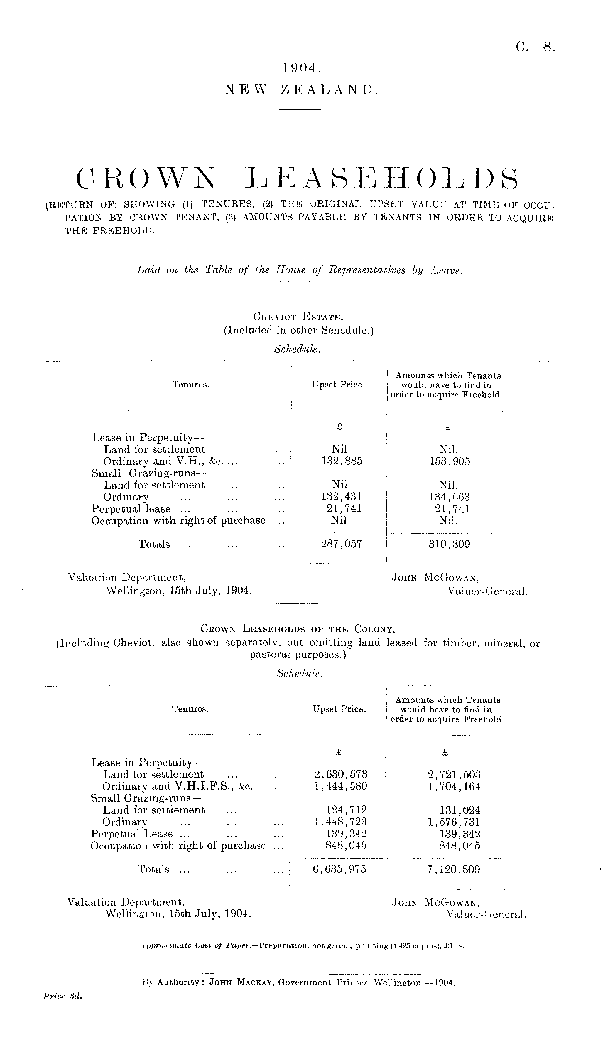 Valuation Department, John McGowan, Wellington, 15th July, 1904. Valuer-General.