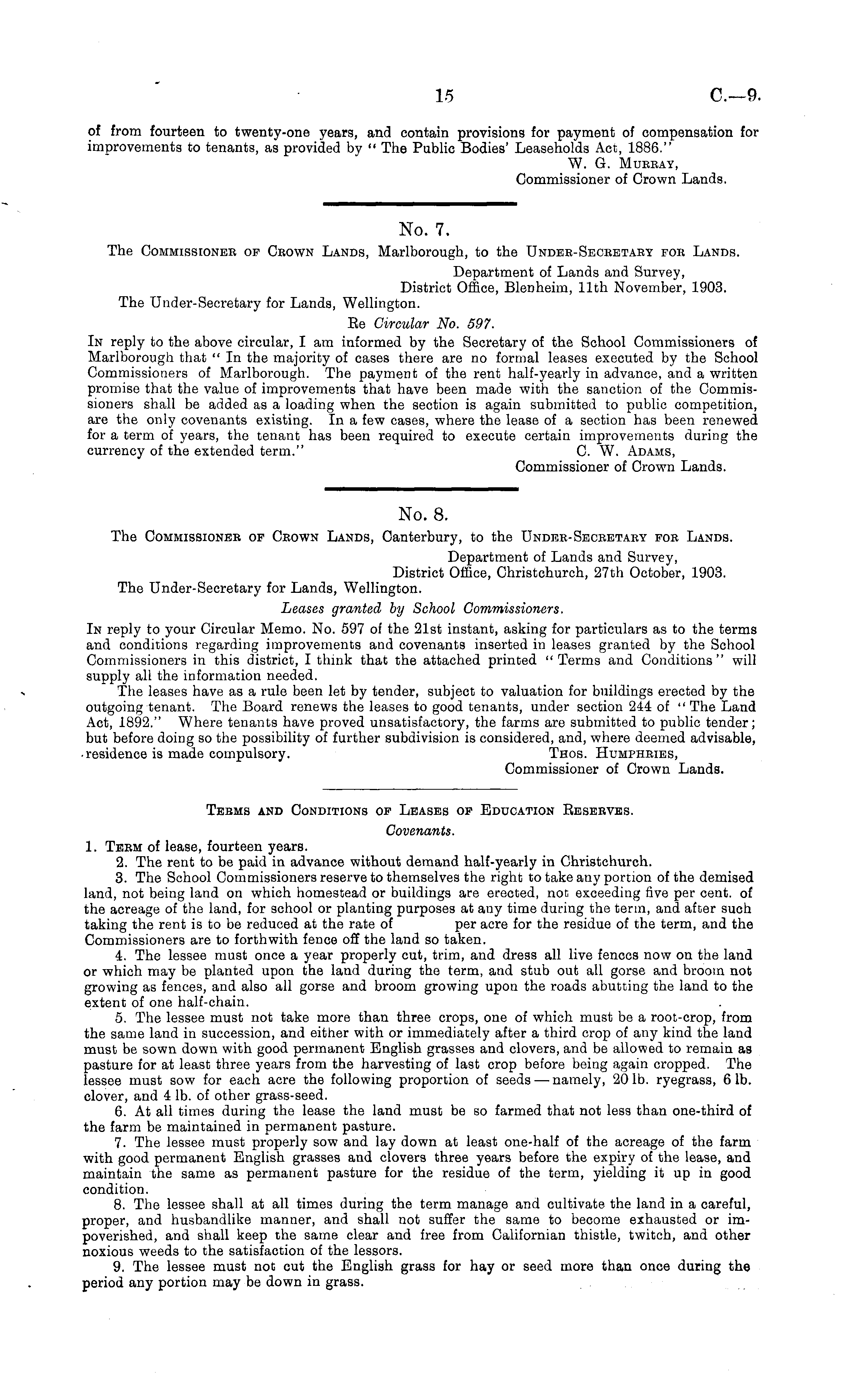 No. 8. The Commissioner of Crown Lands, Canterbury, to the Under-Secretary for Lands. Department of Lands and Survey, District Office, Christchurch, 27th October, 1903. The Under-Secretary for Lands, Wellington. Leases granted by School Commissioners. In reply to your Circular Memo. No. 597 of the 21st instant, asking for particulars as to the terms and conditions regarding improvements and covenants inserted in leases granted by the School Commissioners in this district, I think that the attached printed "Terms and Conditions" will supply all the information needed. The leases have as a rule been let by tender, subject to valuation for buildings erected by the outgoing tenant. The Board renews the leases to good tenants, under section 244 of " The Land Act, 1892." Where tenants have proved unsatisfactory, the farms are submitted to public tender; but before doing so the possibility of further subdivision is considered, and, where deemed advisable, residence is made compulsory. Thos. Humphries, Commissioner of Crown Lands.