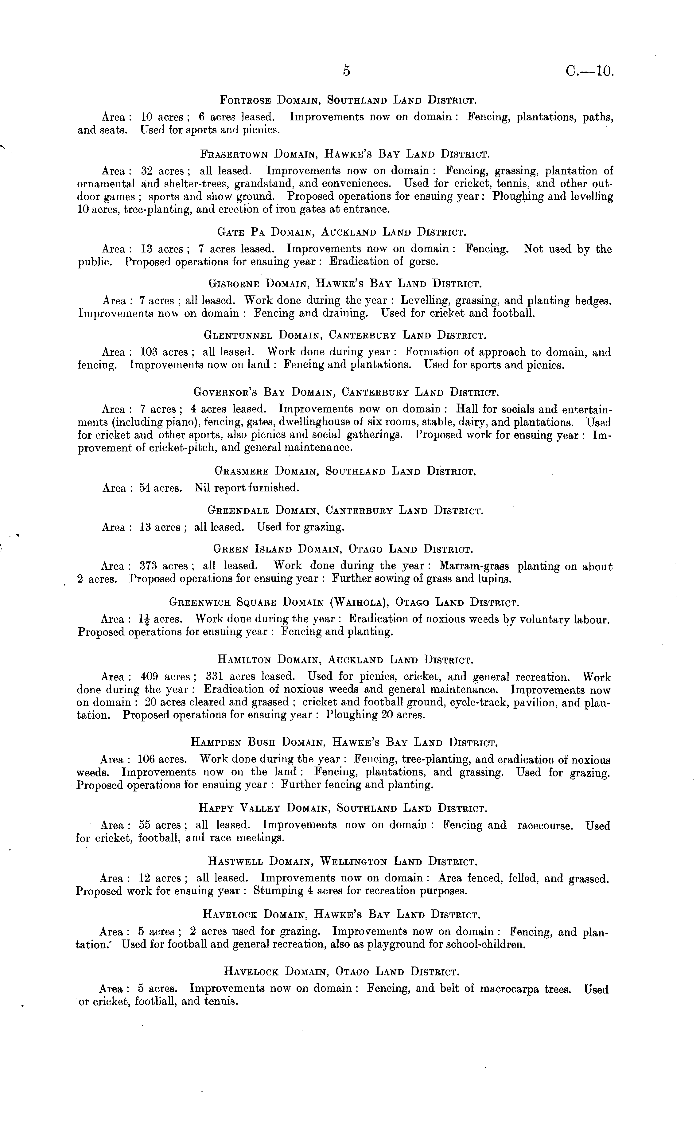 Fortrose Domain, Southland Land District. Area :10 acres ; 6 acres leased. Improvements now on domain : Fencing, plantations, paths, and seats. Used for sports and picnics. Frasbrtown Domain, Hawke's Bay Land District. Area :32 acres ; all leased. Improvements now on domain : Fencing, grassing, plantation of ornamental and shelter-trees, grandstand, and conveniences. Used for cricket, tennis, and other outdoor games ; sports and show ground. Proposed operations for ensuing year : Ploughing and levelling 10 acres, tree-planting, and erection of iron gates at entrance. Gate Pα Domain, Auckland Land District. Area :13 acres ; 7 acres leased. Improvements now on domain : Fencing. Not used by the public. Proposed operations for ensuing year : Eradication of gorse. Gisborne Domain, Hawke's Bay Land District. Area : 7 acres ; all leased. Work done during the year : Levelling, grassing, and planting hedges. Improvements now on domain : Fencing and draining. Used for cricket and football. Glentunnel Domain, Canterbury Land District. Area : 103 acres ; all leased. Work done during year : Formation of approach to domain, and fencing. Improvements now on land : Fencing and plantations. Used for sports and picnics. Governor's Bay Domain, Canterbury Land District. Area : 7 acres ; 4 acres leased. Improvements now on domain : Hall for socials and entertainments (including piano), fencing, gates, dwellinghouse of six rooms, stable, dairy, and plantations. Used for cricket and other sports, also picnics and social gatherings. Proposed work for ensuing year : Improvement of cricket-pitch, and general maintenance. Grasmere Domain, Southland Land District. Area :54 acres. Nil report furnished. Greendale Domain, Canterbury Land District. Area :13 acres ; all leased. Used for grazing. Green Island Domain, Otago Land District. Area : 373 acres ; all leased. Work done during the year : Marram-grass planting on about 2 acres. Proposed operations for ensuing year : Further sowing of grass and lupins. Greenwich Square Domain (Waihola), Otago Land District. Area : acres. Work done during the year : Eradication of noxious weeds by voluntary labour. Proposed operations for ensuing year : Fencing and planting. Hamilton Domain, Auckland Land District. Area : 409 acres ; 331 acres leased. Used for picnics, cricket, and general recreation. Work done during the year : Eradication of noxious weeds and general maintenance. Improvements now on domain : 20 acres cleared and grassed ; cricket and football ground, cycle-track, pavilion, and plantation. Proposed operations for ensuing year : Ploughing 20 acres. Hampden Bush Domain, Hawke's Bay Land District. Area : 106 acres. Work done during the year : Fencing, tree-planting, and eradication of noxious weeds. Improvements now on the land : Fencing, plantations, and grassing. Used for grazing. Proposed operations for ensuing year : Further fencing and planting. Happy Valley Domain, Southland Land District. Area : 55 acres ; all leased. Improvements now on domain : Fencing and racecourse. Used for cricket, football, and race meetings. Hastwell Domain, Wellington Land District. Area :12 acres ; all leased. Improvements now on domain : Area fenced, felled, and grassed. Proposed work for ensuing year : Stumping 4 acres for recreation purposes. Havelock Domain, Hawke's Bay Land District. Area : 5 acres ; 2 acres used for grazing. Improvements now on domain : Fencing, and plantation.' Used for football and general recreation, also as playground for school-children. Havelock Domain, Otago Land District. Area : 5 acres. Improvements now on domain : Fencing, and belt of macrocarpa trees. Used or cricket, football, and tennis.