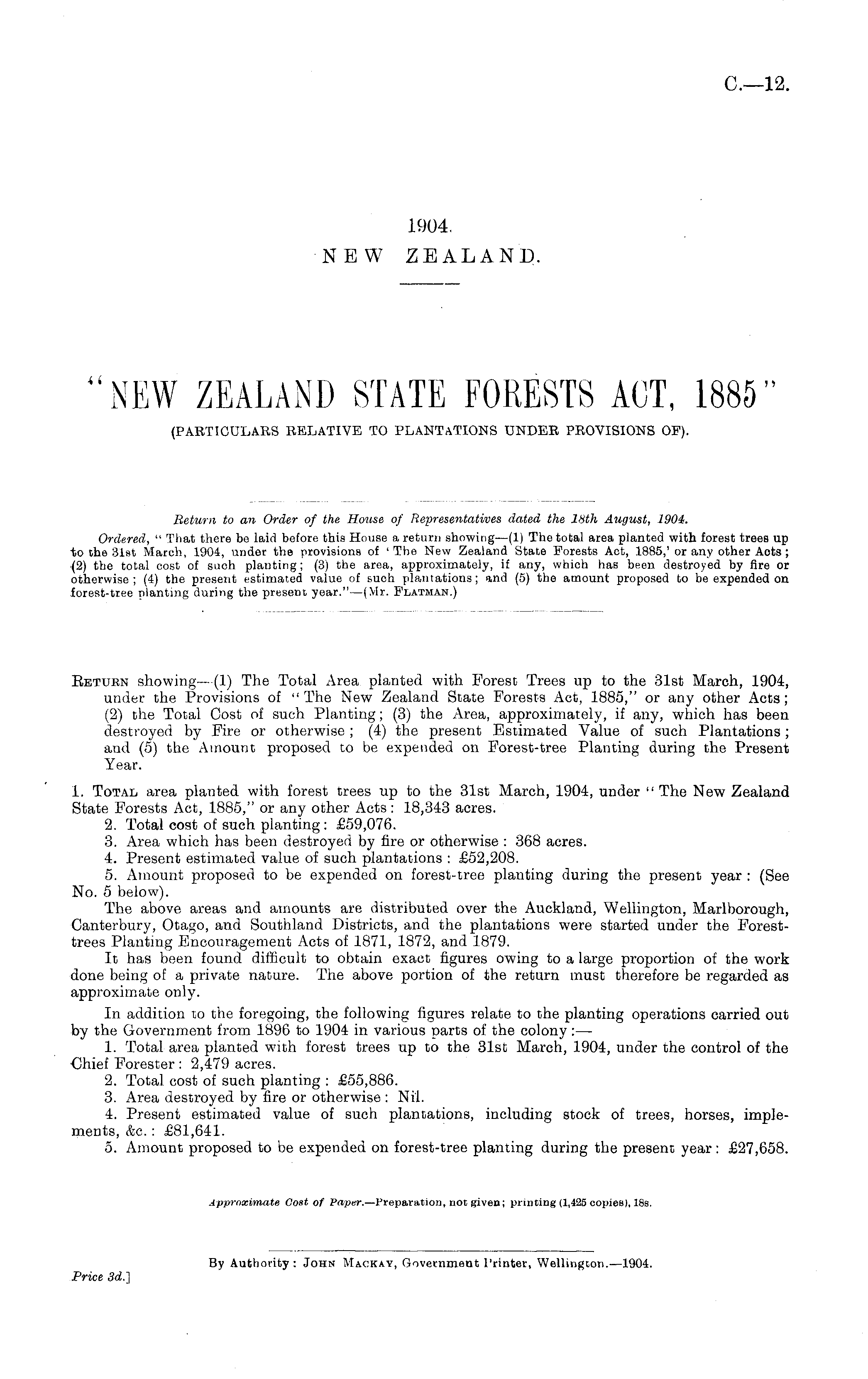 Return showing—(l) The Total Area planted with Forest Trees up to the 31st March, 1904, under the Provisions of "The New Zealand State Forests Act, 1885," or any other Acts; (2) the Total Cost of such Planting; (3) the Area, approximately, if any, which has been destroyed by Fire or otherwise ; (4) the present Estimated Value of such Plantations; and (5) the Amount proposed to be expended on Forest-tree Planting during the Present Year. 1. Total area planted with forest trees up to the 31st March, 1904, under " The New Zealand State Forests Act, 1885," or any other Acts : 18,343 acres. 2. Total cost of such planting : £59,076. 3. Area which has been destroyed by fire or otherwise : 368 acres. 4. Present estimated value of such plantations : £52,208. 5. Amount proposed to be expended on forest-tree planting during the present year : (See No. 5 below). The above areas and amounts are distributed over the Auckland, Wellington, Marlborough, Canterbury, Otago, and Southland Districts, and the plantations were started under the Foresttrees Planting Encouragement Acts of 1871, 1872, and 1879. It has been found difficult to obtain exact figures owing to a large proportion of the work done being of a private nature. The above portion of the return must therefore be regarded as approximate only. In addition to the foregoing, the following figures relate to the planting operations carried out by the Government from 1896 to 1904 in various parts of the colony : — 1. Total area planted with forest trees up to the 31st March, 1904, under the control of the Chief Forester : 2,479 acres. 2. Total cost of such planting : £55,886. 3. Area destroyed by fire or otherwise : Nil. 4. Present estimated value of such plantations, including stock of trees, horses, implements, &c. : £81,641. 5. Amount proposed to be expended on forest-tree planting during the present year: £27,658. Approximate Cost of Paper. —Preparation, not given; printing (1,425 copies), 18s.