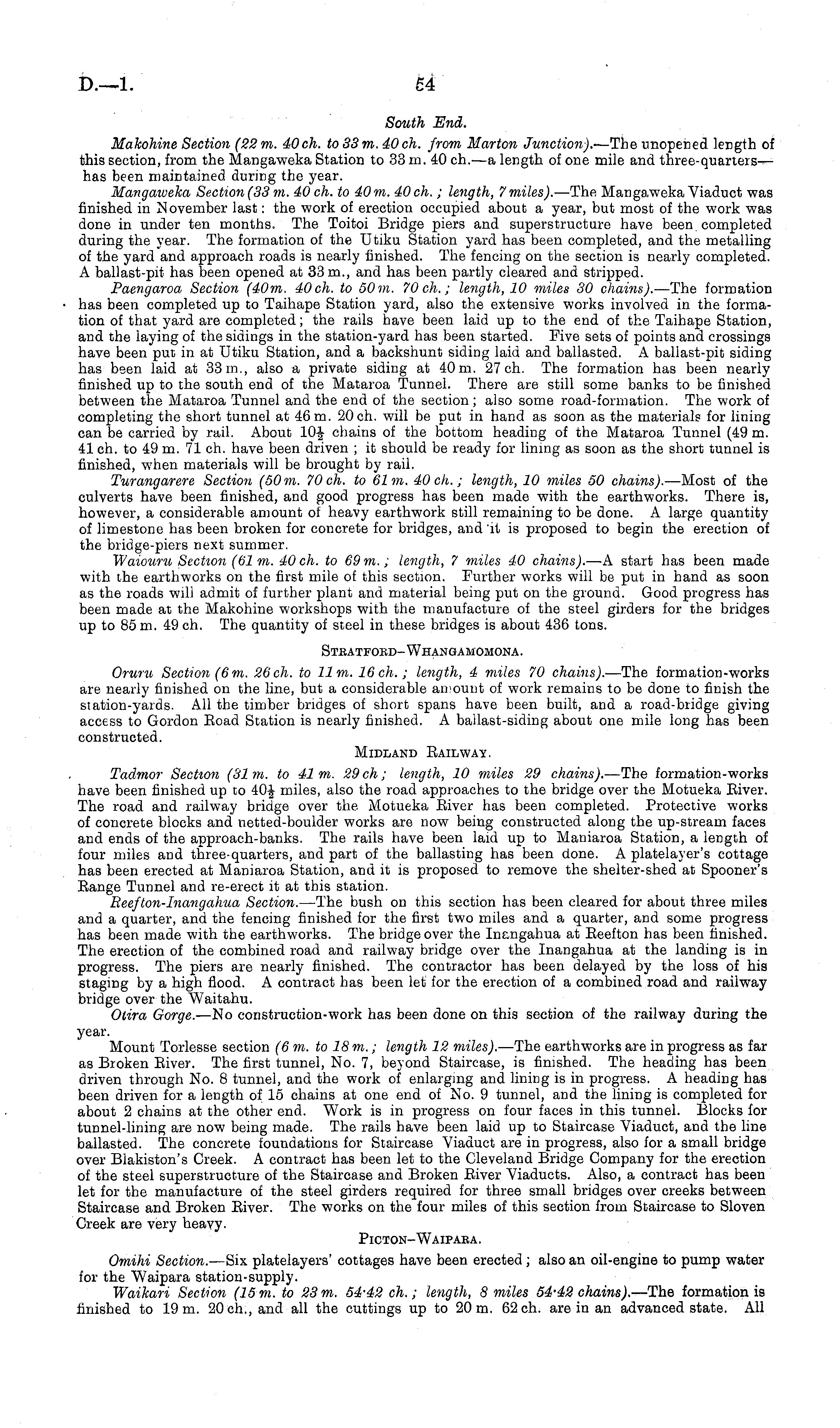 South End. Makohine Section (22 m. 40ch. to 33 m. 40 eh. from Marton Junction). —The unopened length of this section, from the Mangaweka Station to 33 m. 40 eh.—a length of one mile and three-quarters— has been maintained during the year. Mangaweka Section (33 m. 40 eh. to 40 m. 40 eh.; length, 7 miles). —The Mangaweka Viaduct was finished in November last: the work of erection occupied about a year, but most of the work was done in under ten months. The Toitoi Bridge piers and superstructure have been completed during the year. The formation of the Utiku Station yard has been completed, and the metalling of the yard and approach roads is nearly finished. The fencing on the section is nearly completed. A ballast-pit has been opened at 33 m., and has been partly cleared and stripped. Paengaroa Section (40m. 40 eh. to 50 m. 70 eh.; length, 10 miles 30 chains). —The formation has been completed up to Taihape Station yard, also the extensive works involved in the formation of that yard are completed; the rails have been laid up to the end of the Taihape Station, and the laying of the sidings in the station-yard has been started. Five sets of points and crossings have been put in at Utiku Station, and a backshunt siding laid and ballasted. A ballast-pit siding has been laid at 33 m., also a private siding at 40 m. 27 eh. The formation has been nearly finished up to the south end of the Mataroa Tunnel. There are still some banks to be finished between the Mataroa Tunnel and the end of the section; also some road-formation. The work of completing the short tunnel at 46 m. 20 eh. will be put in hand as soon as the materials for lining can be carried by rail. About 10-J chains of the bottom heading of the Mataroa Tunnel (49 m. 41 eh. to 49 m. 71 eh. have been driven ; it should be ready for lining as soon as the short tunnel is finished, when materials will be brought by rail. Turangarere Section (50 m. 70 eh. to 61m. 40 eh.; length, 10 miles 50 chains). —Most of the culverts have been finished, and good progress has been made with the earthworks. There is, however, a considerable amount of heavy earthwork still remaining to be done. A large quantity of limestone has been broken for concrete for bridges, and it is proposed to begin the erection of the bridge-piers next summer. Waiouru Section (61 m. 40 eh. to 69 m.; length, 7 miles 40 chains).- —A start has been made with the earthworks on the first mile of this section. Further works will be put in hand as soon as the roads will admit of further plant and material being put on the ground. Good progress has been made at the Makohine workshops with the manufacture of the steel girders for the bridges up to 85 m. 49 eh. The quantity of steel in these bridges is about 436 tons. Steatpoed-Whangamomona. Oruru Section (6 m. 26 eh. to 11m. 16 eh.; length, 4 miles 70 chains).- —The form ation-works are nearly finished on the line, but a considerable amount of work remains to be done to finish the station-yards. All the timber bridges of short spans have been built, and a road-bridge giving access to Gordon Eoad Station is nearly finished. A ballast-siding about one mile long has been constructed. Midland Eailway. Tadmor Section (31m. to 41m. 29ch; length, 10 miles 29 chains). —The formation-works have been finished up to 40J miles, also the road approaches to the bridge over the Motueka Eiver. The road and railway bridge over the Motueka Eiver has been completed. Protective works of concrete blocks and netted-boulder works are now being constructed along the up-stream faces and ends of the approach-banks. The rails have been laid up to Maniaroa Station, a length of four miles and three-quarters, and part of the ballasting has been done. A platelayer's cottage has been erected at Maniaroa Station, and it is proposed to remove the shelter-shed at Spooner's Eange Tunnel and re-erect it at this station. Reefton-Inangahua Section. —The bush on this section has been cleared for about three miles and a quarter, and the fencing finished for the first two miles and a quarter, and some progress has been made with the earthworks. The bridge over the Inangahua at Eeefton has been finished. The erection of the combined road and railway bridge over the Inangahua at the landing is in progress. The piers are nearly finished. The contractor has been delayed by the loss of his staging by a high flood. A contract has been let for the erection of a combined road and railway bridge over the Waitahu. Otira Gorge.—No construction-work has been done on this section of the railway during the year. Mount Torlesse section (6 m. to 18 m.; length 12 miles). —The earthworks are in progress as far as Broken Eiver. The first tunnel, No. 7, beyond Staircase, is finished. The heading has been driven through No. 8 tunnel, and the work of enlarging and lining is in progress. A heading has been driven for a length of 15 chains at one end of No. 9 tunnel, and the lining is completed for about 2 chains at the other end. Work is in progress on four faces in this tunnel. Blocks for tunnel-lining are now being made. The rails have been laid up to Staircase Viaduct, and the line ballasted. The concrete foundations for Staircase Viaduct are in progress, also for a small bridge over Blakiston's Creek. A contract has been let to the Cleveland Bridge Company for the erection of the steel superstructure of the Staircase and Broken Eiver Viaducts. Also, a contract has been let for the manufacture of the steel girders required for three small bridges over creeks between Staircase and Broken Eiver. The works on the four miles of this section from Staircase to Sloven Creek are very heavy. Picton- Waipaea . Omihi Section. —Six platelayers' cottages have been erected ; also an oil-engine to pump water for the Waipara station-supply. Waikari Section (15m. to 23 m. 54-42 eh.; length, 8 miles 54-42 chains). —The formation is finished to 19 m. 20 eh., and all the cuttings up to 20 m.