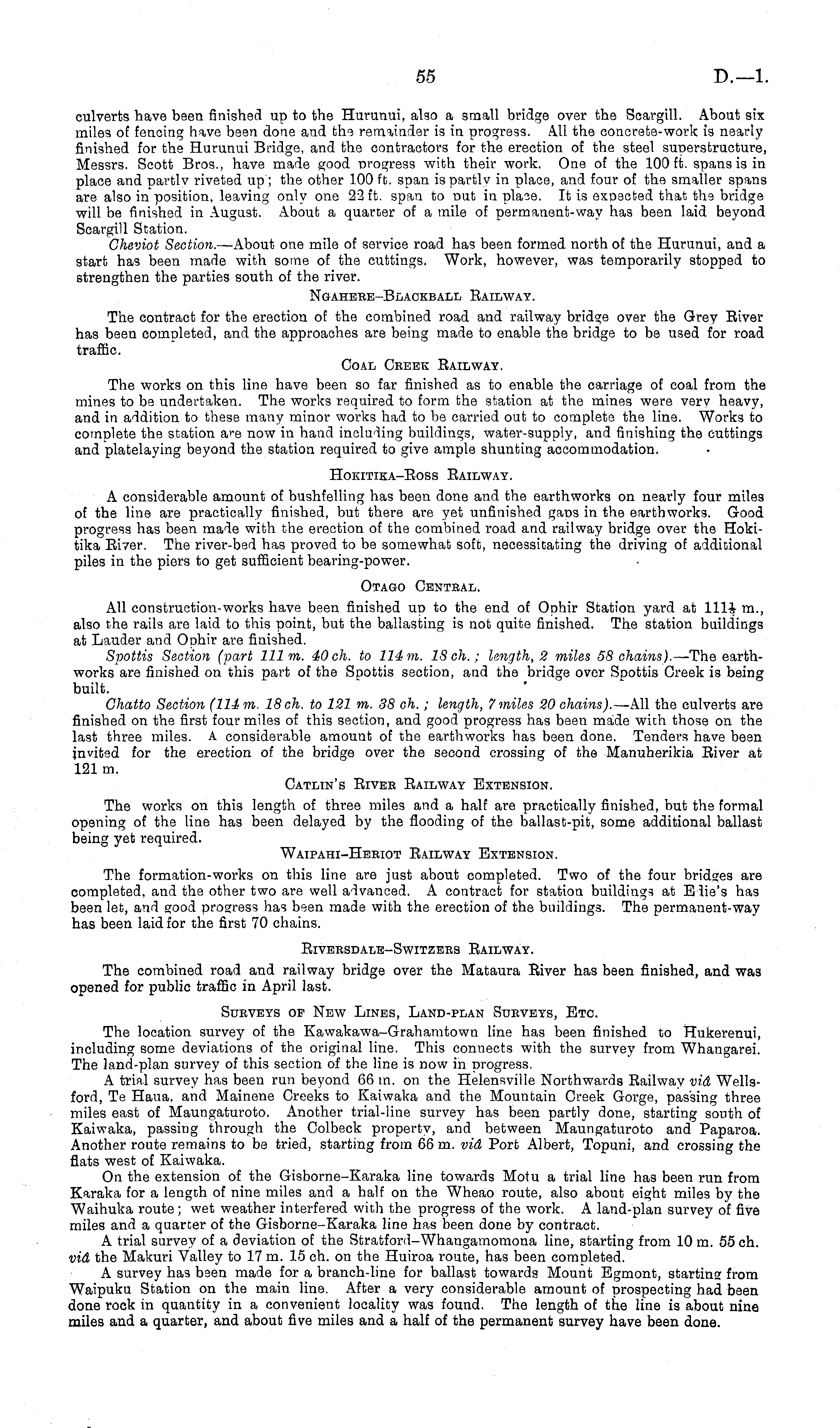 culverts have been finished up to the Hurunui, also a small bridge over the Scargill. About six miles of fencing have been done and the remainder is in progress. All the coucrete-work is nearly finished for the Hurunui Bridge, and the contractors for the erection of the steel superstructure, Messrs. Scott Bros., have made good nrogress with their work. One of the 100 ft. spans is in place and partly riveted up; the other 100 ft. span ispartlv in place, and four of the smaller spans are also in position, leaving only one 22 ft. span to nut in place. It is expected that the bridge will be finished in August. About a quarter of a mile of permanent-way has been laid beyond Scargill Station. Cheviot Section. —About one mile of service road has been formed north of the Hurunui, and a start has been made with some of the cuttings. Work, however, was temporarily stopped to strengthen the parties south of the river. Ngaheee-Blackball Eailway. The contract for the erection of the combined road and railway bridge over the Grey Eiver has been completed, and the approaches are being made to enable the bridge to be used for road traffic. Coal Cbeee: Eailway. The works on this line have been so far finished as to enable the carriage of coal from the mines to be undertaken. The works required to form the station at the mines were very heavy, and in addition to these many minor works had to be carried out to complete the line. Works to complete the station are now in hand including buildings, water-supply, and finishing the cuttings and platelaying beyond the station required to give ample shunting accommodation. Hokitika-Eoss Eailway. A considerable amount of bushfelling has been done and the earthworks on nearly four miles of the line are practically finished, but there are yet unfinished garjs in the earthworks. Good progress has been made with the erection of the combined road and railway bridge over the Hokitika Eiver. The river-bed has proved to be somewhat soft, necessitating the driving of additional piles in the piers to get sufficient bearing-power. Otago Centeal. All construction-works have been finished up to the end of Ophir Station yard at llli m., also the rails are laid to this point, but the ballasting is not quite finished. The station buildings at Lauder and Ophir are finished. Spottis Section, (part 111 m. 40 eh. to 114 m. IS eh.; length, 2 miles 58 chains). —The earthworks are finished on this part of the Spottis section, and the bridge over Spottis Creek is being built. Chatto Section (114 m. 18 eh. to 121 m. 38 eh.; length, 7 miles 20 chains). —All the culverts are finished on the first four miles of this section, and good progress has been made with those on the last three miles. A considerable amount of the earthworks has been done. Tenders have been invited for the erection of the bridge over the second crossing of the Manuherikia Eiver at 121 m. Catlin's Eivee Eailway Extension. The works on this length of three miles and a half are practically finished, but the formal opening of the line has been delayed by the flooding of the ballast-pit, some additional ballast being yet required. Waipahi-Heeiot Eailway Extension. The formation-works on this line are just about completed. Two of the four bridges are completed, and the other two are well advanced. A contract for station buildings at E He's has been let, and good progress has been made with the erection of the buildings. The permanent-way has been laid for the first 70 chains. EIVEESDALE-SwiTZEES EAILWAY. The combined road and railway bridge over the Mataura Eiver has been finished, and was opened for public traffic in April last. Sueveys op New Lines, Land-plan Sueveys, Etc. The location survey of the Kawakawa-Grahamtown line has been finished to Hukerenui, including some deviations of the original line. This connects with the survey from Whangarei. The land-plan survey of this section of the line is now in progress. A trial survey has been run beyond 66 m. on the Helensville Northwards Eailway vid Wellsford, Te Haua. and Mainene Creeks to Kaiwaka and the Mountain Creek Gorge, passing three miles east of Maungaturoto. Another trial-line survey has been partly done, starting south of Kaiwaka, passing through the Colbeck property, and between Maungaturoto and Paparoa. Another route remains to be tried, starting from 66 m. vid Port Albert, Topuni, and crossing the flats west of Kaiwaka. On the extension of the Gisborne-Karaka line towards Motu a trial line has been run from Karaka for a length of nine miles and a half on the Wheao route, also about eight miles by the Waihuka route; wet weather interfered with the progress of the work. A land-plan survey of five miles and a quarter of the Gisborne-Karaka line has been done by contract. A trial survey of a deviation of the Stratford-Whangamomona line, starting from 10 m. 55 eh. vid the Makuri Valley to 17 m. 15 eh. on the Huiroa route, has been completed. A survey has been made for a branch-line for ballast towards Mount Egmont, startina: from Waipuku Station on the main line. After a very considerable amount of prospecting had been done rock in quantity in a convenient locality was found. The length of the line is about nine miles and a quarter, and about five miles and a half of the permanent survey have been done.