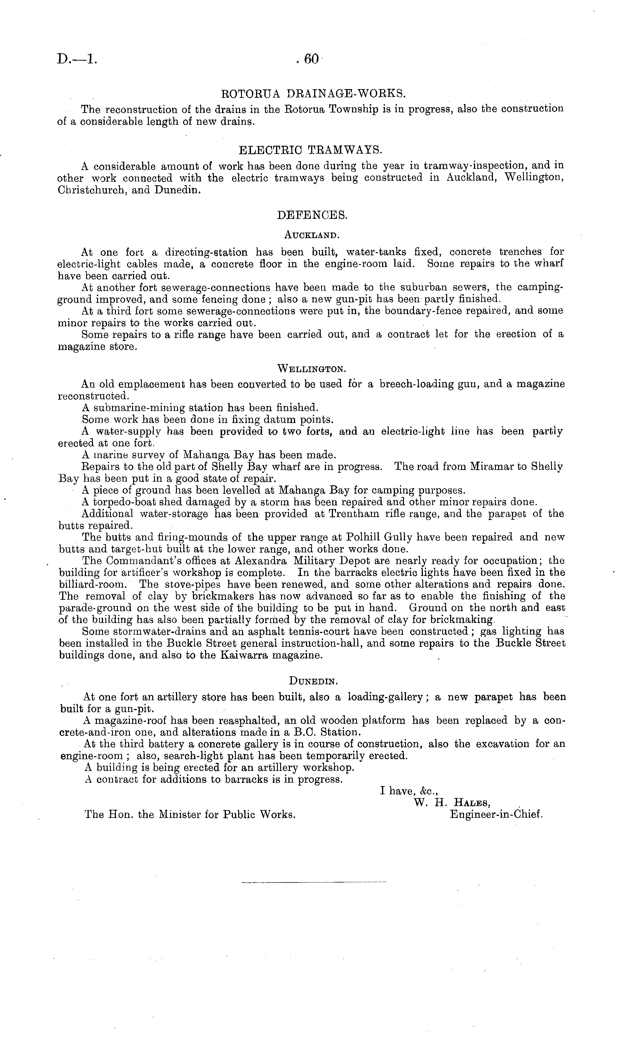EOTOEUA DEAINAGE-WOEKS. The reconstruction of the drains in the Eotorua Township is in progress, also the construction of a considerable length of new drains. ELECTEIC TEAMWAYS. A considerable amount of work has been done during the year in tramway-inspection, and in other work connected with the electric tramways being constructed in Auckland, Wellington, Christchurch, and Dunedin. DEFENCES. Auckland. At one fort a directing-station has been built, water-tanks fixed, concrete trenches for electric-light cables made, a concrete floor in the engine-room laid. Some repairs to the wharf have been carried out. At another fort sewerage-connections have been made to the suburban sewers, the campingground improved, and some fencing done ; also a new gun-pit has been partly finished. At a third fort some sewerage-connections were put in, the boundary-fence repaired, and some minor repairs to the works carried out. Some repairs to a rifle range have been carried out, and a contract let for the erection of a magazine store. Wellington. An old emplacement has been converted to be used for a breech-loading gun, and a magazine reconstructed. A submarine-mining station has been finished. Some work has been done in fixing datum points. A water-supply has been provided to two forts, and an electric-light line has been partly erected at one fort. A marine survey of Mahanga Bay has been made. Eepairs to the old part of Shelly Bay wharf are in progress. The road from Miramar to Shelly Bay has been put in a good state of repair. A piece of ground has been levelled at Mahanga Bay for camping purposes. A torpedo-boat shed damaged by a storm has been repaired and other minor repairs done. Additional water-storage has been provided at Trentham rifle range, and the parapet of the butts repaired. The butts and firing-mounds of the upper range at Polhill Gully have been repaired and new butts and target-hut built at the lower range, and other works done. The Commandant's offices at Alexandra Military Depot are nearly ready for occupation; the building for artificer's workshop is complete. In the barracks electric lights have been fixed in the billiard-room. The stove-pipes have been renewed, and some other alterations and repairs done. The removal of clay by brickmakers has now advanced so far as to enable the finishing of the parade-ground on the west side of the building to be put in hand. Ground on the north and east of the building has also been partially formed by the removal of clay for brickmaking. Some stormwater-drains and an asphalt tennis-court have been constructed ; gas lighting has been installed in the Buckle Street general instruction-hall, and some repairs to the Buckle Street buildings done, and also to the Kaiwarra magazine. Dunedin. At one fort an artillery store has been built, also a loading-gallery ; a new parapet has been built for a gun-pit. A magazine-roof has been reasphalted, an old wooden platform has been replaced by a con-crete-and-iron one, and alterations made in a B.C. Station. At the third battery a concrete gallery is in course of construction, also the excavation for an engine-room ; also, search-light plant has been temporarily erected. A building is being erected for an artillery workshop. A contract for additions to barracks is in progress. I have, &c, W. H. Hales, The Hon. the Minister for Public Works. Engineer-in-Chief.