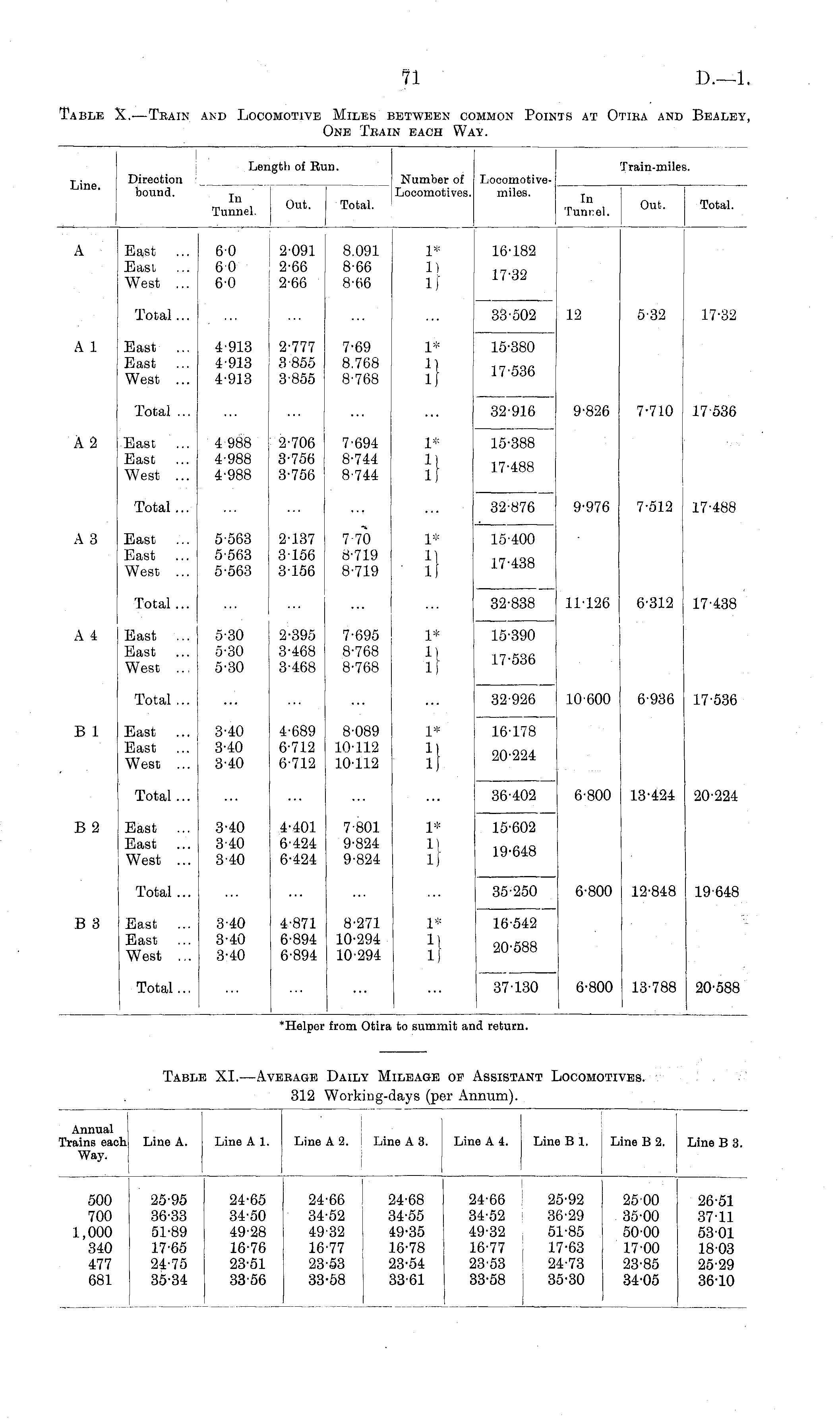 Line. Length of Run. Direction bound. T Tunnel. Out - Total - Number of Locomotives. Looomotive-Train-miles. miles. In Tunnel. Out. Total. Bast Easi West ... 60 60 6-0 2-091 2-66 2-66 8.091 8-66 8-66 1* 1) 1) 16-182 17-32 Total... 33-502 13 5-32 17-32 A 1 Bast Bast ... West ... 4-913 4-913 4-913 2-777 3-855 3-855 7-69 8.768 8-768 1* it 15-380 17-536 Total ... 32-916 9-826 7-710 17536 A2 Bast East West ... 4 988 4-988 4-988 2-706 3-756 3-756 7-694 8-744 8-744 1 J ' C SI 15-388 17-488 Total... 32-876 9-976 7-512 17-488 A3 East East West ... 5-563 5-563 5-563 2-137 3-156 3156 7-70 8-719 8-719 11 15400 17-438 Total... 11-126 32-838 6-312 17-438 A 4 Bast ... Bast ... West .., 5-30 5-30 5-30 2-395 3-468 3-468 7-695 8-768 8-768 1* 1) 1] 15-390 17-536 Total ... 32-926 10-600 6-936 17-536 B 1 East ... East West ... 3-40 3-40 3-40 4-689 6-712 6-712 8-089 10-112 10-112 1* 1} 16-178 20-224 Total ... 36-402 6-800 13-424 20-224 B 2 Bast East West ... 3-40 3-40 3-40 4-401 6-424 6-424 7-801 9-824 9-824 1* l) lj 15-602 19-648 Total ... 35-250 12-848 6-800 19 648 B 3 East Bast West ... 3-40 3-40 3-40 4-871 6-894 6-894 8-271 10-294 10-294 1* 1! 16-542 20-588 Total... 6-800 37-130 13-788 20-588 'Helper from Otira to summit and return.