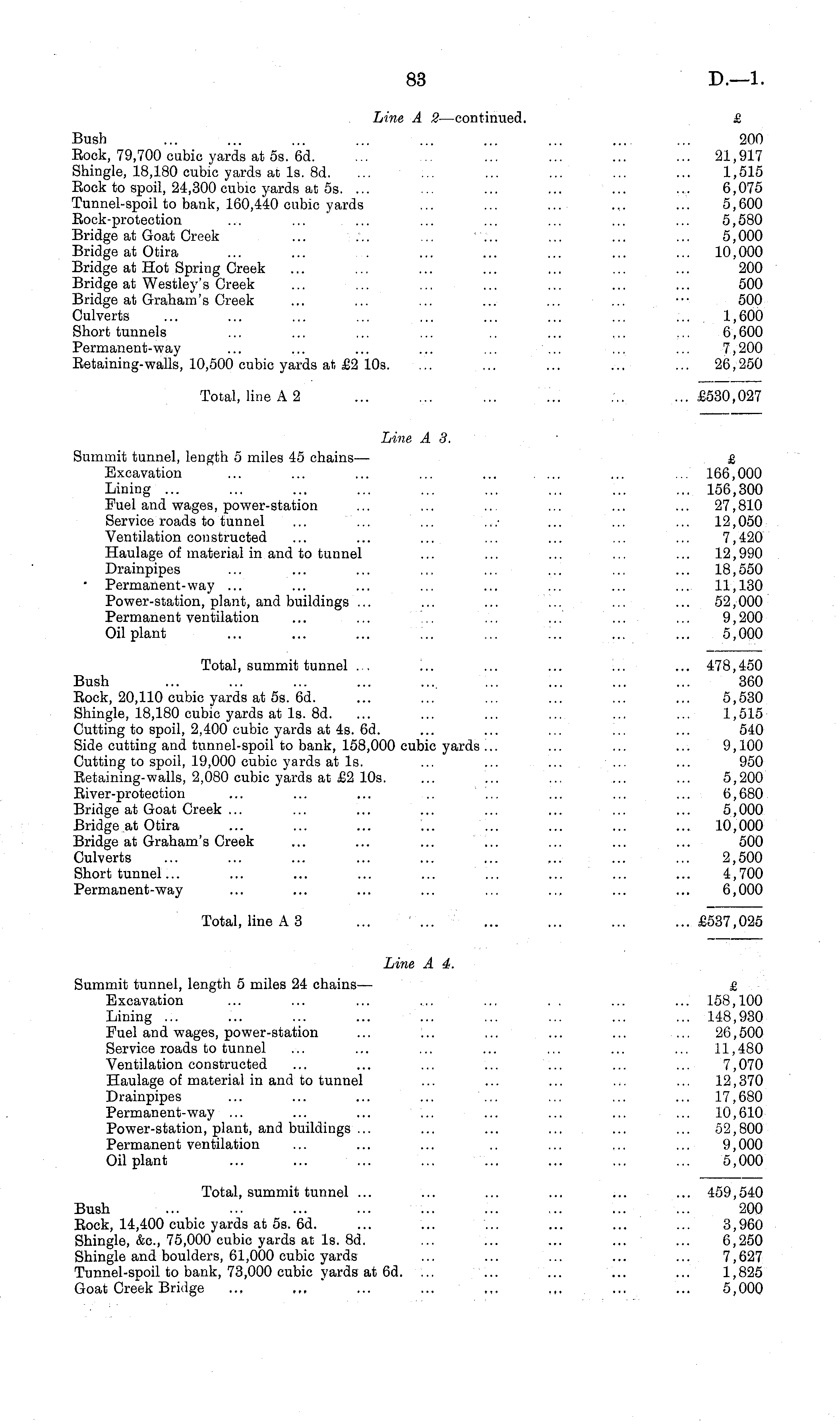 Line A 2 —continued. £ Bush ... ... ... ... ... ... ... 200 Eock, 79,700 cubic yards at ss. 6d. ... ... ... ... ... ... 21,917 Shingle, 18,180 cubic yards at Is. Bd. ... ... ... ... ... ... 1,515 Eock to spoil, 24,300 cubic yards at ss. ... ... ... ... ... .... 6,075 Tunnel-spoil to bank, 160,440 cubic yards ... ... ... ... ... 5,600 Bock-protection .... ... ... ... ... ... ... ... 5,580 Bridge at Goat Creek ... ... ... ... ... ... ... 5,000 Bridge at Otira ... ... ... ... ... ... ... ... 10,000 Bridge at Hot Spring Creek ... ... ... ... ... ... ... 200 Bridge at Westley's Creek ... ... ... ... ... ... ... 500 Bridge at Graham's Creek ... ... ... ... ... ... ••• 500 Culverts ... ... ... ... ... ... ... ... ... 1,600 Short tunnels ... ... ... ... .. ... ... ... 6,600 Permanent-way ... ... ... ... ... ... ... ... 7,200 Eetaining-walls, 10,500 cubic yards at £2 10s. ... ... ... ... ... 26,250 Total, line A 2 ... ... ... ... ... ...£530,027 Line A 3. Summit tunnel, length 5 miles 45 chains— £ Excavation ... ... ... ... ... ... 166,000 Lining ... ... ... ... ... ... ... ... ... 156,300 Fuel and wages, power-station ... ... ... ... ... ... 27,810 Service roads to tunnel ... ... ... ...- ... ... ... 12,050 Ventilation constructed ... ... ... ... ... ... ... 7,420 Haulage of material in and to tunnel ... ... ... ... ... 12,990 Drainpipes ... ... ... ... ... ... ... ... 18,550 • Permanent-way ... ... ... ... ... ... ... ... 11,130 Power-station, plant, and buildings ... ... ... ... ... ... 52,000 Permanent ventilation ... ... ... ... ... ... ... 9,200 Oilplant ... ... ... ... ... :.. ... ... 5,000 Total, summit tunnel ... ... ... ... ... ... 478,450 Bush ... ... ... ... ... ... ... ... ... 360 Eock, 20,110 cubic yards at ss. 6d. ... ... ... ... ... ... 5,530 Shingle, 18,180 cubic yards at Is. Bd. ... ... ... ... ... ... 1,515 Cutting to spoil, 2,400 cubic yards at 4s. 6d. ... ... ... ... ... 540 Side cutting and tunnel-spoil to bank, 158,000 cubic yards ... ... ... ... 9,100 Cutting to spoil, 19,000 cubic yards at Is. ... ... ... ... ... 950 Eetaining-walls, 2,080 cubic yards at £2 10s. ... ... ... ... ... 5,200 Eiver-protection ... ... ... .. ... ... ... ... 6,680 Bridge at Goat Creek ... ... ... ... ... ... ... ... 5,000 Bridge at Otira ... ... ... ... ... ... ... ... 10,000 Bridge at Graham's Creek ... ... ... ... ... ... ... 500 Culverts ... ... ... ... ... ... ... ... ... 2,500 Short tunnel... ... ... ... ... ... ... ... ... 4,700 Permanent-way ... ... ... ... ... ... ... ... 6,000 Total, line A 3 ... ... ... ... ... ...£537,025 Line A 4. Summit tunnel, length 5 miles 24 chains — £ Excavation ... ... ... ... ... . . ... ... 158,100 Lining ... ... ... ... ... ... ... ... ... 148,930 Fuel and wages, power-station ... ... ... ... ... ... 26,500 Service roads to tunnel ... ... ... ... ... ... ... 11,480 Ventilation constructed ... ... ... ... ... ... ... 7,070 Haulage of material in and to tunnel ... ... ... ... ... 12,370 Drainpipes ... ... ... ... ... ... ... ... 17,680 Permanent-way ... ... ... ... ... ... ... ... 10,610 Power-station, plant, and buildings ... ... ... ... ... ... 52,800 Permanent ventilation ... ... ... .. ... ... ... 9,000 Oilplant ... ... ... ... ... ... ... ... 5,000 Total, summit tunnel ... ... ... ... ... ... 459,540 Bush ... ... ... ... ... ... ... ... ... 200 Eock, 14,400 cubic yards at ss. 6d. ... ... ... ... ... ... 3,960 Shingle, &c, 75,000 cubic yards at Is. Bd. ... ... ... ... ... 6,250 Shingle and boulders, 61,000 cubic yards ... ... ... ... ... 7,627 Tunnel-spoil to bank, 73,000 cubic yards at 6d. ... ... ... ... ... 1,825 Goat Creek Bridge ... ... ' ... ... ~. ~. ... ... 5,000