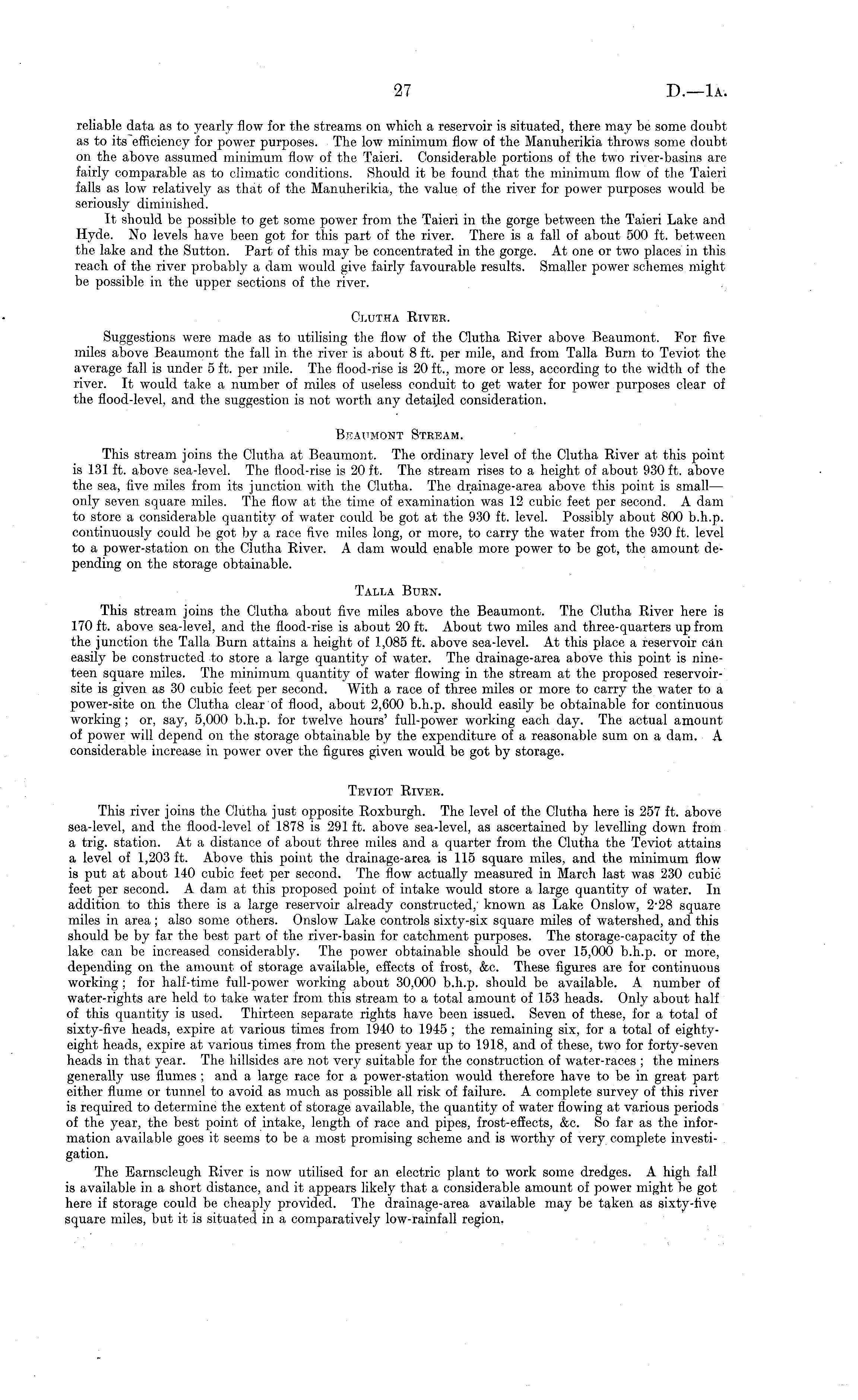 reliable data as to yearly flow for the streams on which a reservoir is situated, there may be some doubt as to its efficiency for power purposes. The low minimum flow of the Manuherikia throws some doubt on the above assumed minimum flow of the Taieri. Considerable portions of the two river-basins are fairly comparable as to climatic conditions. Should it be found that the minimum flow of the Taieri falls as low relatively as that of the Manuherikia, the value of the river for power purposes would be seriously diminished. It should be possible to get some power from the Taieri in the gorge between the Taieri Lake and Hyde. No levels have been got for this part of the river. There is a fall of about 500 ft. between the lake and the Sutton. Part of this may be concentrated in the gorge. At one or two places in this reach of the river probably a dam would give fairly favourable results. Smaller power schemes might be possible in the upper sections of the river. Clutha Rivee. Suggestions were made as to utilising the flow of the Clutha River above Beaumont. For five miles above Beaumont the fall in the river is about 8 ft. per mile, and from Talla Burn to Teviot the average fall is under 5 ft. per mile. The flood-rise is 20 ft., more or less, according to the width of the river. It would take a number of miles of useless conduit to get water for power purposes clear of the flood-level, and the suggestion is not worth any detailed consideration. Bkaumont Stream. This stream joins the Clutha at Beaumont. The ordinary level of the Clutha River at this point is 131 ft. above sea-level. The flood-rise is 20 ft. The stream rises to a height of about 930 ft. above the sea, five miles from its junction with the Clutha. The drainage-area above this point is small — only seven square miles. The flow at the time of examination was 12 cubic feet per second. A dam to store a considerable quantity of water could be got at the 930 ft. level. Possibly about 800 b.h.p. continuously could be got by a race five miles long, or more, to carry the water from the 930 ft. level to a power-station on the Ciutha River. A dam would enable more power to be got, the amount depending on the storage obtainable. Talla Burn. This stream joins the Clutha about five miles above the Beaumont. The Clutha River here is 170 ft. above sea-level, and the flood-rise is about 20 ft. About two miles and three-quarters up from the junction the Talla Burn attains a height of 1,085 ft. above sea-level. At this place a reservoir can easily be constructed to store a large quantity of water. The drainage-area above this point is nineteen square miles. The minimum quantity of water flowing in the stream at the proposed reservoirsite is given as 30 cubic feet per second. With a race of three miles or more to carry the water to a power-site on the Clutha clear of flood, about 2,600 b.h.p. should easily be obtainable for continuous working ; or, say, 5,000 b.h.p. for twelve hours' full-power working each day. The actual amount of power will depend on the storage obtainable by the expenditure of a reasonable sum on a dam. A considerable increase in power over the figures given would be got by storage. Teviot River. This river joins the Clutha just opposite Roxburgh. The level of the Clutha here is 257 ft. above sea-level, and the flood-level of 1878 is 291 ft. above sea-level, as ascertained by levelling down from a trig, station. At a distance of about three miles and a quarter from the Clutha the Teviot attains a level of 1,203 ft. Above this point the drainage-area is 115 square miles, and the minimum flow is put at about 140 cubic feet per second. The flow actually measured in March last was 230 cubic feet per second. A dam at this proposed point of intake would store a large quantity of water. In addition to this there is a large reservoir already constructed,' known as Lake Onslow, 2-28 square miles in area; also some others. Onslow Lake controls sixty-six square miles of watershed, and this should be by far the best part of the river-basin for catchment purposes. The storage-capacity of the lake can be increased considerably. The power obtainable should be over 15,000 b.h.p. or more, depending on the amount of storage available, effects of frost, &c. These figures are for continuous working ; for half-time full-power working about 30,000 b.h.p. should be available. A number of water-rights are held to take water from this stream to a total amount of 153 heads. Only about half of this quantity is used. Thirteen separate rights have been issued. Seven of these, for a total of sixty-five heads, expire at various times from 1940 to 1945 ; the remaining six, for a total of eightyeight heads, expire at various times from the present year up to 1918, and of these, two for forty-seven heads in that year. The hillsides are not very suitable for the construction of water-races ; the miners generally use flumes ; and a large race for a power-station would therefore have to be in great part either flume or tunnel to avoid as much as possible all risk of failure. A complete survey of this river is required to determine the extent of storage available, the quantity of water flowing at various periods of the year, the best point of intake, length of race and pipes, frost-effects, &c. So far as the information available goes it seems to be a most promising scheme and is worthy of very complete investigation. The Earnscleugh River is now utilised for an electric plant to work some dredges. A high fall is available in a short distance, and it appears likely that a considerable amount of power might be got here if storage could be cheaply provided. The drainage-area available may be taken as sixty-five square miles, but it is situated in a comparatively low-rainfall region,