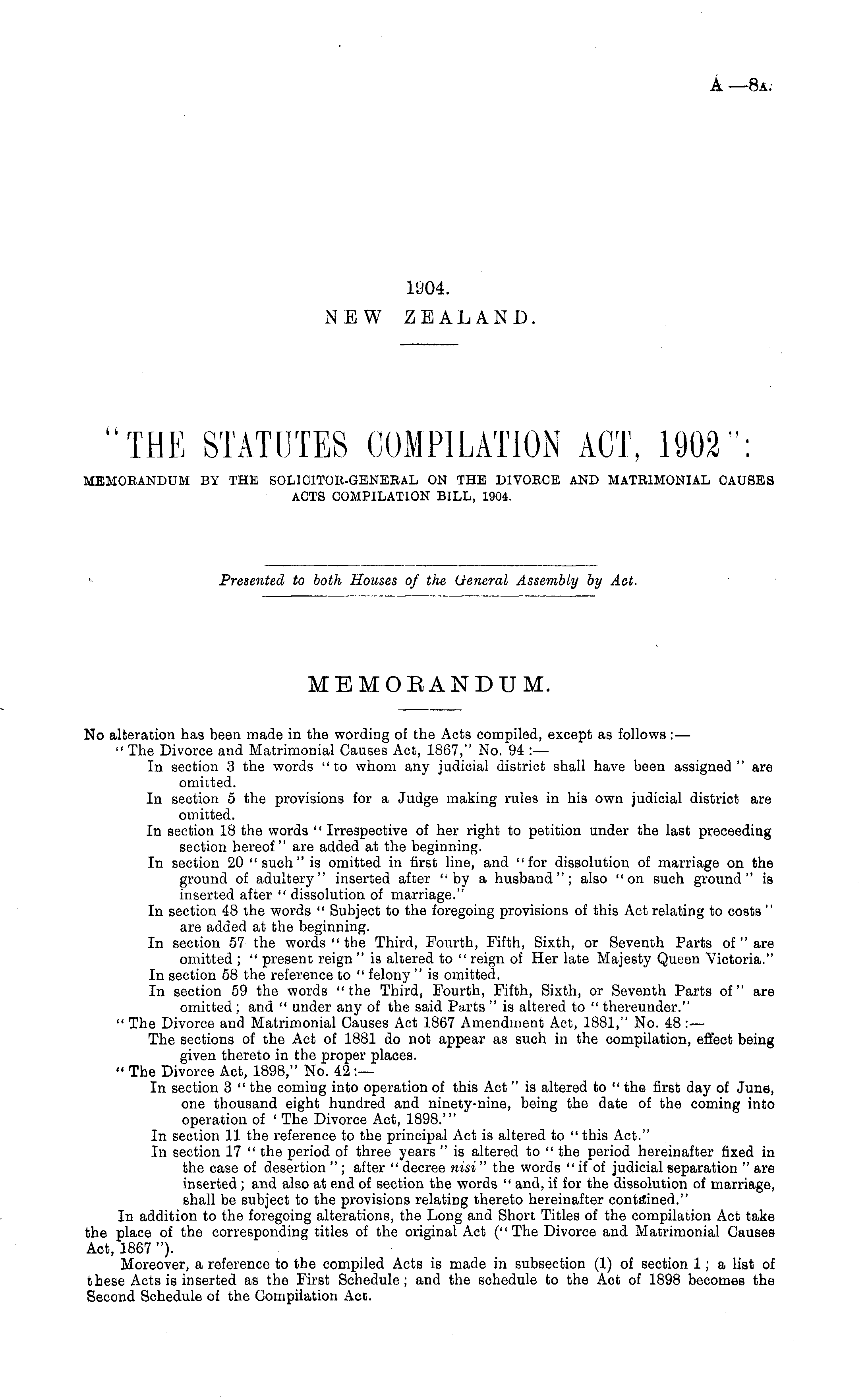 "THE STATUTES COMPILATION ACT, 1902": MEMORANDUM BY THE SOLICITOR-GENERAL ON THE DIVORCE AND MATRIMONIAL CAUSES ACTS COMPILATION BILL, 1904.