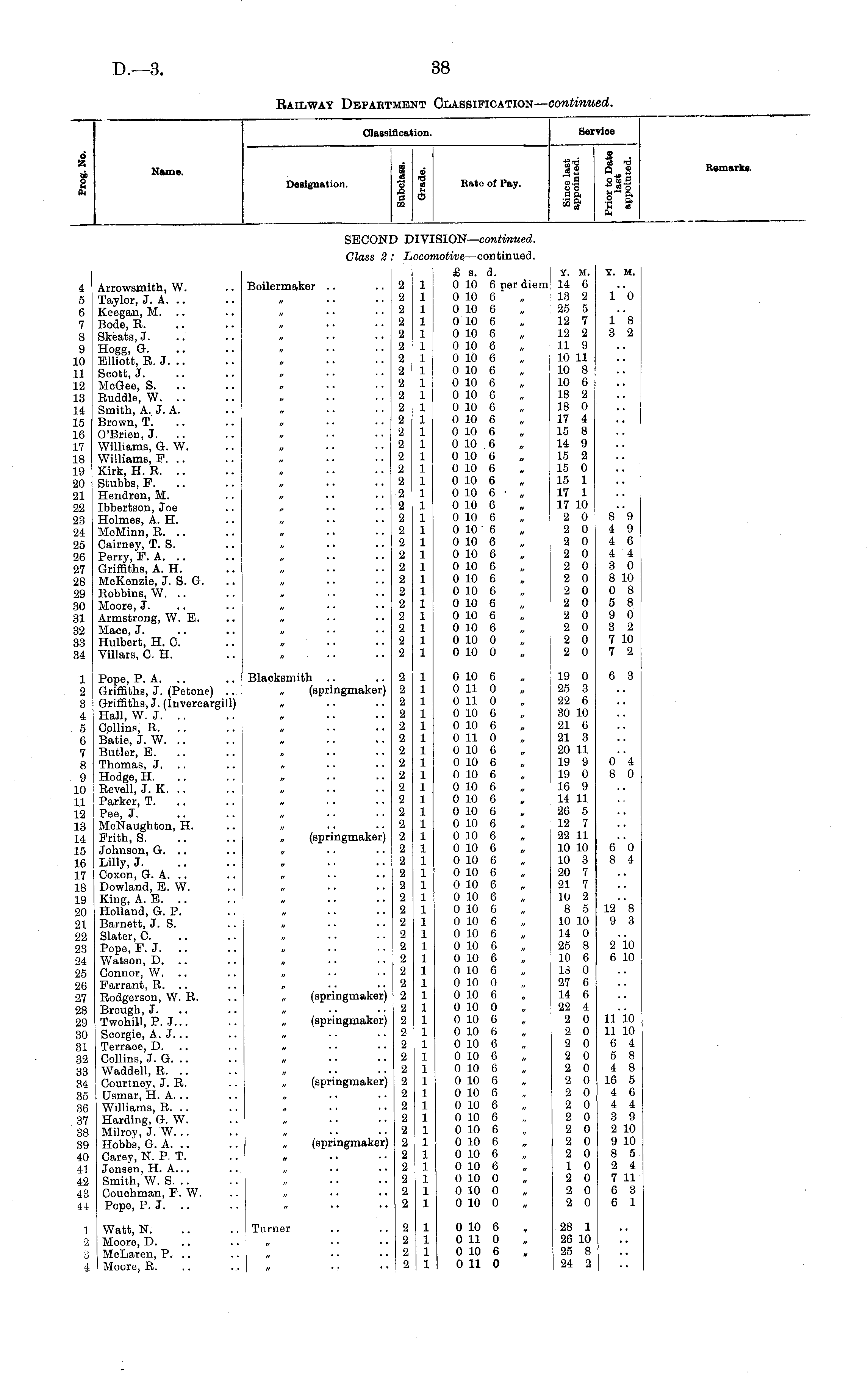Classifical Hon. Service 6 % ci A Name. Designation. m m 3 'o x 3 Ol © 3 u 0 Rate of Pay. 22 CD .3 « O 9 ■S io a s Oot 3 -fa d 8 JTI fa d Ah Remarks. secon: )IVI! 3ION — continued. Class 2 iOCOW lotive —continued. 4 5 6 7 8 9 10 11 12 13 14 15 16 17 18 19 20 21 22 23 24 25 26 27 28 29 30 31 32 33 34 Arrowsmith, W. Taylor, J. A. .. Keegan, M. .. Bode, R. Skeats, J. Hogg, G Elliott, R. J. .. Scott, J. McGee, S. Ruddle, W. .. Smith, A. J. A. Brown, T. O'Brien, J. .. Williams, G. W. Williams, F. .. Kirk, H. R. .. Stubhs, F. Hendren, M. Ibbertson, Joe Holmes, A. H. McMinn, R. .. Cairney, T. S. Perry, F. A. .. Griffiths, A. H. McKenzie, J. S. G. Robbins, W. .. Moore, J. Armstrong, W. E. Maee, J. Hulbert, H. 0. Villars, C H. Boilermaker 2 2 2 2 9 9 9 2 2 2 2 2 2 2 2 2 2 2 2 2 9 9 9 2 2 2 2 2 9 9 9 1 1 1 1 1 1 1 1 1 1 1 1 1 1 1 1 1 1 1 1 1 1 1 1 1 1 1 1 1 1 1 £ s. d. 0 10 6 per diem 0 10 6 0 10 6 0 10 6 0 10 6 0 10 6 0 10 6 0 10 6 0 10 6 0 10 6 0 10 6 0 10 6 0 10 6 0 10 6 0 10 6 0 10 6 0 10 6 0 10 6 • „ 0 10 6 0 10 6 0 10 6 0 10 6 0 10 6 0 10 6 0 10 6 0 10 6 0 10 6 0 10 6 0 10 6 0 10 0 0 10 0 Y. M. 14 6 13 2 25 5 12 7 12 2 11 9 10 11 10 8 10 6 18 2 18 0 17 4 15 8 14 9 15 2 15 0 15 1 17 1 17 10 2 0 2 0 2 0 2 0 2 0 2 0 2 0 2 0 2 0 2 0 2 0 2 0 Y. M. i"o 1 "8 3 2 8 9 4 9 4 6 4 4 3 0 8 10 0 8 5 8 9 0 3 2 7 10 7 2 1 2 3 4 5 6 7 8 9 10 11 12 13 14 15 16 17 18 19 20 21 22 23 24 25 26 27 28 29 30 31 32 33 34 35 36 37 38 39 40 41 42 43 41 Pope, P. A. .. Griffiths, J. (Petone) .. Griffiths, J. (Invercargill) Hall, W.J... Collins, R. .. Batie, J. W. .. Butler, E. Thomas, J. .. Hodge, H. Revell, J. K. .. Parker, T. Pee, J. McNaughton, H. Frith, S. Johnson, G. .. Lilly, J Coxon, G. A. .. Dowland, E. W. King, A. E. .. Holland, G. P. Barnett, J. S. Slater, 0. Pope, F. J. Watson, D. .. Connor, W. Farrant, R. .. Rodgerson, W. R. Brough, J. Twohill, P. J... Scorgie, A.J... Terrace, D. .. Collins, J. G. .. Waddell, R. .. Courtney, J. R. Usmar, H. A. .. Williams, R. .. Harding, G. W. Milroy, J. W. .. Hobbs, G. A. .. Carey, N. P. T. Jensen, H. A... Smith, W. S. .. Couohman, F. W. Pope, P. J. .. Blacksmith .. „ (springmaker) (springmaker) 2 2 2 2 2 2 2 9 9 9 2 2 2 2 2 2 2 2 2 2 2 2 2 2 2 2 2 2 2 2 2 2 2 2 2 2 9 9 2 2 2 2 2 2 1 1 1 1 1 1 1 1 1 1 1 1 1 1 1 1 1 1 1 1 1 1 1 1 1 1 1 1 1 1 1 1 1 1 1 1 1 1 1 1 1 1 1 1 0 10 6 0 11 0 0 11 0 0 10 6 0 10 6 0 11 0 0 10 6 0 10 6 0 10 6 0 10 6 0 10 6 0 10 6 0 10 6 0 10 6 0 10 6 0 10 6 0 10 6 0 10 6 0 10 6 0 10 6 0 10 6 0 10 6 0 10 6 0 10 6 0 10 6 0 10 0 0 10 6 0 10 0 0 10 6 0 10 6 0 10 6 0 10 6 0 10 6 0 10 6 0 10 6 0 10 6 0 10 6 0 10 6 0 10 6 0 10 6 0 10 6 0 10 0 0 10 0 0 10 0 19 0 25 3 22 6 30 10 21 6 21 3 20 11 19 9 19 0 16 9 14 11 26 5 12 7 22 11 10 10 10 3 20 7 21 7 10 2 8 5 10 10 14 0 25 8 10 6 13 0 27 6 14 6 22 4 2 0 2 0 2 0 2 0 2 0 2 0 2 0 2 0 2 0 2 0 2 0 2 0 1 0 2 0 2 0 2 0 6 3 0 "4 8 0 6 "0 8 4 12 8 9 3 2'io 6 10 (springmaker) „ (springmaker) (springmaker) 11 10 11 10 6 4 5 8 4 8 16 5 4 6 4 4 3 9 2 10 9 10 8 5 2 4 7 11 6 3 6 1 (springmaker) 1 2 •0 4 Watt, N. Moore, D. McLaren, P. .. I Moore, R, ,. Turner 2 2 2 2 1 1 1 1 0 10 6 0 11 0 0 10 6 0 11 0 28 1 26 10 25 8 24 2