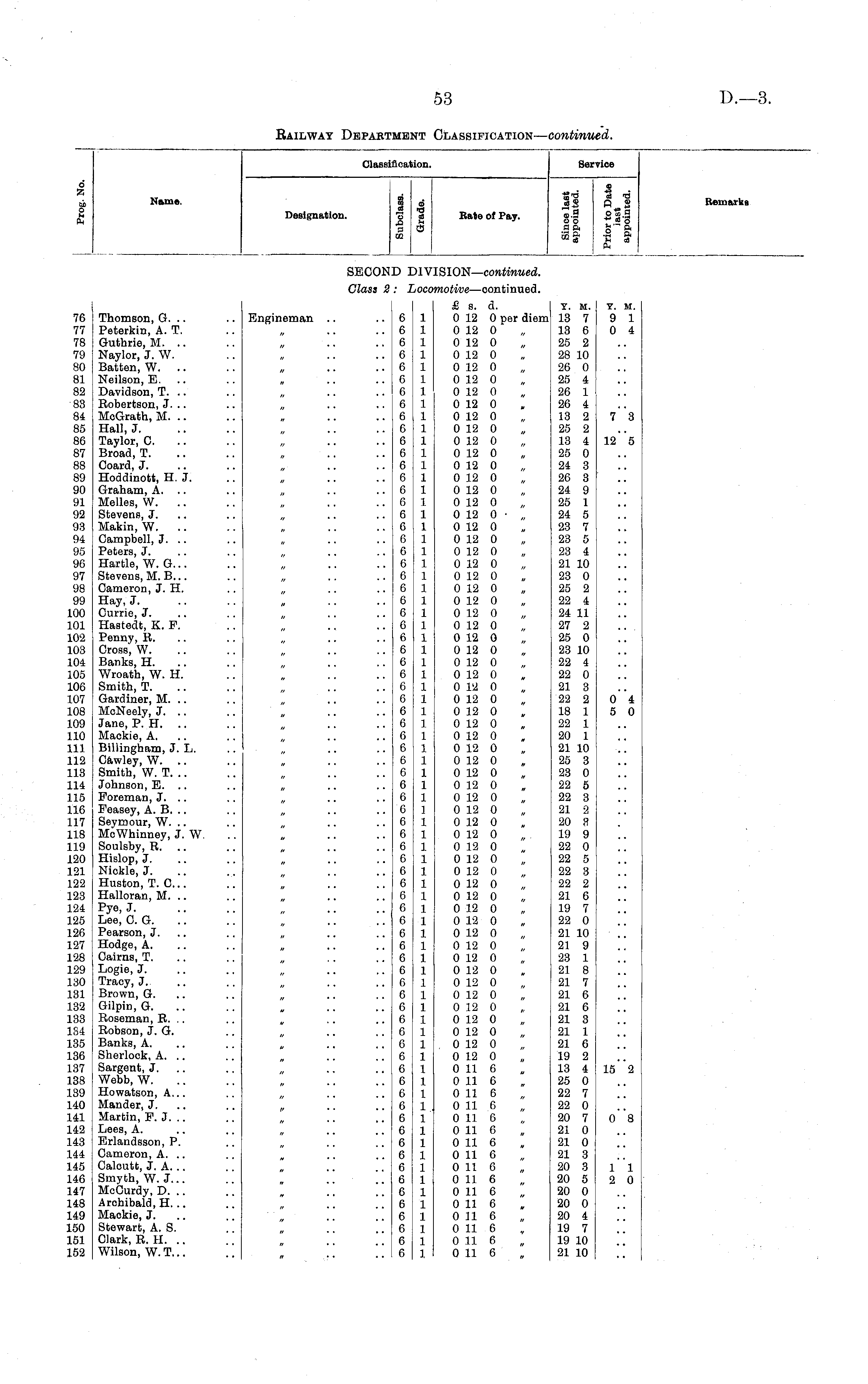 Classifioal lion. Service o' -h o fa ft Name. i 2 to 40 a 01 9 13 d fa O CD "S'O d 13 d2 p 2 e.9 &%a u O . d o a a fa a S3 -' -3 ft m d fad Ah Remarks Designation. Rate of Pay. SECON >1\ 'ISION— continued. Class 2 iOCi ymotive —continued. 76 77 78 79 80 81 82 83 84 85 86 87 88 89 90 91 92 93 94 95 96 97 98 99 :00 101 [02 L03 [04 [05 106 107 [08 [09 110 [11 [12 [13 [14 [15 l16 [17 [18 [19 [90 [21 [22 [23 :24 [25 .26 .27 ■28 [29 [30 [31 [32 1.33 [34 .35 .36 .37 .38 .39 .40 .41 42 .43 44 .45 .46 .47 .48 .49 .50 [51 .52 Thomson, G. .. Peterkin, A. T. Guthrie, M. .. Naylor, J. W. Batten, W. .. Neilson, E. Davidson, T. .. Robertson, J. .. McGrath, M. .. Hall, J. Taylor, C Broad, T. Coard, J. Hoddinott, H. J. Graham, A. .. Melles, W. .. Stevens, J. Makin, W. Campbell, J. .. Peters, J. Hartle, W. G... Stevens, M. B... Cameron, J. H. Hay, J. Currie, J. Hastedt, K. P. Penny, R. Cross, W. Banks, H. Wroath, W. H. Smith, T. Gardiner, M. .. McNeely, J. .. Jane, P. H. Mackie, A. Billingham, J. L. Cawley, W. .. Smith, W. T. .. Johnson, E. .. Foreman, J. .. Feasey, A. B. .. Seymour, W. .. McWhinney, J. W. Soulsby, R. Hislop, J. Niokle, J. Huston, T. C... Halloran, M. .. Pye, J. Lee, 0. G. Pearson, J. Hodge, A. Cairns, T. Logie, J. Tracy, J. Brown, G. Gilpin, G. Roseman, R. .. Robson, J. G. Banks, A. Sherlock, A. .. Sargent, 3. Webb, W. Howatson, A... Mander, J. Martin, F. J. .. Lees, A. Erlandsson, P. Cameron, A. .. Caloutt, J. A. .. Smyth, W. J... McCurdy, D. .. Archibald, H. .. Mackie, J. Stewart, A. S. Clark, R. H. Wilson, W. T... Engineman 6 6 6 6 6 6 6 6 6 6 6 6 6 6 6 6 6 6 6 6 6 6 6 6 6 6 6 6 6 6 6 6 6 6 6 6 6 6 6 6 6 6 6 6 6 6 6 fi 6 6 6 6 6 6 6 6 6 6 6 (i 6 0 6 6 6 6 6 6 6 6 6 6 6 6 6 6 6 1 1 1 1 1 1 1 1 1 1 1 1 1 1 1 1 1 1 1 1 1 1 1 1 1 1 1 1 1 1 1 1 1 1 1 1 1 1 1 1 1 1 1 1 1 1 1 1 1 1 1 1 1 1 1 1 1 1 1 1 1 1 1 1 1 1 1 1 1 1 1 1 1 1 1 1 1 £ s. d. 0 12 0 per diem 0 12 0 0 12 0 0 12 0 0 12 0 0 12 0 0 12 0 0 12 0 0 12 0 0 12 0 0 12 0 0 12 0 0 12 0 0 12 0 0 12 0 0 12 0 0 12 0 • „ 0 12 0 0 12 0 0 12 0 0 12 0 0 12 0 0 1.2 0 0 12 0 0 12 0 0 12 0 0 12 0 0 12 0 0 12 0 0 12 0 0 12 0 0 12 0 0 12 0 0 12 0 0 12 0 0 12 0 0 12 0 0 12 0 0 12 0 0 12 0 0 12 0 0 12 0 0 12 0 0 12 0 0 12 0 0 12 0 0 12 0 0 12 0 0 12 0 0 12 0 0 12 0 0 12 0 0 12 0 0 12 0 0 12 0 0 12 0 0 12 0 0 12 0 0 12 0 0 19 0 0 12 0 0 11 6 0 11 6 0 11 6 0 11 6 0 11 6 0 11 6 0 11 6 0 11 6 0 11 6 0 11 6 0 11 6 0 11 6 0 11 6 0 11 6 0 11 6 0 11 6 Y. M. 13 7 13 6 25 2 28 10 26 0 25 4 26 1 26 4 13 2 25 2 13 4 25 0 24 3 26 3 24 9 25 1 24 5 23 7 23 5 23 4 21 10 23 0 25 2 22 4 24 11 27 2 25 0 23 10 22 4 22 0 21 3 22 2 18 1 22 1 20 1 21 10 25 3 23 0 22 5 22 3 21 2 20 3 19 9 22 0 22 5 22 3 22 2 21 6 19 7 22 0 21 10 21 9 23 1 21 8 21 7 21 6 21 6 21 3 21 1 21 6 19 2 13 4 25 0 22 7 22 0 20 7 21 0 21 0 21 3 20 3 20 5 20 0 20 0 20 4 19 7 19 10 21 10 Y. M. 9 1 0 4 7 "3 12"5 0 "4 5 0 15 "2 a o"8 l"l 2 0 a