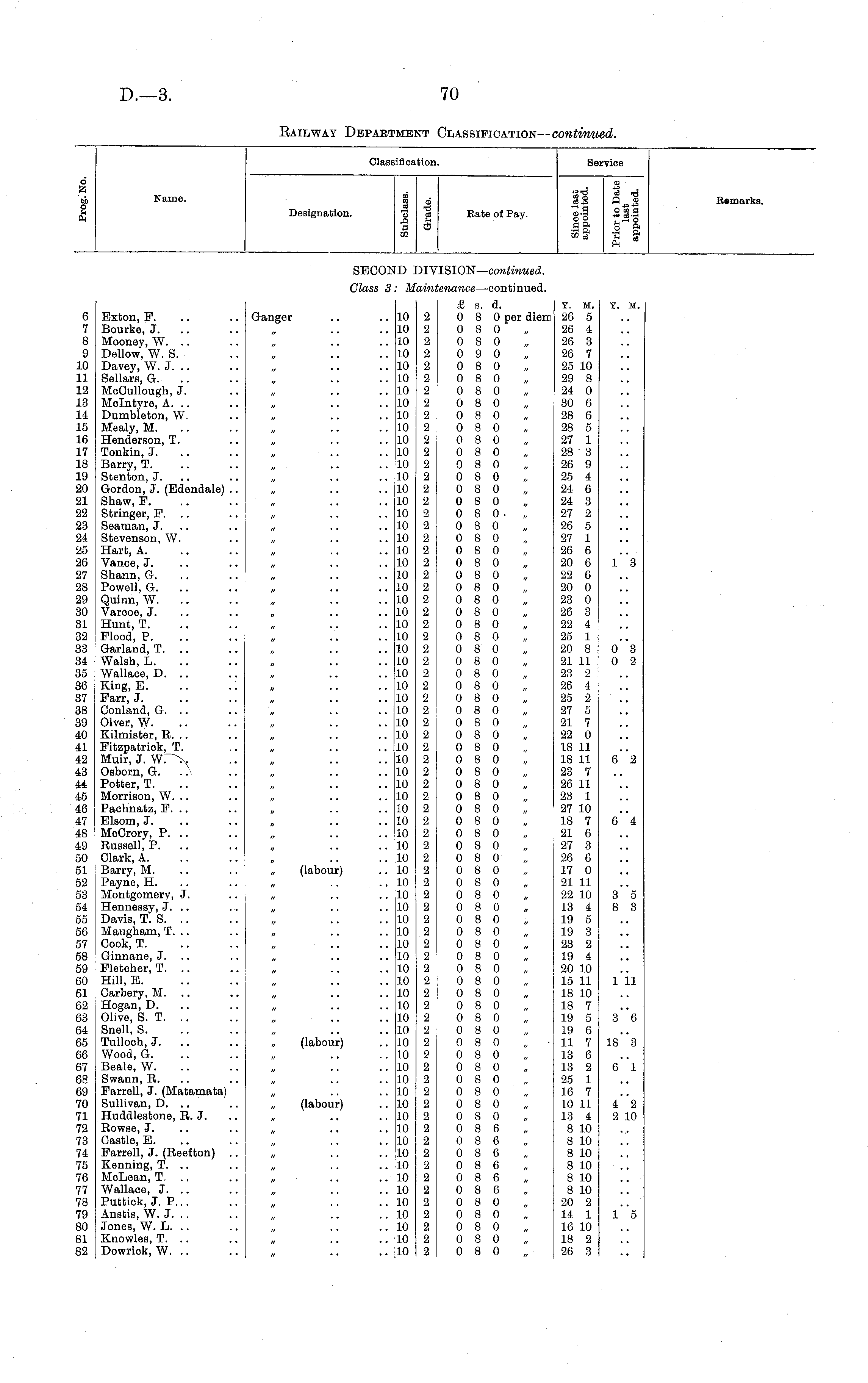 Clasi ii fici btion. Service o' 7, oh o fa Ah Name. Designation. CC in 2 o 43 3 Ol 0 CTJ r-i 0 Rate of Pay. tt aj 8l *J% 9S o a ft Remarks. SEC01S >I\ ; 'ISION — continued. Class 3 •Am ienance —continued. 6 7 8 9 10 1.1 12 13 14 15 16 17 18 19 20 21 22 23 24 25 26 27 28 29 30 31 32 33 34 35 36 37 38 39 40 41 42 43 44 45 46 47 48 49 50 51 52 53 54 55 56 57 58 59 60 61 62 63 64 65 66 67 68 69 70 71 72 73 74 75 76 77 78 79 80 81 89 Exton, F. Bourke, J. Mooney, W. .. Dellow, W. S. Davey, W. J. .. Sellars, G. McCullough, J. Molntyre, A. .. Dumbleton, W. Mealy, M. Henderson, T. Tonkin, J. Barry, T. Stenton, J. Gordon, J. (Edendale) .. Shaw, F. Stringer, F. .. Seaman, J. Stevenson, W. Hart, A. Vance, J. Shann, G. Powell, G. Quinn, W. Varcoe, J. Hunt, T. Flood, P. Garland, T. .. Walsh, L. Wallace, D. .. King, E. Farr, J. Conland, G. .. Olver, W. Kilmister, R. .. Fitzpatrick, T. Muir, J. W^ Osborn, G. . N Potter, T. Morrison, W. Pachnatz, F. .. Elsom, J. McCrory, P. .. Russell, P. .. Clark,A. Barry, M. Payne, H. Montgomery, J. Hennessy, J. .. Davis, T. S. .. Maugham, T. .. Cook, T. Ginnane, J. Fletcher, T. .. Hill, E. Carbery, M. .. Hogan, D. Olive, S. T. .. Snell, S. Tulloch, J. Wood, G. Beale, W. Swann, R. Farrell, J. (Matamata) Sullivan, D. .. Huddlestone, R. J. Rowse, J. Castle, E. Farrell, J. (Reefton) .. Kenning, T. .. MoLean, T. .. Wallace, J. .. Puttick, J. P... Anstis, W. J. .. Jones, W. L. .. Knowles, T. .. Dowrick, W. .. Ganger 10 10 10 10 10 10 10 10 1.0 10 10 10 10 10 10 10 10 10 10 10 10 10 10 10 1.0 10 10 10 10 10 to 10 10 10 10 10 10 10 10 10 10 10 10 10 10 10 10 10 10 1.0 10 10 10 10 10 10 10 10 10 10 to 10 10 10 10 10 10 10 10 10 10 10 10 10 10 10 10 2 2 2 2 2 2 9 2 2 2 2 2 2 2 2 2 2 2 9 9 2 2 2 2 2 2 2 2 2 2 2 2 2 2 2 2 2 2 2 2 2 2 2 2 2 2 2 2 2 2 2 2 2 2 2 2 2 9 9 2 2 9 2 2 2 2 2 2 2 2 2 9 2 2 2 2 2 £ s. d. 0 8 0 per diem 0 8 0 0 8 0 0 9 0 0 8 0 0 8 0 0 8 0 0 8 0 0 8 0 0 8 0 0 8 0 0 8 0 0 8 0 0 8 0 0 8 0 0 8 0 0 8 0- „ 0 8 0 0 8 0 0 8 0 0 8 0 0 8 0 0 8 0 0 8 0 0 8 0 0 8 0 0 8 0 0 8 0 0 8 0 0 8 0 0 8 0 0 8 0 0 8 0 0 8 0 0 8 0 0 8 0 0 8 0 0 8 0 0 8 0 0 8 0 0 8 0 0 8 0 0 8 0 0 8 0 0 8 0 0 8 0 0 8 0 0 8 0 0 8 0 0 8 0 0 8 0 0 8 0 0 8 0 0 8 0 0 8 0 0 8 0 0 8 0 0 8 0 0 8 0 0 8 0 0 8 0 0 8 0 0 8 0 0 8 0 0 8 0 0 8 0 0 8 6 0 8 6 0 8 6 0 8 6 0 8 6 0 8 6 0 8 0 0 8 0 0 8 0 0 8 0 0 8 0 Y. M. 26 5 26 4 26 3 26 7 25 10 29 8 24 0 30 6 28 6 28 5 27 1 28 3 26 9 25 4 24 6 24 3 27 9 26 5 27 1 26 6 20 6 22 6 20 0 23 0 26 3 22 4 25 1 20 8 21 11 23 2 26 4 25 2 27 5 21 7 22 0 18 11 18 11 23 7 26 11 23 1 27 10 18 7 21 6 27 3 26 6 17 0 21 11 22 10 13 4 19 5 19 3 23 2 19 4 20 10 15 11 18 10 18 7 19 5 19 6 11 7 13 6 13 2 25 1 16 7 10 11 13 4 8 10 8 10 8 10 8 10 8 10 8 10 20 2 14 1 16 10 18 2 26 3 Y. M. 1 "3 o"3 0 2 6 "2 &" i (labour) 8 3 1 ii 3"6 (labour) 18".3 6 "l (labour) 4"2 2 10 1 "5