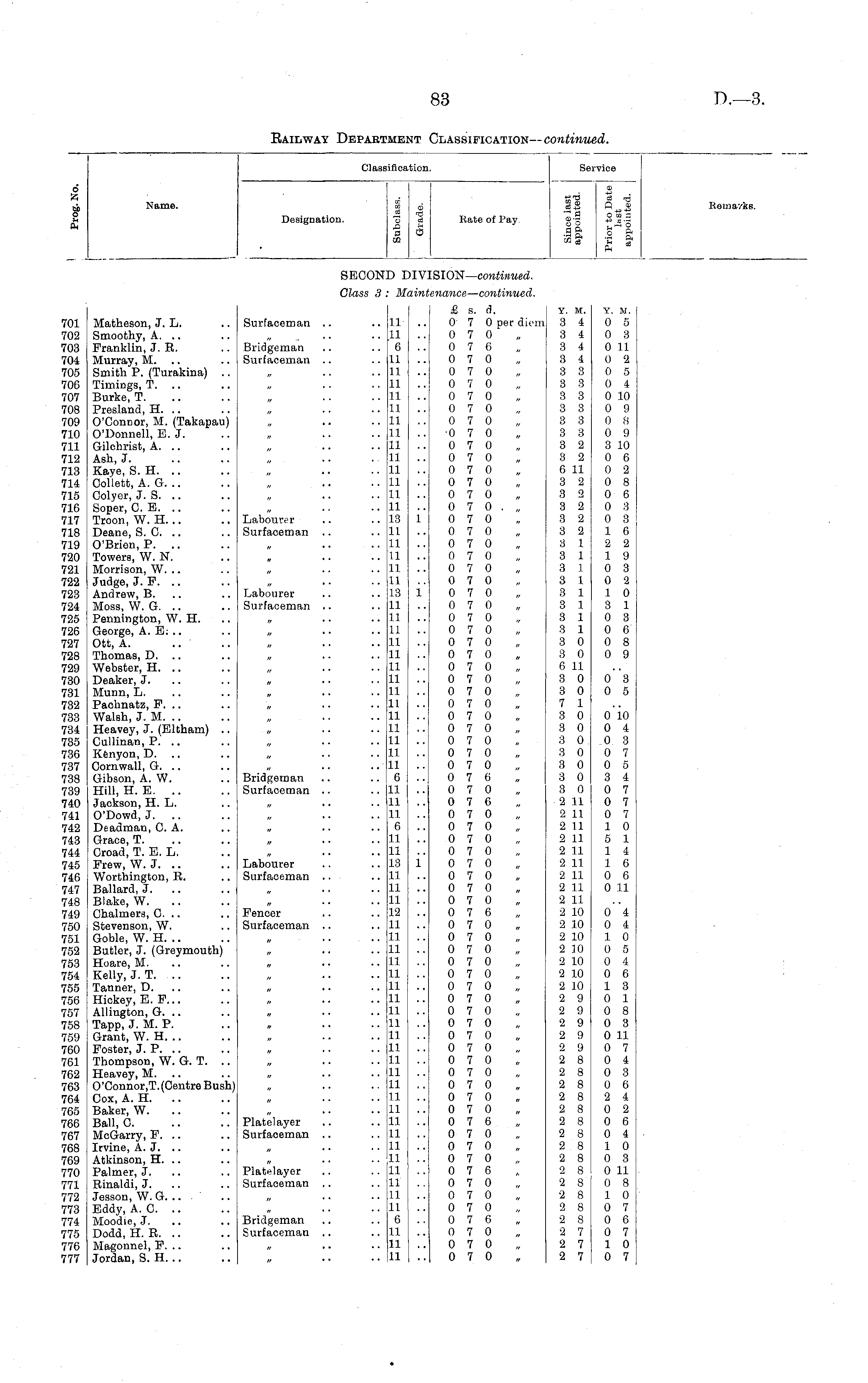 Clasi iific; Ltion. Service 6 A ti o rH Ol Name. Kate of Pay. CD _: +J *± Ti C5 rrf % to n a> to £ , rtO Designation. W CD Ti 0 Remarks. SECON >IV SION— continued. Glass 3 . vini tnance — continued. 701 702 703 704 705 706 707 708 709 710 711 712 713 714 715 716 717 718 719 720 721 722 723 724 725 726 727 728 729 730 731 732 733 734 735 736 737 738 739 740 741 742 743 744 745 746 747 748 749 750 751 752 753 754 755 756 757 758 759 760 761 762 763 764 765 766 767 768 769 770 771 772 773 774 775 776 777 Matheson, J. L. Smoothy, A. .. Franklin, J. R. Murray, M. .. Smith P. (Turakina) .. Timings, T. .. Burke, T. Presland, H. .. O'Connor, M. (Takapau) O'Donnell, E. J. Gilchrist, A. .. Ash, J. Kaye, S. H. .. Collett, A. G. .. Colyer, J. S. .. Soper, 0. E. .. Troon, W. H. .. Deane, S. 0. .. O'Brien, P. .. Towers, W. N. Morrison, W. .. Judge, J. F. .. Andrew, B. .. Moss, W. G. .. Pennington, W. H. George, A. E. .. Ott, A. Thomas, D. .. Webster, H. .. Deaker, J. Munn, L. Paehnatz, F. .. Walsh, J. M. .. Heavey, J. (Eltham) .. Cullinan, P. .. Kfenyon, D. .. Cornwall, G. .. Gibson, A. W. Hill, H. E. .. Jackson, H. L. O'Dowd, J. .. Deadman, CA. Grace, T. Croad, T. E. L, Frew, W. J. .. Worthington, R. Ballard, J. Blake, W. Chalmers, C. .. Stevenson, W. Goble, W. H. .. Butler, J. (Greymouth) Hoare, M. Kelly, J. T. .. Tanner, D. .. Hiokey, E. F... Allington, G. .. Tapp, J. M. P. Grant, W. H. .. Poster, J. P. .. Thompson, W. G. T. .. Heavey, M. .. O'Connor.T. (Centre Bush) Cox, A. H. Baker, W. Ball, 0. McGarry, P. .. Irvine, A. J. .. Atkinson, H. .. Palmer, J. Rinaldi, J. Jesson, W. G. .. Eddy, A. 0. .. Moodie, J. Dodd, H. R. .. Magonnel, F. .. Jordan, S. H. .. Surfaceman .. Bridgeman Surfaceman .. Labourer Surfaceman .. Labourer Surfaceman .. Bridgeman Surfaceman .. 11 11 6 11 11 11 11 1! 11 11 11 11 11 1 I 11 11 13 11 11 11 11 11 13 1.1 11 1 1 11 .11 11 11 11 11 11 11 11 11 11 6 11 11 11 6 11 11 13 11 11 1.1 12 11 11 11 11 11 11 11 11 11 11 11 11 11 11 11 11 11 11 11 11 11 11 11 11 6 11 11 11 i' £ s. d. 0 7 0 per diem 0 7 0 0 7 6 0 7 0 0 7 0 0 7 0 0 7 0 0 7 0 0 7 0 0 7 0 0 7 0 0 7 0 0 7 0 0 7 0 0 7 0 0 7 0 . „ 0 7 0 0 7 0 0 7 0 0 7 0 0 7 0 0 7 0 0 7 0 0 7 0 0 7 0 0 7 0 0 7 0 0 7 0 0 7 0 0 7 0 0 7 0 0 7 0 0 7 0 0 7 0 0 7 0 0 7 0 0 7 0 0 7 6 0 7 0 0 7 6 0 7 0 0 7 0 0 7 0 0 7 0 0 7 0 0 7 0 0 7 0 0 7 0 0 7 6 0 7 0 0 7 0 0 7 0 0 7 0 0 7 0 0 7 0 0 7 0 0 7 0 0 7 0 0 7 0 0 7 0 0 7 0 0 7 0 0 7 0 0 7 0 0 7 0 0 7 6 0 7 0 0 7 0 0 7 0 0 7 6 0 7 0 0 7 0 0 7 0 0 7 6 0 7 0 0 7 0 0 7 0 Y. M. 3 4 3 4 3 4 3 4 3 3 3 3 3 3 3 3 3 3 3 3 3 9 3 2 6 11 3 2 3 2 3 2 3 2 3 2 3 1 3 1 3 1 3 1 3 1 3 1 3 1 3 1 3 0 3 0 6 11 3 0 3 0 7 1 3 0 3 0 3 0 3 0 3 0 3 0 3 0 2 11 2 11 9 11 2 11 2 11 2 11 2 11 2 11 2 11 2 10 2 10 2 10 2 10 2 10 2 10 2 10 2 9 2 9 2 9 2 9 2 9 2 8 2 8 2 8 2 8 2 8 2 8 2 8 2 8 2 8 9 8 9 8 9 8 9 8 2 8 2 7 2 7 2 7 Y. M. 0 5 0 3 0 11 0 2 0 5 0 4 0 10 0 9 0 8 0 9 3 10 0 6 0 2 0 8 0 6 0 3 0 3 1 6 2 2 1 9 0 3 0 2 1 0 3 1 0 3 0 6 0 8 0 9 0 3 0 5 0 10 0 4 0 3 0 7 0 5 3 4 0 7 0 7 0 7 1 0 5 1 1 4 1 6 0 6 0 11 Labourer Surfaceman .. i Fencer Surfaceman .. 0 4 0 4 1 0 0 5 0 4 0 6 1 3 0 1 0 8 0 3 0 11 0 7 0 4 0 3 0 6 2 4 0 2 0 6 0 4 1 0 0 3 0 11 0 8 1 0 0 7 0 6 0 7 1 0 0 7 Platelayer Surfaceman .. Platelayer Surfaceman .. Bridgeman Surfaceman ..