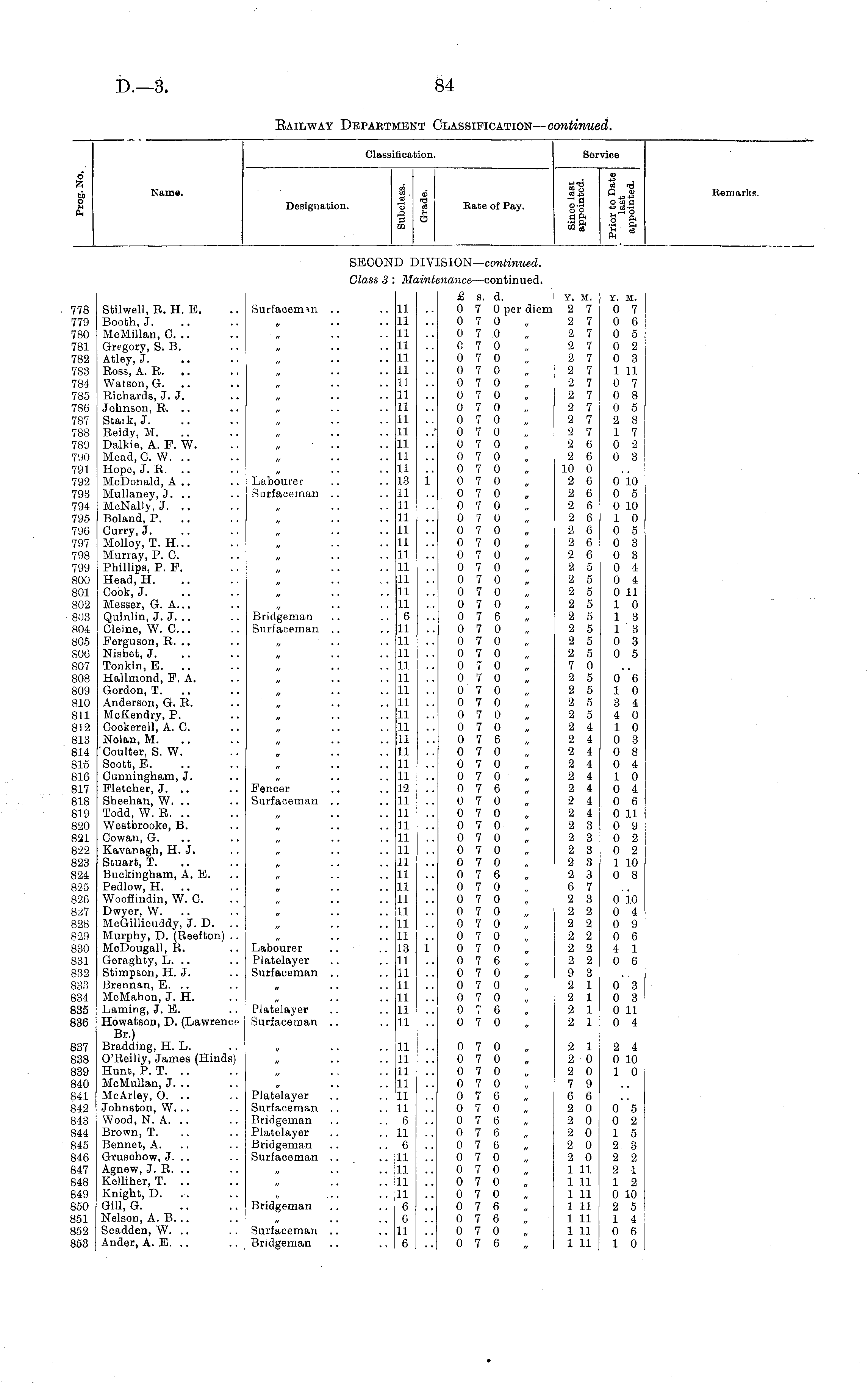 Classification. Service 6 A be o U 04 Name. Designation. m xn cd *o rS 0 02 CD Tl cd 5 Rate of Pay. »! to 2 a g* 0 o to q fl A * Remarks. SECONJ HVJ [SION— continued. Class 3 : •inti '.nance —continued. 778 779 780 781 782 783 784 785 786 787 788 789 790 791 792 793 794 795 796 797 798 799 800 801 802 803 804 805 806 807 808 809 810 811 812 813 814 815 816 817 818 819 820 821 829 893 824 825 896 827 898 899 830 831 839 833 834 835 836 Stilwell, R. H. E. Booth, J. McMillan, 0. .. Gregory, S. B. Atley, J. Ross, A, R. Watson, G. .. Richards, J. J. Johnson, R. .. Staik, J. Reidv, M. Dalkie, A. F. W. Mead, 0. W. .. Hope, J. R. .. McDonald, A .. Mullaney, J. .. McNally.J. .. Boland, P. Curry, J. Molloy, T. H... Murray, P. 0. Phillips, P. F. Head, H. Cook, J. Messer, G. A... Quinlin, J. J. .. Cleine, W. C... Ferguson, R. .. Nisbet, J. Tonkin, E. .. Hallmond, F. A. Gordon, T. .. Anderson, G. R. McKendry, P. Cockerell, A. 0. Nolan, M. 'Coulter, S. W. Scott, E. Cunningham, J. Fletcher, J. .. Sheehan, W. .. Todd, W. R. .. Westbrooke, B. Cowan, G. Kavanagh, H. J. Stuart, T. Buckingham, A. E. Pedlow, H. .. Wooffindin, W. 0. Dwyer, W. McGillicuddy, J. D. Murphy, D. (Reefton) .. McDougall, R. Geraghty, L. .. Stimpson, H. J. Brennan, E. .. McMahon, J. H. Laming, J. E. Howatson, D. (Lawrence Br.) Bradding, H. L. O'Reilly, James (Hinds) Hunt, P. T. .. McMullan, J. .. McArley, 0. .. Johnston, W. Wood, N. A. .. Brown, T. Bennet, A. Gruschow, J. .. Agnew, J. R. .. Kelliher, T. .. Knight, D. Gill, G. Nelson, A. B. .. Scadden, W. .. Ander, A. E. .. Surfaceman .. Labourer Surfaceman .. Bridgeman Surfaceman .. 11 11 11 II. 11 11 Ll 11 11 11 11 11 11 11 13 11 11 1.1 11 11 11 11 11 11 1.1 6 11 11 11 11 11 11 11 11 11 11 11 11 11 12 11 II 11 11 11 1.1 11 11 1 1 11 11 11 13 11 11 11 11 11 11 i' £ s. d. 0 7 0 per diem 0 7 0 0 7 0 C 7 0 0 7 0 0 7 0 0 7 0 0 7 0 0 7 0 0 7 0 0 7 0 0 7 0 0 7 0 0 7 0 0 7 0 0 7 0 0 7 0 0 7 0 0 7 0 0 7 0 0 7 0 0 7 0 0 7 0 0 7 0 0 7 0 0 7 6 0 7 0 0 7 0 0 7 0 0 7 0 0 7 0 0 7 0 0 7 0 0 7 0 0 7 0 0 7 6 0 7 0 0 7 0 0 7 0 0 7 6 0 7 0 0 7 0 0 7 0 0 7 0 0 7 0 0 7 0 0 7 6 0 7 0 0 7 0 0 7 0 0 7 0 0 7 0 0 7 0 0 7 6 0 7 0 0 7 0 0 7 0 0 7 6 0 7 0 Y. M. 2 7 2 7 2 7 2 7 2 7 2 7 2 7 2 7 2 7 2 7 2 7 2 6 2 6 10 0 2 6 2 6 2 6 2 6 2 6 2 6 2 6 2 5 2 5 2 5 2 5 2 5 2 5 2 5 2 5 7 0 2 5 2 5 2 5 2 5 2 4 2 4 2 4 2 4 2 4 2 4 2 4 2 4 2 3 2 3 2 3 2 3 2 3 6 7 2 3 2 2 2 2 2 2 2 2 2 2 9 3 2 1 2 1 2 1 2 1 Y. M. 0 7 0 6 0 5 0 2 0 3 1 11 0 7 0 8 0 5 2 8 1 7 0 2 0 3 0 10 0 5 0 10 1 0 0 5 0 3 0 3 0 4 0 4 0 11 1 0 1 3 1 8 0 3 0 5 0 6 1 0 3 4 4 0 1 0 0 3 0 8 0 4 1 0 0 4 0 6 0 11 0 9 0 2 0 2 1 10 0 8 Fencer Surfaceman .. 0 10 0 4 0 9 0 6 4 1 0 6 Labourer Platelayer Surfaceman .. Platelayer Surfaceman .. 0 3 0 3 0 11 0 4 837 838 839 840 841 842 843 844 845 846 847 848 849 850 851 852 853 11 11 11 11 11 11 6 11 6 11 1.1 11 11 6 6 11 6 0 7 0 0 7 0 0 7 0 0 7 0 0 7 6 0 7 0 0 7 6 0 7 6 0 7 6 0 7 0 0 7 0 0 7 0 0 7 0 0 7 6 0 7 6 0 7 0 0 7 6 2 1 2 0 2 0 7 9 6 6 2 0 2 0 2 0 2 0 2 0 1 11 1 11 1 11 1 11 1 11 1 11 1 11 2 4 0 10 1 0 Platelayer Surfaceman .. Bridgeman Platelayer Bridgeman Surfaceman .. 0 5 0 2 1 5 2 3 2 2 2 1 1 2 0 10 2 5 1 4 0 6 1 0 Bridgeman Surfaceman .. Bridgeman