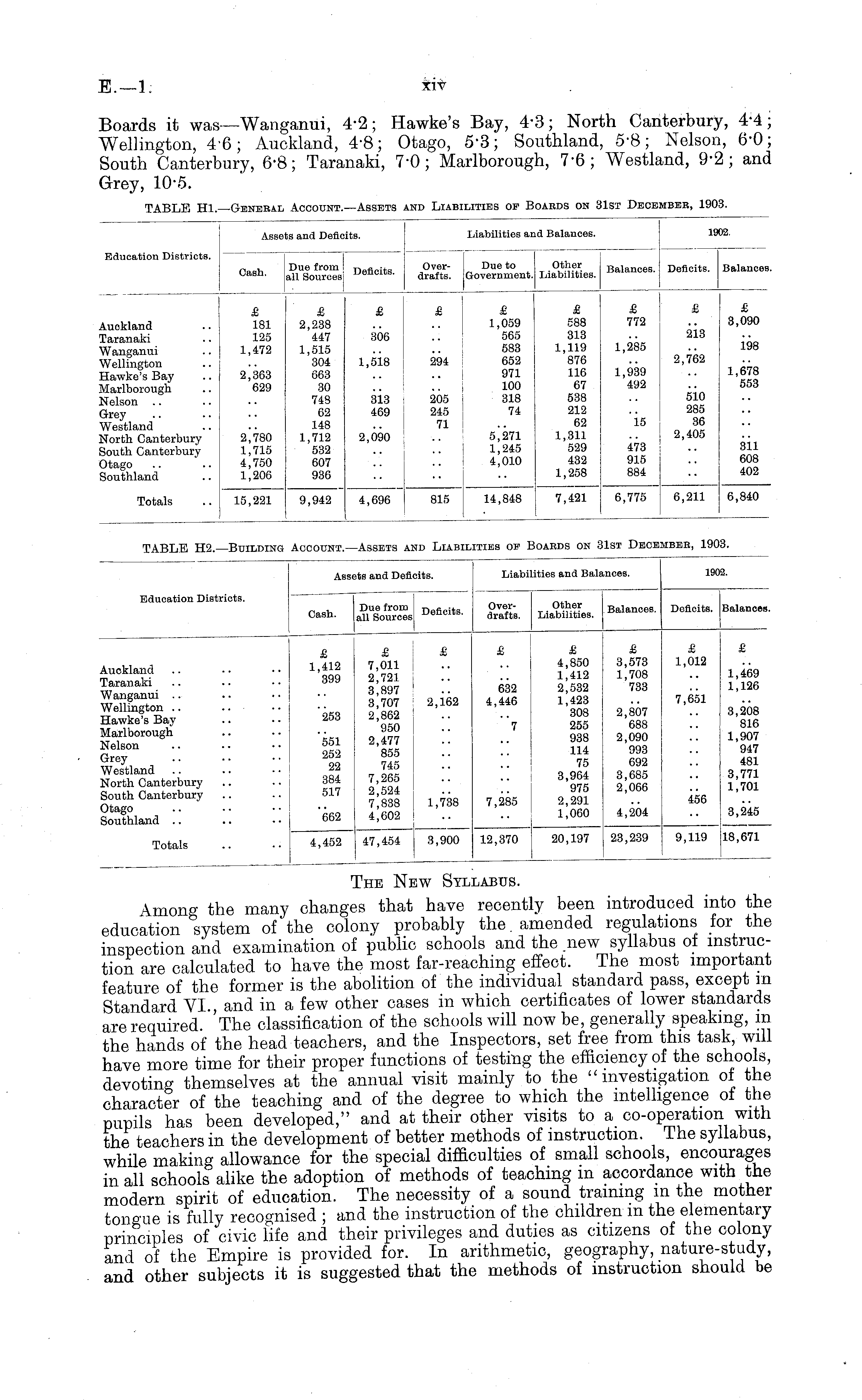 Assets and Deficits. Liabilities and Balances. 1902. Education Districts. Cash. Due from De ficits. all Sources P V T t ■ %h Balances, drafts. Liabilities. Deficits. Balances. £ 1,412 399 £ £ 7,011 ! 2,721 : 3,897 3,707 2,162 2,862 950 2,477 855 745 7,265 2,524 7,838 1,738 4,602 £ £ 4,850 1,412 632 2,532 4,446 1,423 308 7 255 938 114 75 3,964 975 7,285 2,291 1,060 £ 3,573 1,708 733 £ 1,012 £ 1,469 1,126 Auckland Taranaki Wanganui .. Wellington .. Hawke's Bay Marlborough Nelson Grey Westland North Canterbury South Canterbury Otago Southland .. '253 551 252 22 384 517 2,807 688 2,090 993 692 3,685 2,066 7,651 3,208 816 1,907 947 481 3,771 1,701 456 "(362 4,204 3,245 18,671 Totals 12,370 20,197 23,239 9,119 4,452 47,454 3,900