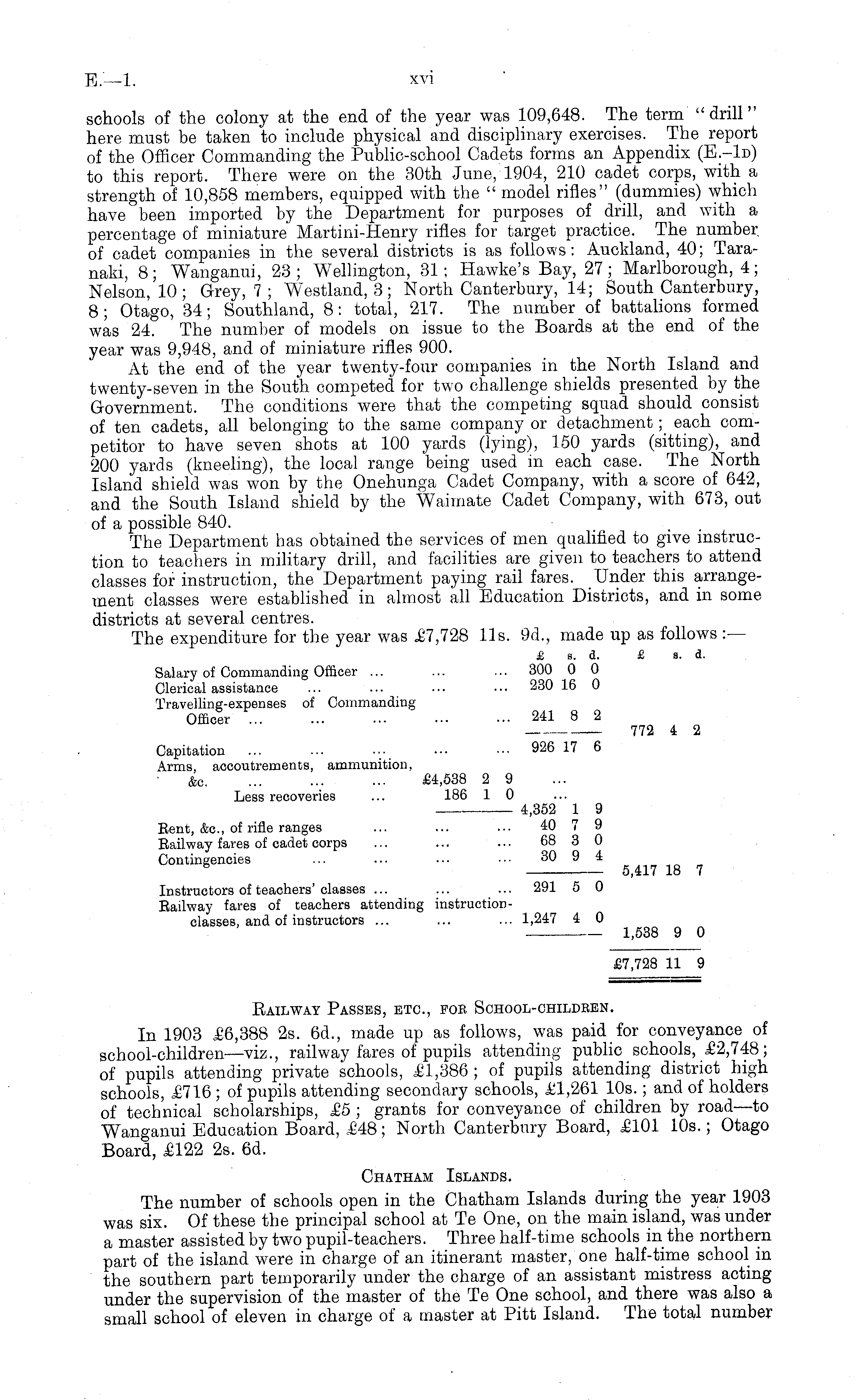 schools of the colony at the end of the year was 109,648. The term "drill" here must be taken to include physical and disciplinary exercises. The report of the Officer Commanding the Public-school Cadets forms an Appendix (E.-1d) to this report. There were on the 30th June, 1904, 210 cadet corps, with a strength of 10,858 members, equipped with the " model rifles" (dummies) which have been imported by the Department for purposes of drill, and with a percentage of miniature Martini-Henry rifles for target practice. The number of cadet companies in the several districts is as follows: Auckland, 40; Taranaki, 8; Wanganui, 23; Wellington, 31; Hawke's Bay, 27; Marlborough, 4; Nelson, 10; Grey, 7 ; Westland, 3; North Canterbury, 14; South Canterbury, 8; Otago, 34; Southland, 8: total, 217. The number of battalions formed was 24. The number of models on issue to the Boards at the end of the year was 9,948, and of miniature rifles 900. At the end of the year twenty-four companies in the North Island and twenty-seven in the South competed for two challenge shields presented by the Government. The conditions were that the competing squad should consist of ten cadets, all belonging to the same company or detachment; each competitor to have seven shots at 100 yards (lying), 150 yards (sitting), and 200 yards (kneeling), the local range being used in each case. The North Island shield was won by the Onehunga Cadet Company, with a score of 642, and the South Island shield by the Waiinate Cadet Company, with 673, out of a possible 840. The Department has obtained the services of men qualified to give instruction to teachers in military drill, and facilities are given to teachers to attend classes for instruction, the Department paying rail fares. Under this arrangement classes were established in almost all Education Districts, and in some districts at several centres. The expenditure for the year was £7,728 lis. 9d., made up as follows :— £ s. d. £ s. d. Salary of Commanding Officer ... ... ... 300 0 0 Clerical assistance ... ... ... ••• 230 16 0 Travelling-expenses of Commanding Officer 241 8 2 772 4 2 Capitation ... ... ... ■•■ ••• 926 17 6 Arms, accoutrements, ammunition, &c. ... ... ... £4,538 2 9 Less recoveries ... 186 10 4,352 1 9 Eent, &c, of rifle ranges ... ... ... 40 7 9 Railway fares of cadet corps ... ... ... 68 3 0 Contingencies ... ... ... ••• 30 9 4 B 5,417 18 7 Instructors of teachers' classes ... ... ... 291 5 0 Railway fares of teachers attending instructionclasses, and of instructors ... ... ... 1,247 4 0 1,538 9 0 £7,728 11 9 Railway Passes, etc., for School-children. In 1903 £6,388 2s. 6d., made up as follows, was paid for conveyance of school-children—viz., railway fares of pupils attending public schools, £2,748; of pupils attending private schools, £1,386 ; of pupils attending district high schools, £716 ; of pupils attending secondary schools, £1,261 10s.; and of holders of technical scholarships, £5 ; grants for conveyance of children by road—to Wanganui Education Board, £48; North Canterbury Board, £101 10s.; Otago Board, £122 2s. 6d. Chatham Islands. The number of schools open in the Chatham Islands during the year 1903 was six. Of these the principal school at Te One, on the main island, was under a master assisted by two pupil-teachers. Three half-time schools in the northern part of the island were in charge of an itinerant master, one half-time school in the southern part temporarily under the charge of an assistant mistress acting under the supervision of the master of the Te One school, and there was also a small school of eleven in charge of a master at Pitt Island. The total number