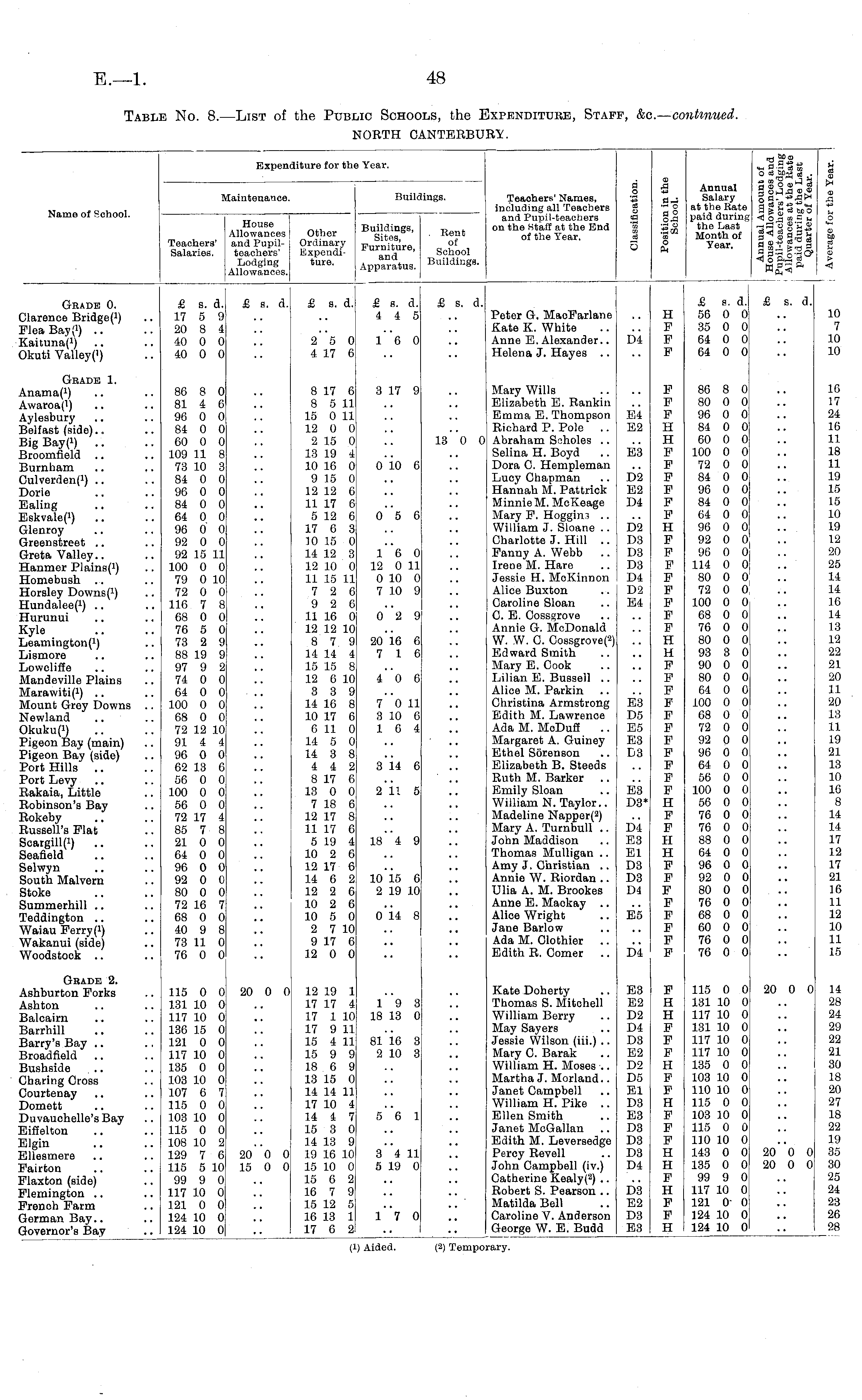 Name of School. [aintenance. Expenditure for thi Year. Buil lings. Teaohers' Names, including all Teachers and Pupil-teachers on the Staff at the End of the Year. a o d o cB "ff; d 3 CD A a a •m o a 2 o.a .« o Son CO O to Annual Salary at the Rate paid during the Last Month of Year. -a 5P® <*-< a ■-. d en O d 6C-£ <a . a g d a> o < on en a i* ~A o °'u ° a^oaSg rt a) +j o3 w » <xga°d^ u d CO I* CD A +j O *w CD CO a CD > Teachers' Salaries. House Allowances and Pupilteachers' Lodging Allowances. Other Ordinary Expenditure. Buildings, Sites, Furniture, and Apparatus. Rent of School Buildings. Gbade 0. Clarence Flea Bay; 1 ) .. KaitunaP) Okuti Valley(') £ s. d. 17 5 9 20 8 4 40 0 0 40 0 0 £ s. d. £ s. d. £ s. d. 4 4 5 £ s. d. £ s. d. 56 0 0 35 0 0 64 0 0 64 0 0 £ s. d. 25 0 4 17 6 l"6 0 Peter G. MacFarlane Kate K. White Anne E.Alexander.. Helena J. Hayes .. 1)4 H F F F 10 7 10 10 Gbade 1. Anamap) Awaroa(l) Aylesbury Belfast (side).. Big Bay(i) .. Broomfield .. Burnham Culverdenf 1 ) .. Dorie Ealing Eskvalef 1 ) Glenroy Greenstreet .. Greta Valley.. Hanmer Homebush .. Horsley Downs (*) Hundalee( x ) .. Hurunui Kyle Leamington P) Lismore Lowcliffe Mandeville Plains Marawitif 1 ) .. Mount Grey Downs Newland Okuku(!) Pigeon Bay (main) Pigeon Bay (side) Port Hills .. Port Levy Rakaia, Little Robinson's Bay Rokeby Russell's Flat Scargill(i) .. Seafield Selwyn South Malvern Stoke Summerhill .. Teddington .. Waiau Ferry(r) Wakanui (side) Woodstock .. 86 8 0 81 4 6 96 0 0 84 0 0 60 0 0 109 11 8 73 10 3 84 0 0 96 0 0 84 0 0 64 0 0 96 0 0 92 0 0 92 15 11 100 0 0 79 0 10 72 0 0 116 7 8 68 0 0 76 5 0 73 2 9 88 19 9 97 9 2 74 0 0 64 0 0 100 0 0 68 0 0 72 12 10 91 4 4 96 0 0 62 13 6 56 0 0 100 0 0 56 0 0 72 17 4 85 7 8 21 0 0 64 0 0 96 0 0 92 0 0 80 0 0 72 16 7 68 0 0 40 9 8 73 11 0 76 0 0 8 17 6 8 5 11 15 0 11 12 0 0 2 15 0 13 19 4 10 16 0 9 15 0 12 12 6 11 17 6 5 12 6 17 6 3 10 15 0 14 12 3 12 10 0 11 15 11 7 2 6 9 2 6 11 16 0 12 12 10 8 7 9 14 14 4 15 15 8 12 6 10 3 3 9 14 16 8 10 17 6 6 11 0 14 5 0 14 3 8 4 4 2 8 17 6 13 0 0 7 18 6 12 17 8 11 17 6 5 19 4 10 2 6 12 17 6 14 6 2 12 2 6 10 2 6 10 5 0 2 7 10 9 17 6 12 0 0 3 17 9 o'io 6 o"5 6 16 0 12 0 11 0 10 0 7 10 9 0 2 9 2016 6 7 16 40 6 13"o 0 Mary Wills Elizabeth E. Rankin Emma E. Thompson Richard P. Pole .. Abraham Scholes .. Selina H. Boyd Dora C. Hempleman Lucy Chapman Hannah M. Pattrick Minnie M. McKeage Mary F. Hoggim .. William J. Sloane .. Charlotte J. Hill .. Fanny A. Webb Irene M. Hare Jessie H. McKinnon Alice Buxton Caroline Sloan C. E. Cossgrove Annie G. McDonald W. W. C. Cossgrove( 2 ) Edward Smith Mary E. Cook Lilian E. Bussell .. Alice M. Parkin Christina Armstrong Edith M. Lawrence Ada M. MoDuff .. Margaret A. Guiney Ethel Sorenson Elizabeth B. Steeds Ruth M. Barker .. Emily Sloan William N.Taylor.. Madeline Napper( a ) Mary A. Turnbull .. John Maddison Thomas Mulligan .. Amy J. Christian .. Annie W. Riordan .. Ulia A. M. Brookes Anne E. Mackay .. Alice Wright Jane Barlow Ada M. Clothier .. Edith R. Comer E4 E2 E3 D2 E2 D4 D2 D3 D3 D3 D4 D2 E4 F F F H H F F F F F F H F F F F F F F F H H F F F F F F F F F F F H F F H H F F F F F F F F 86 8 0 80 0 0 96 0 0 84 0 0 60 0 0 100 0 0 72 0 0 84 0 0 96 0 0 84 0 0 64 0 0 96 0 0 92 0 0 96 0 0 114 0 0 80 0 0 72 0 0 100 0 0 68 0 0 76 0 0 80 0 0 93 3 0 90 0 0 80 0 0 64 0 0 100 0 0 68 0 0 72 0 0 92 0 0 96 0 0 64 0 0 56 0 0 100 0 0 56 0 0 76 0 0 76 0 0 88 0 0 64 0 0 96 0 0 92 0 0 80 0 0 76 0 0 68 0 0 60 0 0 76 0 0 76 0 0 16 17 24 16 11 1.8 11 19 15 15 10 19 12 20 25 1-1 14 10 14 13 12 22 21 20 11 20 13 11 19 21 13 10 16 8 14 14 17 12 17 21 10 11 12 10 11 18 7 0 11 3 10 6 10 4 E3 D5 E5 E3 D3 314 6 2 11 5 E3 D3* 1S"4 9 D4 E3 El D3 D3 D4 1015 6 2 19 10 014 8 E5 D4 Gbade 2. Ashburton Forks Ashton Balcairn Barrhill Barry's Bay .. Broadfield Bushside Charing Cross Courtenay Domett Duvauchelle's Bay Eiffelton Elgin Ellesmere Fairton Flaxton (side) Flemington .. French Farm German Bay.. Governor's Bay 115 0 0 131 10 0 117 10 0 136 15 0 121 0 0 117 10 0 135 0 0 103 10 0 107 6 7 115 0 0 103 10 0 115 0 0 108 10 2 129 7 6 115 5 10 99 9 0 117 10 0 121 0 0 124 10 0 124 10 0 20 0 0 12 19 1 17 17 4 17 1 10 17 9 11 15 4 11 15 9 9 18 6 9 13 15 0 14 14 11 17 10 4 14 4 7 15 3 0 14 13 9 19 16 10 15 10 0 15 6 2 16 7 9 15 12 5 16 13 1 17 6 2 1*9 3 18 13 0 81 16 3 2 10 3 5*6 1 Kate Doherty Thomas S. Mitchell William Berry May Sayers Jessie Wilson (iii.) .. Mary C. Barak William H. Moses .. Martha J. Morland.. Janet Campbell William H. Pike .. Ellen Smith Janet McGallan Edith M. Leversedge Percy Revell John Campbell (iv.) Catherine Kealy( 2 ) .. Robert S. Pearson .. Matilda Bell Caroline V. Anderson George W. E. Budd E3 E2 D2 D4 D3 E2 D2 D5 El D3 E3 D3 D3 D3 D4 F H H F F F II F F H F F F H H F H F F H 115 0 0 131 10 0 117 10 0 131 10 0 117 10 0 117 10 0 135 0 0 103 10 0 110 10 0 115 0 0 103 10 0 115 0 0 110 10 0 143 0 0 135 0 0 99 9 0 117 10 0 121 0- 0 124 10 0 124 10 0 20 0 0 14 28 24 29 22 21 30 18 20 27 18 22 I!) 35 80 25 24 23 26 28 20' 0 0 15 0 0 3 4 11 5 19 0 2o"o 0 20 0 0 1**7 0 D3 E2 D3 E3 Aided. Tern] irar;