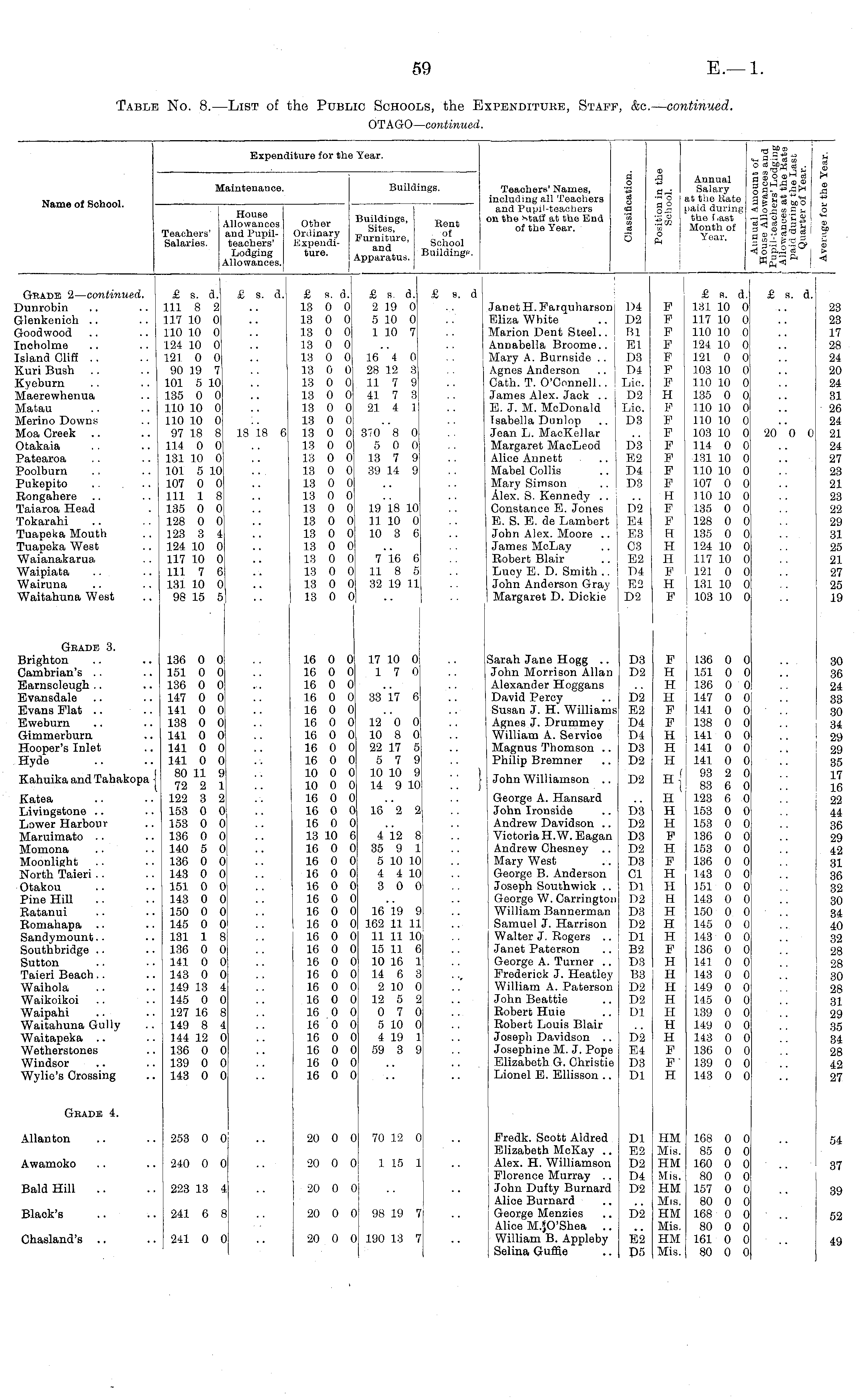 OTAGO — continued Name of School. House Allowances Other Teachers' and Pupil- Ordinary Salaries. teachers' ExpendiLodging ture. Allowances. Maintenance. Expenditure for th< Year. Buildings. Teachers' Names, including all Teachers and Pupil-teachers on the staff at the End of the Year. a o d o ca d 5 CD a a "-* o a a on ._. 0 ."Sen o to Annual Salary at the Rate paid during the Last Month of Year, "4. 3 a. d co O d d . g a- 4*nx a C- ~ d 6DO < on co a i, «S o g'E % u d CO |M CD A o CD CD 5 > Buildings, Sites, Furniture, and Apparatus. Rent of School Building'-. Gbade 2 — continued. Dunrobin Glenkenich Goodwood Incholme Island Cliff Kuri Bush Kyeburn Maerewhenua Matau Merino Downs Moa Creek Otakaia Patearoa Poolburn Pukepito Rongahere Taiaroa Head Tokarahi Tuapeka Mouth Tuapeka West Waianakarua Waipiata Wairuna Waitahuna West £ s. d. Ill 8 2 117 10 0 110 10 0 124 10 0 121 0 0 90 19 7 101 5 10 135 0 0 110 10 0 110 10 0 97 18 8 114 0 0 131 10 0 101 5 10 107 0 0 111 1 8 135 0 0 128 0 0 123 3 4 124 10 0 117 10 0 111 7 6 131 10 0 98 15 5 I £ s. d. £ s. d 13 0 ( 13 0 ( 13 0 ( 13 0 ( 13 0 ( 13 0 ( 13 0 I 13 0 I 13 0 I 13 0 I 13 0 i 13 0 i 13 0 i 13 0 < 13 0 13 0 13 0 13 0 13 0 13 0 13 0 13 0 13 0 13 0 £ s. d.l 2 19 0 5 10 0 1 10 7 £ s. d Janet HFarquharson Eliza White Marion Dent Steel.. Annabella Broome.. Mary A. Burnside .. Agnes Anderson Oath. T. O'Connell.. James Alex. Jack .. j E. J. M. McDonald Isabella Dunlop Jean L. MacKellar Margaret MacLeod Alice Annett Mabel Collis Mary Sim son Alex. S. Kennedy .. Constance E. Jones E. S. E. de Lambert j John Alex. Moore .. James McLay Robert Blair Luoy E. D. Smith .. John Anderson Gray Margaret D. Dickie 1)4 D2 Bl El 1)3 D4 Lie. D2 Lie. D3 F F F F F F F H ¥ ¥ F F F F F H F F H H H F H F £ s. d. 131 10 0 117 10 0 110 10 0 124 10 0 121 0 0 103 10 0 110 10 0 135 0 0 110 10 0 110 10 0 103 10 0 114 0 0 131 10 0 110 10 0 107 0 0 no io o 135 0 0 128 0 0 135 0 0 124 10 0 117 10 0 121 0 0 131 10 0 103 10 0 £ s. d. 23 23 17 28 2-1 20 24 31 26 2:1 21 24 27 23 21 23 22 2!) 31 25 21 27 25 19 16 4 0 28 12 3 11 7 9 41 7 3 21 4 1 18 18 6 370 8 0 5 0 0 13 7 9 39 14 9 20 0 0 D3 E2 D4 D3 19 18 10 11 10 0 10 3 6 1)2 E4 E3 C3 E2 1)4 E2 D2 7 16 6 11 8 5 32 19 11 Gbade 3. Brighton Cambrian's Earnscleugh Evansdale Evans Flat Eweburn Gimmerbum Hooper's Inlet Hyde Kahuika and Tahakopa j 136 0 0 151 0 0 136 0 0 147 0 0 141 0 0 138 0 0 141 0 0 141 0 0 141 0 0 80 11 9 72 2 1 122 3 2 153 0 0 153 0 0 136 0 0 140 5 0 136 0 0 143 0 0 151 0 0 143 0 0 150 0 0 145 0 0 131 1 8 136 0 0 141 0 0 143 0 0 149 13 4 145 0 0 127 16 8 149 8 4 144 12 0 136 0 0 139 0 0 143 0 0 16 0 0 16 0 0 16 0 0 16 0 0 16 0 0 16 0 0 16 0 0 16 0 0 16 0 0 10 0 0 10 0 0 16 0 0 16 0 0 16 0 0 13 10 6 16 0 0 16 0 0 16 0 0 16 0 0 16 0 0 16 0 0 16 0 0 16 0 0 16 0 0 16 0 0 16 0 0 16 0 0 16 0 0 16 0 0 16 0 0 16 0 0 16 0 0 16 0 0 16 0 0 17 10 0 17 0 33 17 6 12 0 0 10 8 0 22 17 5 5 7 9 10 10 9 14 9 10 Sarah Jane Hogg .. John Morrison Allan Alexander Hoggans David Percy Susan J. H. Williams Agnes J. Drummey William A. Service Magnus Thomson .. Philip Bremner D3 D2 D2 E2 D4 D4 D3 D2 F H H H F F H H H 136 0 0 151 0 0 136 0 0 147 0 0 141 0 0 138 0 0 141 0 0 141 0 0 141 0 0 93 2 0 83 6 0 123 6 0 153 0 0 153 0 0 136 0 0 153 0 0 136 0 0 143 0 0 151 0 0 143 0 0 150 0 0 145 0 0 143 0 0 136 0 0 141 0 0 143 0 0 149 0 0 145 0 0 139 0 0 149 0 0 143 0 0 136 0 0 139 0 0 143 0 0 30 36 24 83 30 34 29 29 35 17 16 22 11 36 29 42 31 30 32 30 84 40 32 28 28 30 28 31 29 35 34 28 4 2 27 ) John Williamson .. D2 H H H F H F H H H H H H F H H H H H H H F F H Katea Livingstone Lower Harbour Maruimato Momona Moonlight North Taieri Otakou Pine Hill Ratanui Romahapa Sandymount Southbridge Sutton Taieri Beach Waihola Waikoikoi .. Waipahi Waitahuna Gully Waitapeka Wetherstones Windsor Wylie's Crossing ie"2 2 4 12 8 35 9 1 5 10 10 4 4 10 3 0 0 16 19 9 162 11 11 11 11 10 15 11 6 10 16 1 14 6 3 2 10 0 12 5 2 0 7 0 5 10 0 4 19 1 59 3 9 George A. Hansard John Ironside Andrew Davidson .. | Victoria H.W.Eagan Andrew Chesney .. { Mary West George B. Anderson Joseph Southwick .. George W. Carrington William Bannerman Samuel J. Harrison Walter J. Rogers .. Janet Pateraon George A. Turner .. Frederick J. Heatley William A. Paterson John Beattie Robert Huie Robert Louis Blair Joseph Davidson .. Josephine M. J. Pope Elizabeth G. Christie Lionel E. Ellisson .. D3 D2 D3 D2 D3 CI Dl D2 D3 D2 Dl B2 D3 B3 D2 D2 Dl D2 B4 D3 Dl Gbade 4. 70 12 0 Fredk. Scott Aldred Elizabeth McKay .. Alex. H. Williamson Florence Murray .. John Dufty Burnard Alice Burnard George Menzies Alice M.JO'Shea .. William B. Appleby Selina Guffie Allanton 253 0 0 20 0 0 Dl E2 T)2 D4 D2 HM Mis. HM Mis. HM Mis. HM Mis. HM Mis. 168 0 0 85 0 0 160 0 0 80 0 0 157 0 0 80 0 0 168 0 0 80 0 0 161 0 0 80 0 0 5. Awamoko 240 0 0 20 0 0 1 15 1 3' Bald Hill 223 13 4 20 0 0 3! Blaok's 241 6 8 20 0 0 98 19 7 D2 5! Chasland's 241 0 0 20 0 0 190 13 7 E2 D5 4: