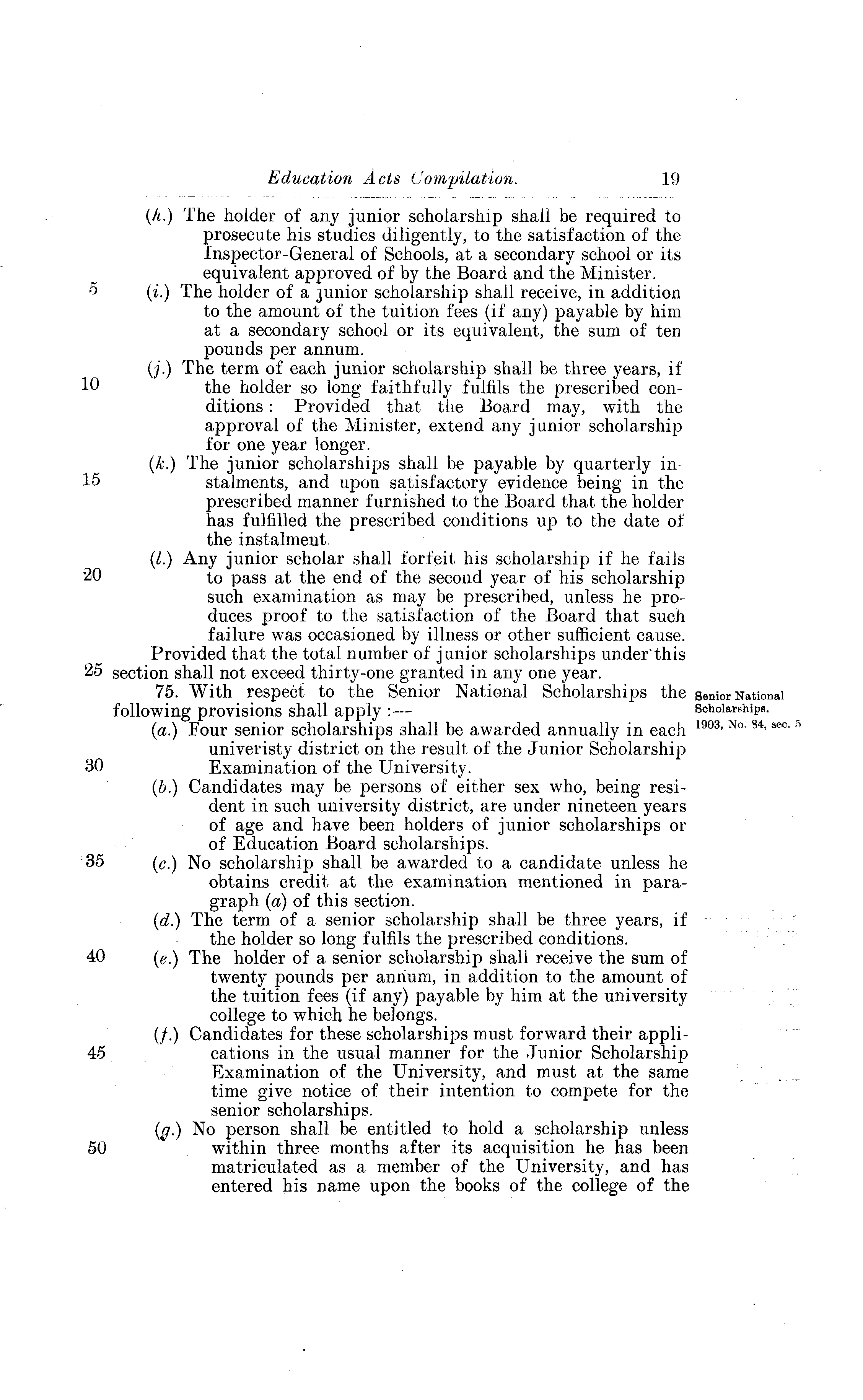 {It.) The holder of any junior scholarship shall be required to prosecute his studies diligently, to the satisfaction of the Inspector-General of Schools, at a secondary school or its equivalent approved of by the Board and the Minister. 5 (i.) The holder of a junior scholarship shall receive, in addition to the amount of the tuition fees (if any) payable by him at a secondary school or its equivalent, the sum of ten pounds per annum. (j.) The term of each junior scholarship shall be three years, if 10 the holder so long faithfully fulfils the prescribed conditions : Provided that the Board may, with the approval of the Minister, extend any junior scholarship for one year longer. (k.) The junior scholarships shall be payable by quarterly in 15 stalments, and upon satisfactory evidence being in the prescribed manner furnished to the Board that the holder has fulfilled the prescribed conditions up to the date of the instalment. (1.) Any junior scholar shall forfeit, his scholarship if he fails 20 to pass at the end of the second year of his scholarship such examination as may be prescribed, unless he produces proof to the satisfaction of the Board that such failure was occasioned by illness or other sufficient cause. Provided that the total number of junior scholarships under this 25 section shall not exceed thirty-one granted in any one year. 75. With respect to the Senior National Scholarships the following provisions shall apply : — (a.) Four senior scholarships shall be awarded annually in each univeristy district on the result of the Junior Scholarship 30 Examination of the University. (b.) Candidates may be persons of either sex who, being resident in such university district, are under nineteen years of age and have been holders of junior scholarships or of Education Board scholarships. 35 ( 6 -.) No scholarship shall be awarded to a candidate unless he obtains credit at the examination mentioned in paragraph (a) of this section. (d.) The term of a senior scholarship shall be three years, if the holder so long fulfils the prescribed conditions. 40 {c) The holder of a senior scholarship shall receive the sum of twenty pounds per annum, in addition to the amount of the tuition fees (if any) payable by him at the university college to which he belongs. (/.) Candidates for these scholarships must forward their appli--45 cations in the usual manner for the Junior Scholarship Examination of the University, and must at the same time give notice of their intention to compete for the senior scholarships. {g.) No person shall be entitled to hold a scholarship unless 50 within three months after its acquisition he has been matriculated as a member of the University, and has entered his name upon the books of the college of the