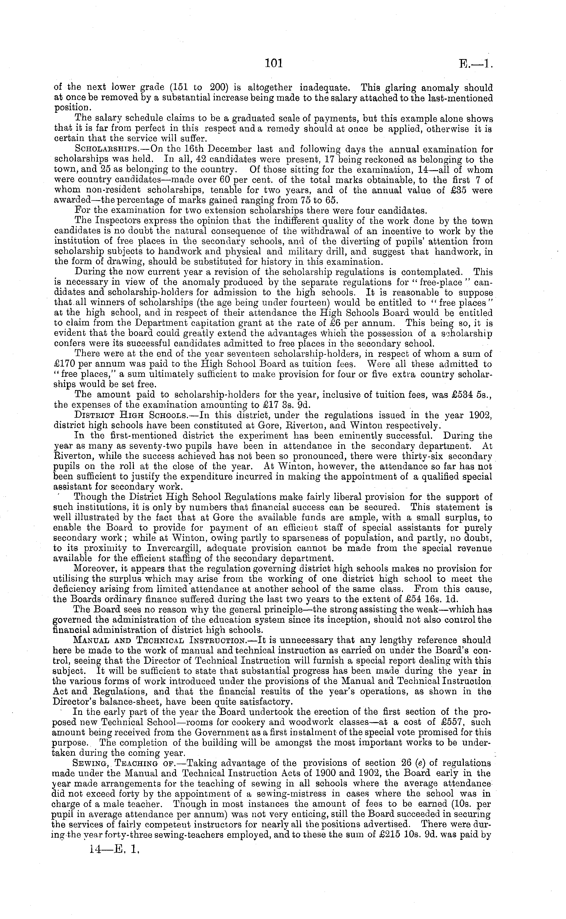 of the next lower grade (151 to 200) is altogether inadequate. This glaring anomaly should at once be removed by a substantial increase being made to the salary attached to the last-mentioned position. The salary schedule claims to be a graduated scale of payments, but this example alone shows that it is far from perfect in this respect and a remedy should at once be applied, otherwise it is certain that the service will suffer. Scholarships.—On the 16th December last and following days the annual examination for scholarships was held. In all, 42 candidates were present, 17 being reckoned as belonging to the town, and 25 as belonging to the country. Of those sitting for the examination, 14—all of whom were country candidates—made over 60 per cent, of the total marks obtainable, to the first 7 of whom non-resident scholarships, tenable for two years, and of the annual value of £35 were awarded—the percentage of marks gained ranging from 75 to 65. For the examination for two extension scholarships there were four candidates. The Inspectors express the opinion that the indifferent quality of the work done by the town candidates is no doubt the natural consequence of the withdrawal of an incentive to work by the institution of free places in the secondary schools, and of the diverting of pupils' attention from scholarship subjects to handwork and physical and military drill, and suggest that handwork, in the form of drawing, should be substituted for history in this examination. During the now current year a revision of the scholarship regulations is contemplated. This is necessary in view of the anomaly produced by the separate regulations for "free-place " candidates and scholarship-holders for admission to the high schools. It is reasonable to suppose that.all winners of scholarships (the age being under fourteen) would be entitled to " free places " at the high school, and in respect of their attendance the High Schools Board would be entitled to claim from the Department capitation grant at the rate of £6 per annum. This being so, it is evident that the board could greatly extend the advantages Which the possession of a scholarship confers were its successful candidates admitted to free places in the secondary school. There were at the end of the year seventeen scholarship-holders, in respect of whom a sum of £170 per annum was paid to the High School Board as tuition fees. Were all these admitted to " free places," a sum ultimately sufficient to make provision for four or five extra country scholarships would be set free. The amount paid to scholarship-holders for the year, inclusive of tuition fees, was £534 55., the expenses of the examination amounting to £17 3s. 9d. District High Schools. —In this district, under the regulations issued in the year 1902, district high schools have been constituted at Gore, Riverton, and Winton respectively. In the first-mentioned district the experiment has been eminently successful. During the year as many as seventy-two pupils have been in attendance in the secondary department. At Riverton, while the success achieved has not been so pronounced, there were thirty-six secondary pupils on the roll at the close of the year. At Winton, however, the attendance so far has not been sufficient to justify the expenditure incurred in making the appointment of a qualified special assistant for secondary work. Though the District High School Regulations make fairly liberal provision for the support of such institutions, it is only by numbers that financial success can be secured. This statement is well illustrated by the fact that at Gore the available funds are ample, with a small surplus, to enable the Board to provide for payment of an efficient staff of special assistants for purely secondary work; while at Winton, owing partly to sparseness of population, and partly, no doubt, to its proximity to Invercargill, adequate provision cannot be made from the special revenue available for the efficient staffing of the secondary department. Moreover, it appears that the regulation governing district high schools makes no provision for utilising the surplus which may arise from the working of one district high school to meet the deficiency arising from limited attendance at another school of the same class. From this cause, the Boards ordinary finance suffered during the last two years to the extent of £54 16s. Id. The Board sees no reason why the general principle—the strong assisting the weak—which has governed the administration of the education system since its inception, should not also control the financial administration of district high schools. Manual and Technical Instruction.—lt is unnecessary that any lengthy reference should here be made to the work of manual and technical instruction as carried on under the Board's control, seeing that the Director of Technical Instruction will furnish a special report dealing with this subject. It will be sufficient to state that substantial progress has been made during the year in the various forms of work introduced under the provisions of the Manual and Technical Instruction Act and Regulations, and that the financial results of the year's operations, as shown in the Director's balance-sheet, have been quite satisfactory. In the early part of the year the Board undertook the erection of the first section of the proposed new Technical School—rooms for cookery and woodwork classes—at a cost of £557, such amount being received from the Government as a first instalment of the special vote promised for this purpose. The completion of the building will be amongst the most important works to be undertaken during the coming year. Sewing, Teaching of. —Taking advantage of the provisions of section 26 (e) of regulations made under the Manual and Technical Instruction Acts of 1900 and 1902, the Board early in the year made arrangements for the teaching of sewing in all schools where the averag