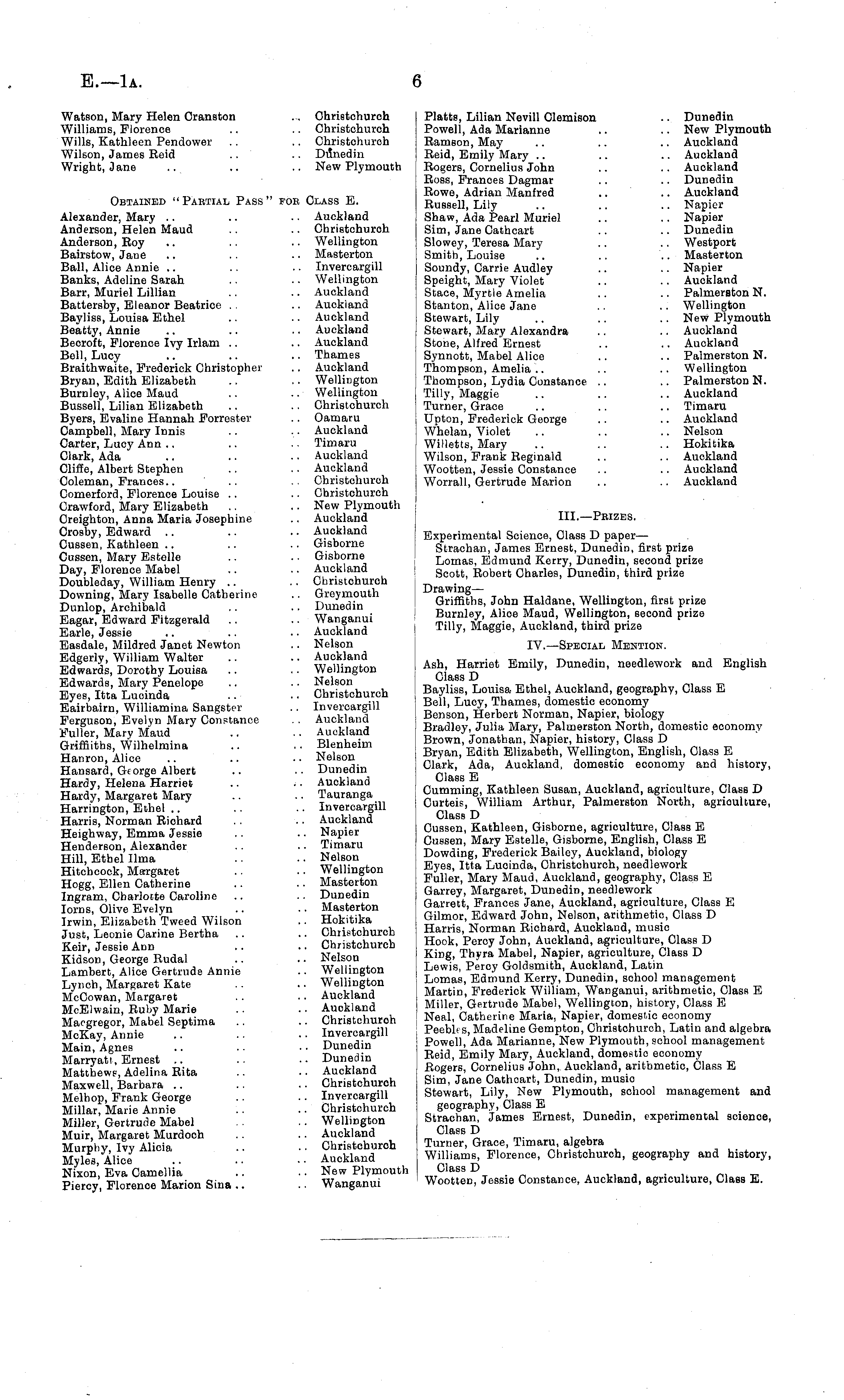 Platts, Lilian Nevill Clemison .. Dunedin Powell, Ada Marianne .. .. New Plymouth Ramson, May .. .. .. Auckland Reid, Emily Mary .. .. .. Auckland Rogers, Cornelius John .. .. Auokland Ross, Frances Dagmar .. .. Dunedin Rowe, Adrian Manfred .. .. Auckland Russell, Lily .. .. .. Napier Shaw, Ada Pearl Muriel .. .. Napier Sim, Jane Cathcart .. .. Dunedin Slowey, Teresa Mary .. .. Westport Smith, Louise .. .. .. Masterton Soundy, Carrie Audley .. .. Napier Speight, Mary Violet .. .. Auckland Stace, Myrtle Amelia .. .. Palmerston N. Stanton, Alice Jane .. .. Wellington Stewart, Lily .. .. .. New Plymouth Stewart, Mary Alexandra .. .. Auckland Stone, Alfred Ernest .. .. Auckland Synnott, Mabel Alice .. .. Palmerston N. Thompson, Amelia .. .. .. Wellington Thompson, Lydia Constance .. .. Palmerston N. Tilly, Maggie .. .. .. Auckland Turner, Grace .. .. .. Timaru Upton, Frederick George .. .. Auokland Whelan, Violet .. .. .. Nelson Willetts, Mary .. .. .. Hokitika Wilson, Frank Reginald .. .. Auckland Wootten, Jessie Constance .. .. Auckland Worrall, Gertrude Marion .. .. Auckland 111. —Prizes. Experimental Science, Class D paper — Strachan, James Ernest, Dunedin, first prize Lomas, Edmund Kerry, Dunedin, second prize Scott, Robert Charles, Dunedin, third prize Drawing— Griffiths, John Haldane, Wellington, first prize Burnley, Alioe Maud, Wellington, second prize Tilly, Maggie, Auckland, third prize IV. —Special Mention. Ash, Harriet Emily, Dunedin, needlework and English Class D Bayliss, Louisa Ethel, Auckland, geography, Class E Bell, Lucy, Thames, domestic economy Benson, Herbert Norman, Napier, biology Bradley, Julia Mary, Palmerston North, domestic economy Brown, Jonathan, Napier, history, Class D Bryan, Edith Elizabeth, Wellington, English, Class E Clark, Ada, Auckland, domestic economy and history, Class E Cumming, Kathleen Susan, Auckland, agriculture, Class D Curteis, William Arthur, Palmerston North, agrioulture, Class D Cussen, Kathleen, Gisborne, agriculture, Class E Cussen, Mary Estelle, Gisborne, English, Class E Dowding, Frederick Bailey, Auckland, biology Eyes, Itta Lucinda, Christohurch, needlework Fuller, Mary Maud, Auckland, geography, Class E Garrey, Margaret, Dunedin, needlework Garrett, Frances Jane, Auokland, agriculture, Class E Gilmor, Edward John, Nelson, arithmetic, Class D Harris, Norman Richard, Auckland, music Hook, Percy John, Auokland, agriculture, Class D King, Thyra Mabel, Napier, agriculture, Class D Lewis, Percy Goldsmith, Auokland, Latin Lomas, Edmund Kerry, Dunedin, school management Martin, Frederick William, Wanganui, arithmetic, Class E Miller, Gertrude Mabel, Wellington, history, Class E Neal, Catherine Maria, Napier, domestic economy Peebles, Madeline Gempton, Christchurch, Latin and algebra Powell, Ada Marianne, New Plymouth, school management Reid, Emily Mary, Auckland, domestic economy Rogers, Cornelius John, Auckland, arithmetic, Class E Sim, Jane Cathoart, Dunedin, musio Stewart, Lily, New Plymouth, school management and geography, Class E Strachan, James Ernest, Dunedin, experimental science, Class D Turner, Grace, Timaru, algebra Williams, Florence, Christchurch, geography and history, Class D Wootten, Jessie Constance, Auckland, agriculture, Class E.