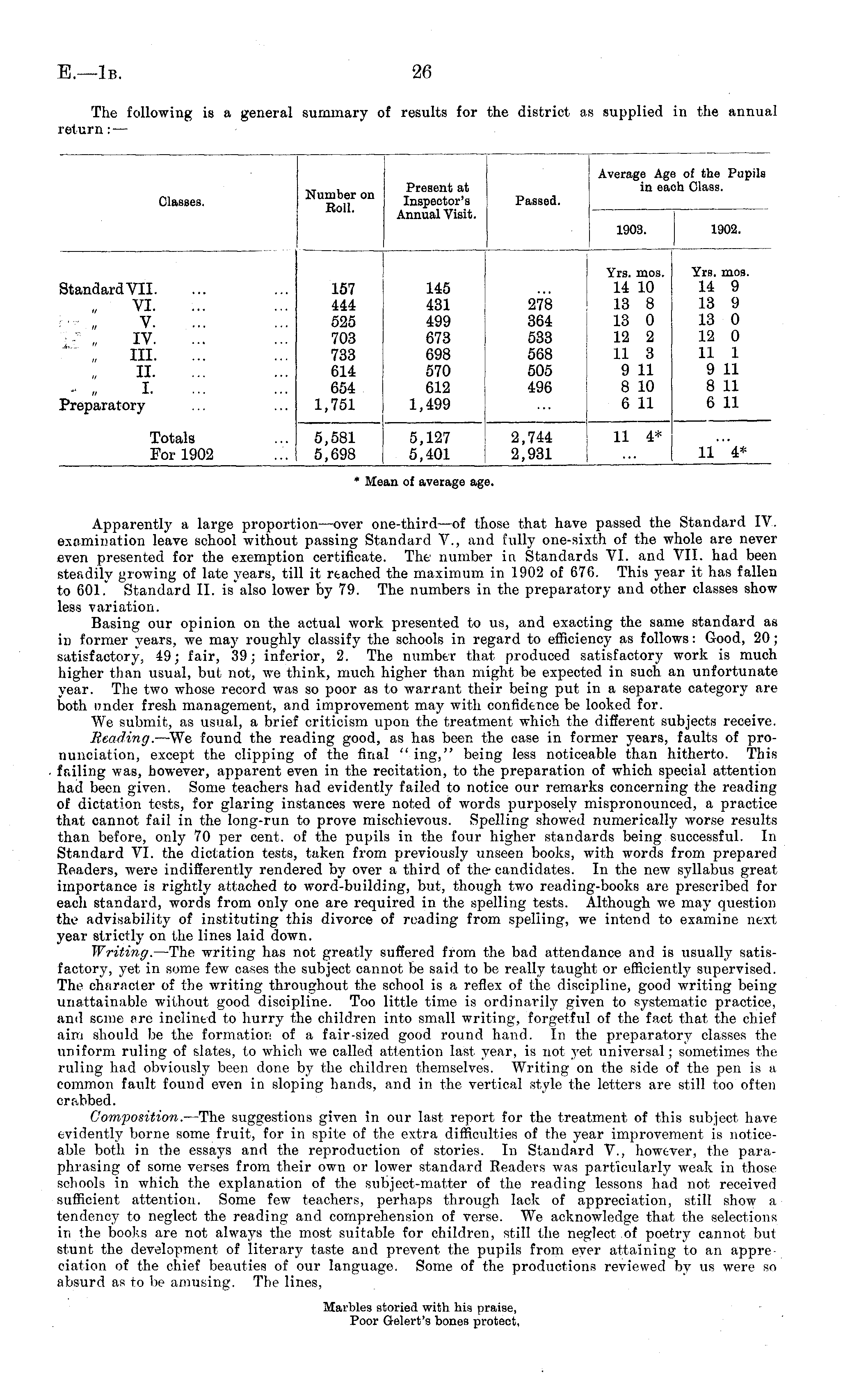 Classes. Number on Roll. Present at Inspector's Annual Visit. Passed. Average Age of the Pupils in each Class. 1903. 1902. Standard VII. VI. :■- „ V. 'Il « iv. ... III. II. - . I. 157 444 525 703 733 614 654 1,751 145 431 499 673 698 570 612 1,499 278 364 533 568 505 496 Yrs. mos. 14 10 13 8 13 0 12 2 11 3 9 11 8 10 6 11 Yrs. mos. 14 9 13 9 13 0 12 0 11 1 9 11 8 11 6 11 Preparatory Totals For 1902 5,581 5,698 5,127 5,401 2,744 2,931 11 4* 11" 4* • Mi ian of average agi