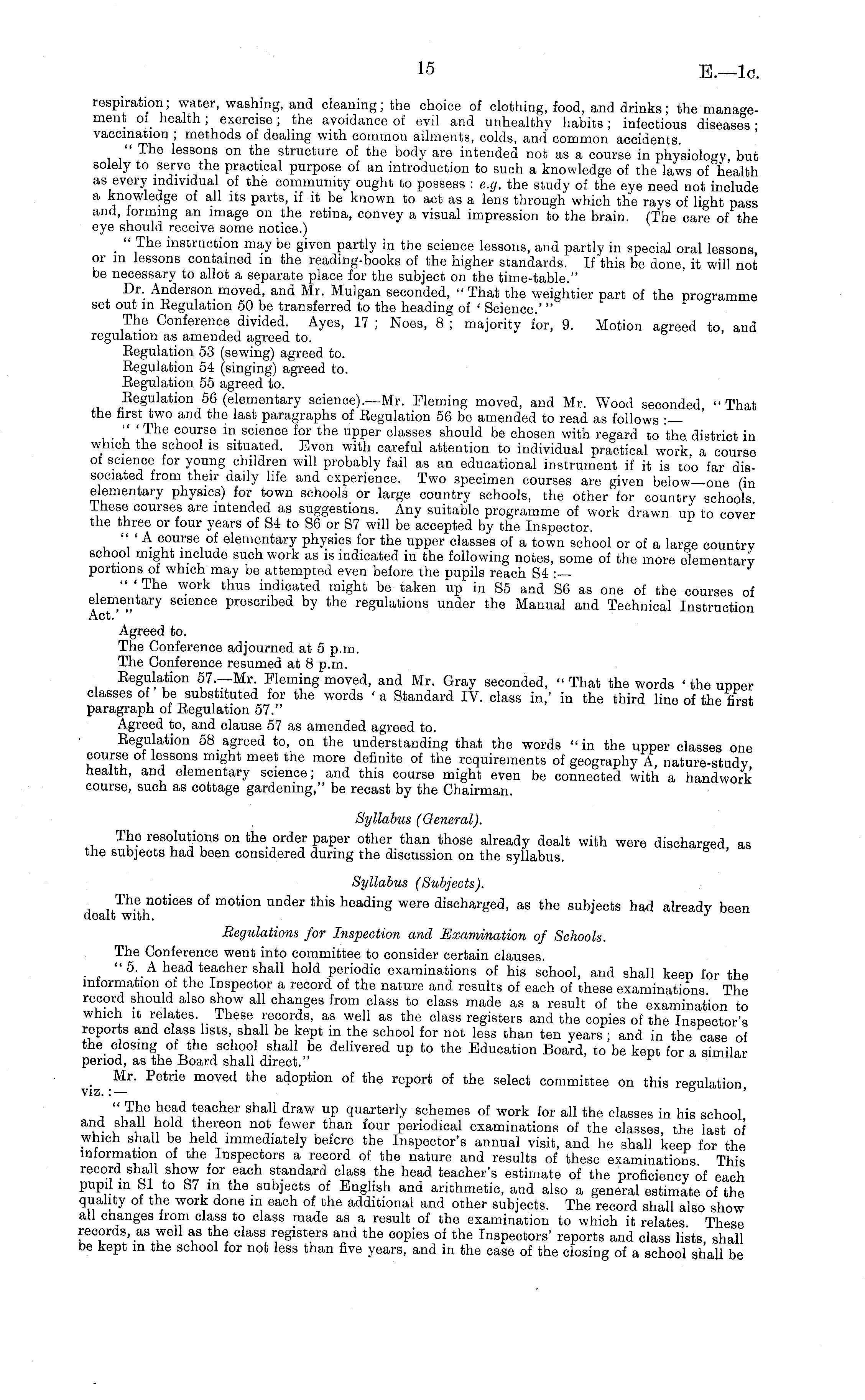 respiration; water, washing, and cleaning; the choice of clothing, food, and drinks; the management of health ; exercise; the avoidance of evil and unhealthy habits ; infectious diseases ; vaccination ; methods of dealing with common ailments, colds, and" common accidents. " The lessons on the structure of the body are intended not as a course in physiology but solely to serve the practical purpose of an introduction to such a knowledge of the laws of health as every individual of the community ought to possess : e.g, the study of the eye need not include a knowledge of all its parts, if it be known to act as a lens through which the rays of li<?ht pass and, forming an image on the retina, convey a visual impression to the brain. (The care of the eye should receive some notice.) " The instruction may be given partly in the science lessons, and partly in special oral lessons or m lessons contained in the reading-books of the higher standards. If'this be done, it will not be necessary to allot a separate place for the subject on the time-table." Dr. Anderson moved, and Mr. Mulgan seconded, "That the weightier part of the programme set out in Eegulation 50 be transferred to the heading of ' Science.' " The Conference divided. Ayes, 17 ; Noes, 8 ; majority for, 9. Motion agreed to and regulation as amended agreed to. Eegulation 53 (sewing) agreed to. Eegulation 54 (singing) agreed to. Eegulation 55 agreed to. Eegulation 56 (elementary science).—Mr. Fleming moved, and Mr. Wood seconded " That the first two and the last paragraphs of Eegulation 56 be amended to read as follows :— " 'The course in science for the upper classes should be chosen with regard to the district in which the school is situated. Even with careful attention to individual practical work a course of science for young children will probably fail as an educational instrument if it is too far dissociated from their daily life and experience. Two specimen courses are given below—one (in elementary physics) for town schools or large country schools, the other for country schools lhese courses are intended as suggestions. Any suitable programme of work drawn up to cover the three or four years of S4 to S6 or S7 will be accepted by the Inspector. " ' A course of elementary physics for the upper classes of a town school or of a large country school might include such work as is indicated in the following notes, some of the more elementary portions of which may be attempted even before the pupils reach S4 :— " ' The work thus indicated might be taken up in S5 and S6 as one of the courses of elementary science prescribed by the regulations under the Manual and Technical Instruction Act. Agreed to. The Conference adjourned at 5 p.m. The Conference resumed at 8 p.m. Eegulation 57.—Mr. Fleming moved, and Mr. Gray seconded, " That the words ' the upper classes of be substituted for the words 'a Standard IV. class in, , in the third line of the first paragraph of Eegulation 57." Agreed to, and clause 57 as amended agreed to. Eegulation 58 agreed to, on the understanding that the words "in the upper classes one course of lessons might meet the more definite of the requirements of geography A nature-study health, and elementary science; and this course might even be connected with a handwork course, such as cottage gardening," be recast by the Chairman. Syllabus (General). The resolutions on the order paper other than those already dealt with were discharged as the subjects had been considered during the discussion on the syllabus. Syllabus (Subjects). The notices of motion under this heading were discharged, as the subjects had already been dealt with. J Regulations for Inspection and Examination of Schools. The Conference went into committee to consider certain clauses. "5. A head teacher shall hold periodic examinations of his school, and shall keep for the information of the Inspector a record of the nature and results of each of these examinations The record should also show all changes from class to class made as a result of the examination to which it relates These records, as well as the class registers and the copies of the Inspector's reports and class lists, shall be kept in the school for not less than ten years ; and in the case of the_ closing of the school shall be delivered up to the Education Board, to be kept for a similar period, as the Board shali direct." _ Mr. Petrie moved the adoption of the report of the select committee on this regulation viz.:— t> i "The head teacher shall draw up quarterly schemes of work for all the classes in his school and shall hold thereon not fewer than four periodical examinations of the classes the last of which shall be held immediately before the Inspector's annual visit, and he shall keep for the information of the Inspectors a record of the nature and results of these examinations This record shall show for each standard class the head teacher's estimate of the proficiency of each pupil in SI to S7 in the subjects of English and arithmetic, and also a general estimate of the quality of the work done m each of the additional and other subjects. The record shall also show all changes from class to class made as a result of the examination to which it relates These records, as well as the class registers and the copies of the Inspectors' reports and class lists shall be kept m the school for not less than five years, and in the case of the closing of a school shall be