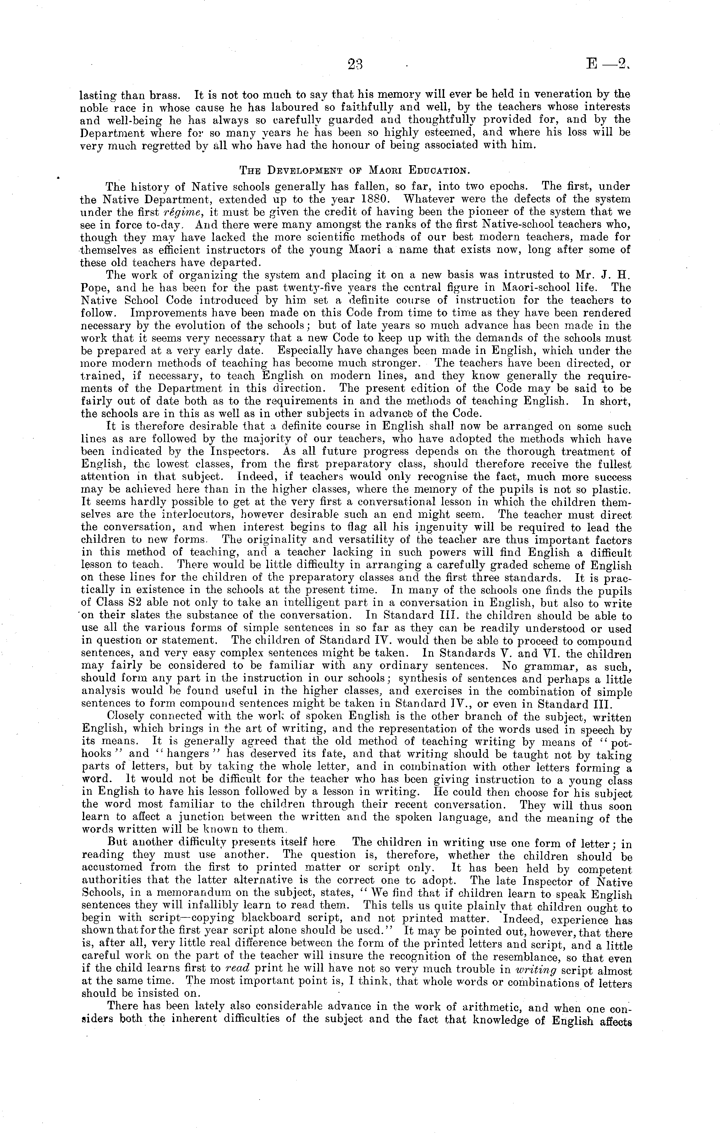 lasting than brass. It is not too much to say that his memory will ever be held in veneration by the noble race in whose cause he has laboured so faithfully and well, by the teachers whose interests and well-being he has always so carefully guarded and thoughtfully provided for, and by the Department where for so many years he has been so highly esteemed, and where his loss will be very much regretted by all who have had the honour of being associated with him. The Development of Maori Education. The history of Native schools generally has fallen, so far, into two epochs. The first, under the Native Department, extended up to the year 1880. Whatever were the defects of the system under the first regime, it must be given the credit of having been the pioneer of the system that we see in force to-day. And there were many amongst the ranks of the first Native-school teachers who, though they may have lacked the more scientific methods of our best modern teachers, made for themselves as efficient instructors of the young Maori a name that exists now, long after some of these old teachers have departed. The work of organizing the system and placing it on a new basis was intrusted to Mr. J. H. Pope, and he has been for the past twenty-five years the central figure in Maori-school life. The Native School Code introduced by him set a definite course of instruction for the teachers to follow. Improvements have been made on this Code from, time to time as they have been rendered necessary by the evolution of the schools; but of late years so much advance has been made in the work that it seems very necessary that a new Code to keep up with the demands of the schools must be prepared at a very early date. Especially have changes been made in English, which under the more modern methods of teaching has become much stronger. The teachers have been directed, or trained, if necessary, to teach English on modern lines, and they know generally the requirements of the Department in this direction. The present edition of the, Code may be said to be fairly out of date both as to the requirements in and the methods of teaching English. In short, the schools are in this as well as in other subjects in advance of the Code. It is therefore desirable that a definite course in English shall now be arranged on some such lines as are followed by the majority of our teachers, who have adopted the methods which have been indicated by the Inspectors. As all future progress depends on the thorough treatment of English, the lowest classes, from the first preparatory class, should therefore receive the fullest attention in that subject. Indeed, if teachers would only recognise the fact, much more success may be achieved here than in the higher classes, where the memory of the pupils is not so plastic. It seems hardly possible to get at the very first a conversational lesson in which the children themselves are the interlocutors, however desirable such an end might seem. The teacher must direct the conversation, and when interest begins to flag all his ingenuity will be required to lead the children to new forms. The originality and versatility of the teacher are thus important factors in this method of teaching, and a teacher lacking in such powers will find English a difficult lesson to teach. There would be little difficulty in arranging a carefully graded scheme of English on these lines for the children of the preparatory classes and the first three standards. It is practically in existence in the schools at the present time. In many of the schools one finds the pupils of Class S2 able not only to take an intelligent part in a conversation in English, but also to write 'on their slates the substance of the conversation. In Standard 111. the children should be able to use all the various forms of simple sentences in so far as they can be readily understood or used in question or statement. The children of Standard IV. would then be able to proceed to compound sentences, and very easy complex sentences might be taken. In Standards V. and VI. the children may fairly be considered to be familiar with any ordinary sentences. No grammar, as such, should form any part in the instruction in our schools; synthesis of sentences and perhaps a little analysis would be found useful in the higher classes, and exercises in the combination of simple sentences to form compound sentences might be taken in Standard IV., or even in Standard 111. Closely connected with the work of spoken English is the other branch of the subject, written English, which brings in the art of writing, and the representation of the words used in speech by its means. It is generally agreed that the old method of teaching writing by means of "pothooks" and "hangers" has deserved its fate, and that writing should be taught not by taking parts of letters, but by taking the whole letter, and in combination with other letters forming a word. It would not be difficult for the teacher who has been giving instruction to a young class in English to have his lesson followed by a lesson in writing. He could then choose for his subject the word most familiar to the children through their recent conversation. They will thus soon learn to affect a junction between the written and the spoken language, and the meaning of the words written will be known to them. But another difficulty presents itself here The children in writing use one form of letter ;in reading they must use another. The question is, therefore, whether the children should be accustomed from the first to printed matter or script only. It has been held by competent authorities that the latter alternative is the correct one to adopt. The late Inspector of Native Schools, in a memorandum on the subject, states, " We find that if children learn to speak English sentences they will infallibly learn to read. them. This tells us quite plainly that children ought to begin with script—copying blackboard script, an