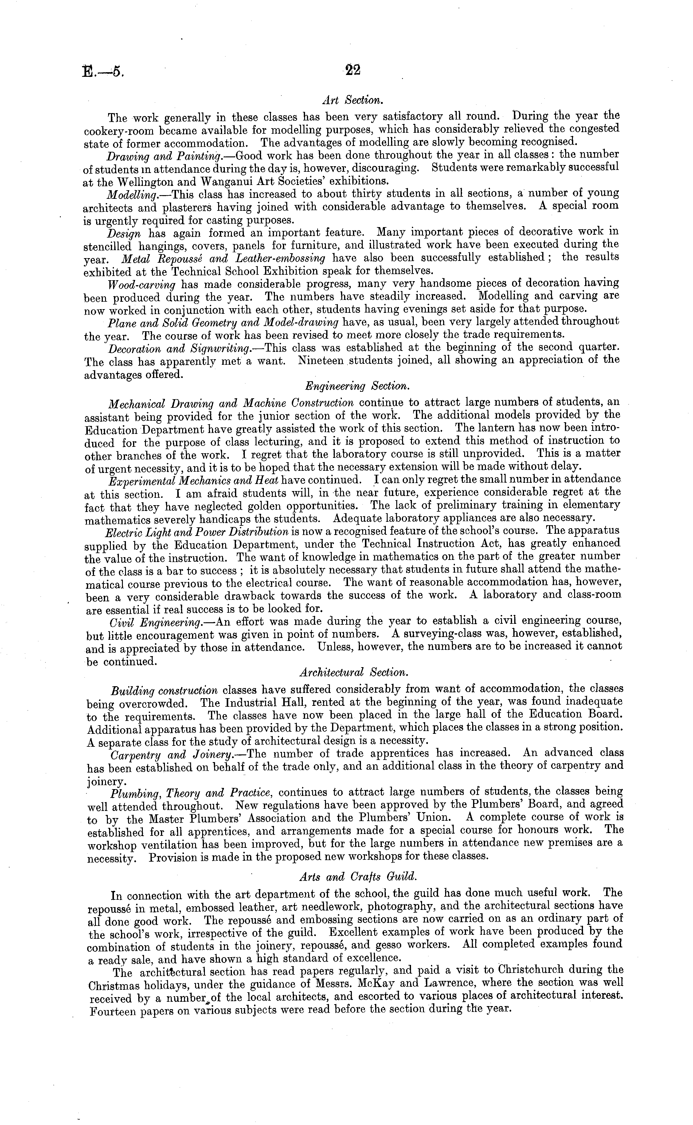 Art Section. The work generally in these classes has been very satisfactory all round. During the year the cookery-room became available for modelling purposes, which has considerably relieved the congested state of former accommodation. The advantages of modelling are slowly becoming recognised. Drawing and Painting. —Good work has been done throughout the year in all classes : the number of students m attendance during the day is, however, discouraging. Students were remarkably successful at the Wellington and Wanganui Art Societies' exhibitions. Modelling.— This class has increased to about thirty students in all sections, a number of young architects and plasterers having joined with considerable advantage to themselves. A special room is urgently required for casting purposes. Design has again formed an important feature. Many important pieces of decorative work in stencilled hangings, covers, panels for furniture, and illustrated work have been executed during the year. Metal Repousse and Leather-embossing have also been successfully established ; the results exhibited at the Technical School Exhibition speak for themselves. Wood-carving has made considerable progress, many very handsome pieces of decoration having been produced during the year. The numbers have steadily increased. Modelling and carving are now worked in conjunction with each other, students having evenings set aside for that purpose. Plane and Solid Geometry and Model-drawing have, as usual, been very largely attended throughout the year. The course of work has been revised to meet more closely the trade requirements. Decoration and Signwriting. —This class was established at the beginning of the second quarter. The class has apparently met a want. Nineteen students joined, all showing an appreciation of the advantages offered. Engineering Section. Mechanical Drawing and Machine Construction continue to attract large numbers of students, an assistant being provided for the junior section of the work. The additional models provided by the Education Department have greatly assisted the work of this section. The lantern has now been introduced for the purpose of class lecturing, and it is proposed to extend this method of instruction to other branches of the work. I regret that the laboratory course is still unprovided. This is a matter of urgent necessity, and it is to be hoped that the necessary extension will be made without delay. Experimental Mechanics and Heat have continued. I can only regret the small number in attendance at this section. I am afraid students will, in the near future, experience considerable regret at the fact that they have neglected golden opportunities. The lack of preliminary training in elementary mathematics severely handicaps the students. Adequate laboratory appliances are also necessary. Electric Light and Power Distribution is now a recognised feature of the school's course. The apparatus supplied by the Education Department, under the Technical Instruction Act, has greatly enhanced the value of the instruction. The want of knowledge in mathematics on the part of the greater number of the class is a bar to success ; it is absolutely necessary that students in future shall attend the mathematical course previous to the electrical course. The want of reasonable accommodation has, however, been a very considerable drawback towards the success of the work. A laboratory and class-room are essential if real success is to be looked for. Civil Engineering. —An effort was made during the year to establish a civil engineering course, but little encouragement was given in point of numbers. A surveying-class was, however, established, and is appreciated by those in attendance. Unless, however, the numbers are to be increased it cannot be continued. Architectural Section. Building construction classes have suffered considerably from want of accommodation, the classes being overcrowded. The Industrial Hall, rented at the beginning of the year, was found inadequate to the requirements. The classes have now been placed in the large hall of the Education Board. Additional apparatus has been provided by the Department, which places the classes in a strong position. A separate class for the study of architectural design is a necessity. Carpentry and Joinery. —The number of trade apprentices has increased. An advanced class has been established on behalf of the trade only, and an additional class in the theory of carpentry and joinery. Plumbing, Theory and Practice, continues to attract large numbers of students, the classes being well attended throughout. New regulations have been approved by the Plumbers' Board, and agreed to by the Master Plumbers' Association and the Plumbers' Union. A complete course of work is established for all apprentices, and arrangements made for a special course for honours work. The workshop ventilation has been improved, but for the large numbers in attendance new premises are a necessity. Provision is made in the proposed new workshops for these classes. Arts and Crafts Guild. In connection with the art department of the school, the guild has done much useful work. The repousse in metal, embossed leather, art needlework, photography, and the architectural sections have all done good work. The repousse and embossing sections are now carried on as an ordinary part of the school's work, irrespective of the guild. Excellent examples of work have been produced by the combination of students in the joinery, repousse, and gesso workers. All completed examples found a ready sale, and have shown a high standard of excellence. The architectural section has read papers regularly, and paid a visit to Christchurch during the Christmas holidays, under the guidance of Messrs. McKay and Lawrence, where the section was well received by a the local architects, and escorted to various places of architectural interest. Fourteen papers on various subjects were read before the secti